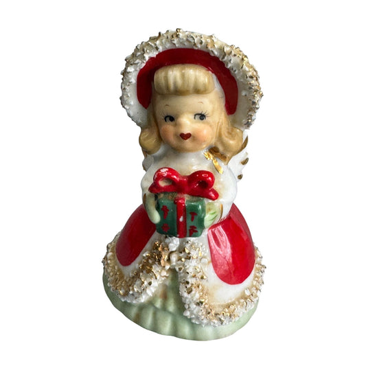 Vintage Lefton Christmas Angel Girl Bell Spaghetti Trim Gold Accents 4 1/2"