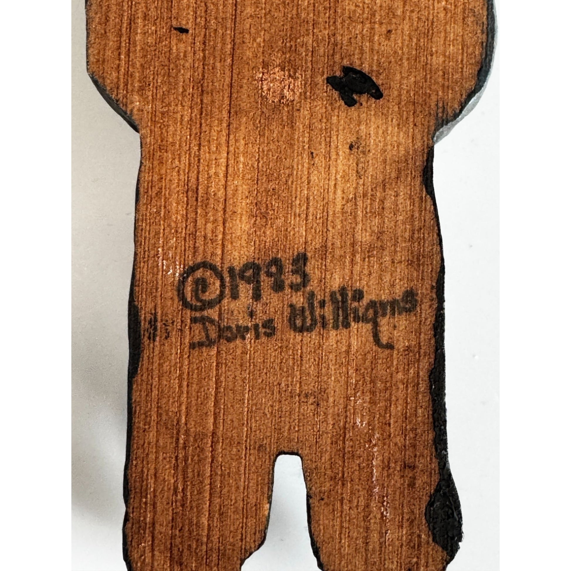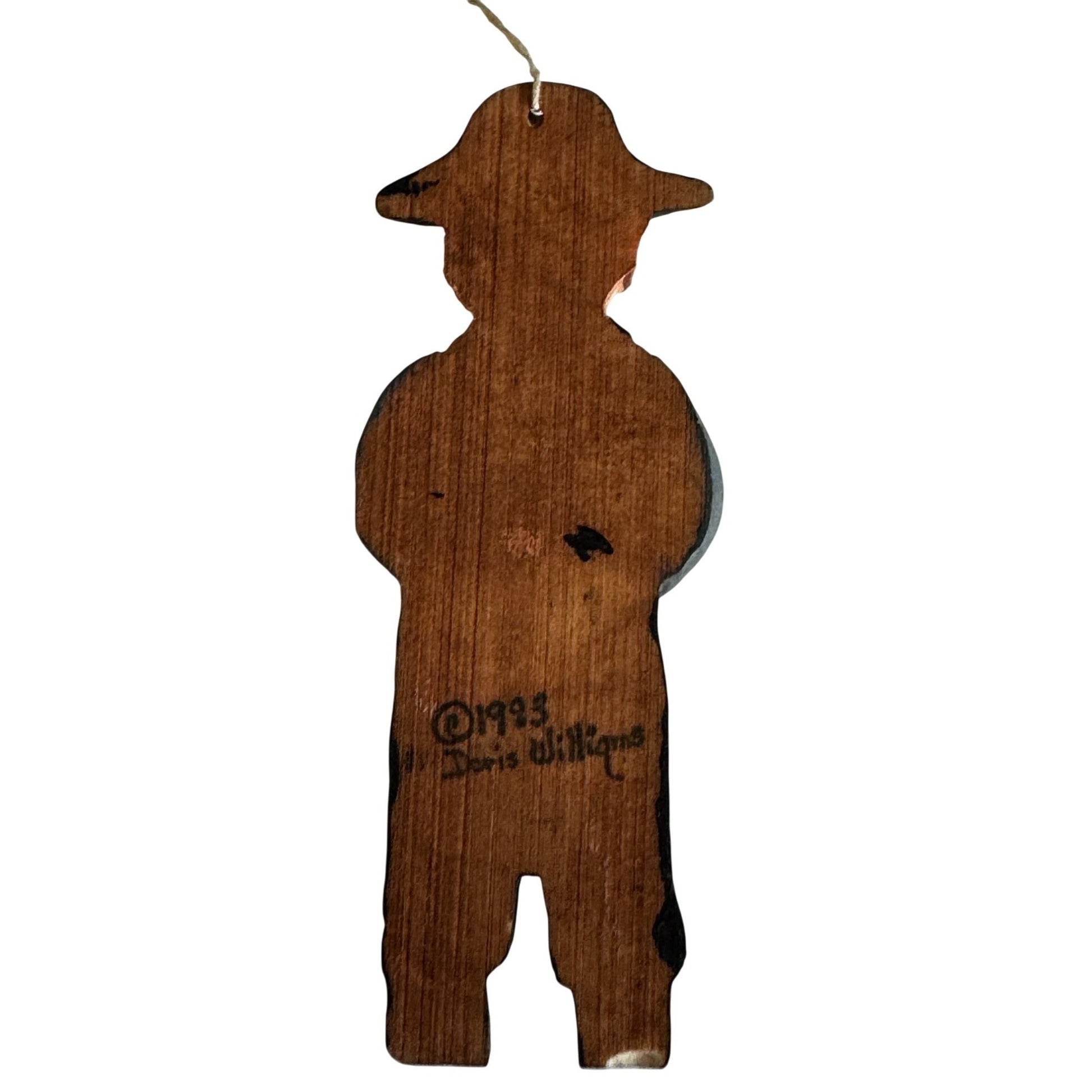 Charming hand-painted folk art wood ornament signed and dated 1993 by Doris Williams. The piece depicts a pilgrim figure holding a basket of apples or bread, crafted from solid wood with a rustic, country finish. A delightful example of 1990s American folk art — perfect for Thanksgiving decorating or primitive farmhouse displays.