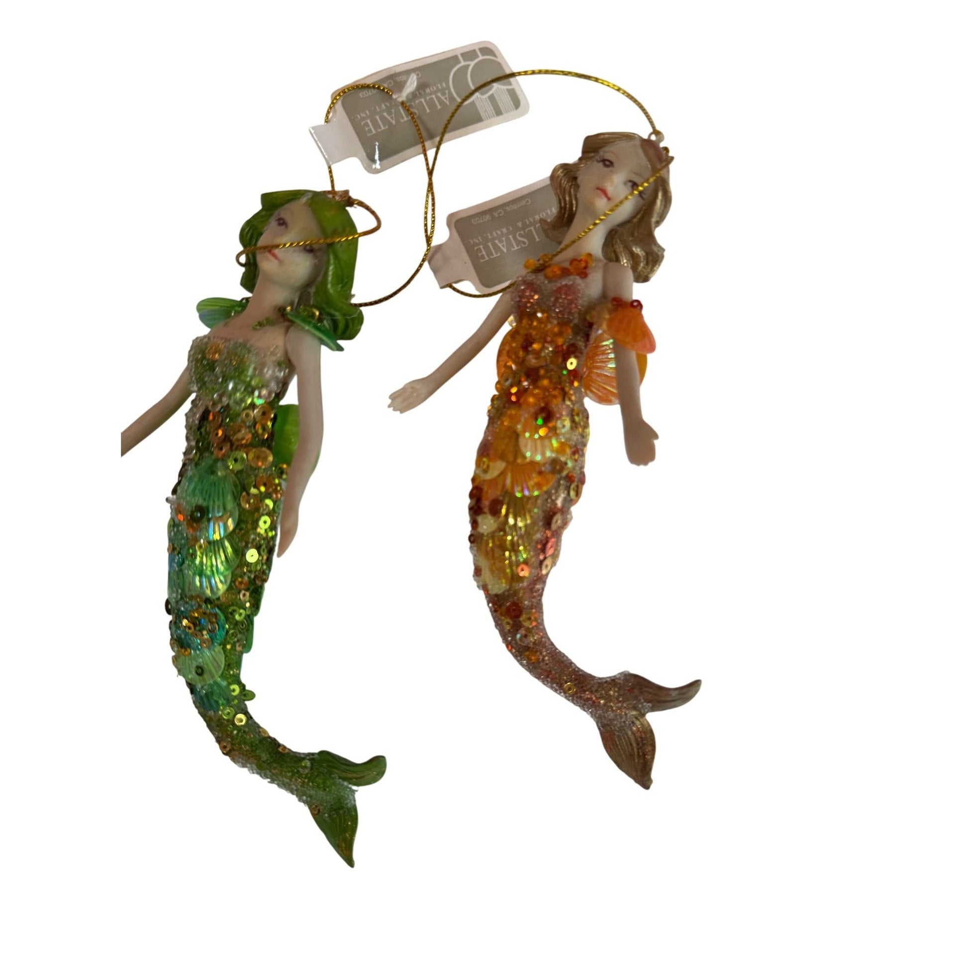 Beautiful pair of Allstate Holiday mermaid ornaments, each featuring a shimmering sequined tail and iridescent shell details. One mermaid has flowing blonde hair with a warm orange and gold palette, while the other has vivid green hair with cool turquoise and lime tones. Both are intricately hand-decorated with glitter, sequins, and beaded accents, showcasing the brand’s high-quality craftsmanship. These striking ocean-inspired ornaments are perfect for coastal Christmas décor or mermaid collectors.