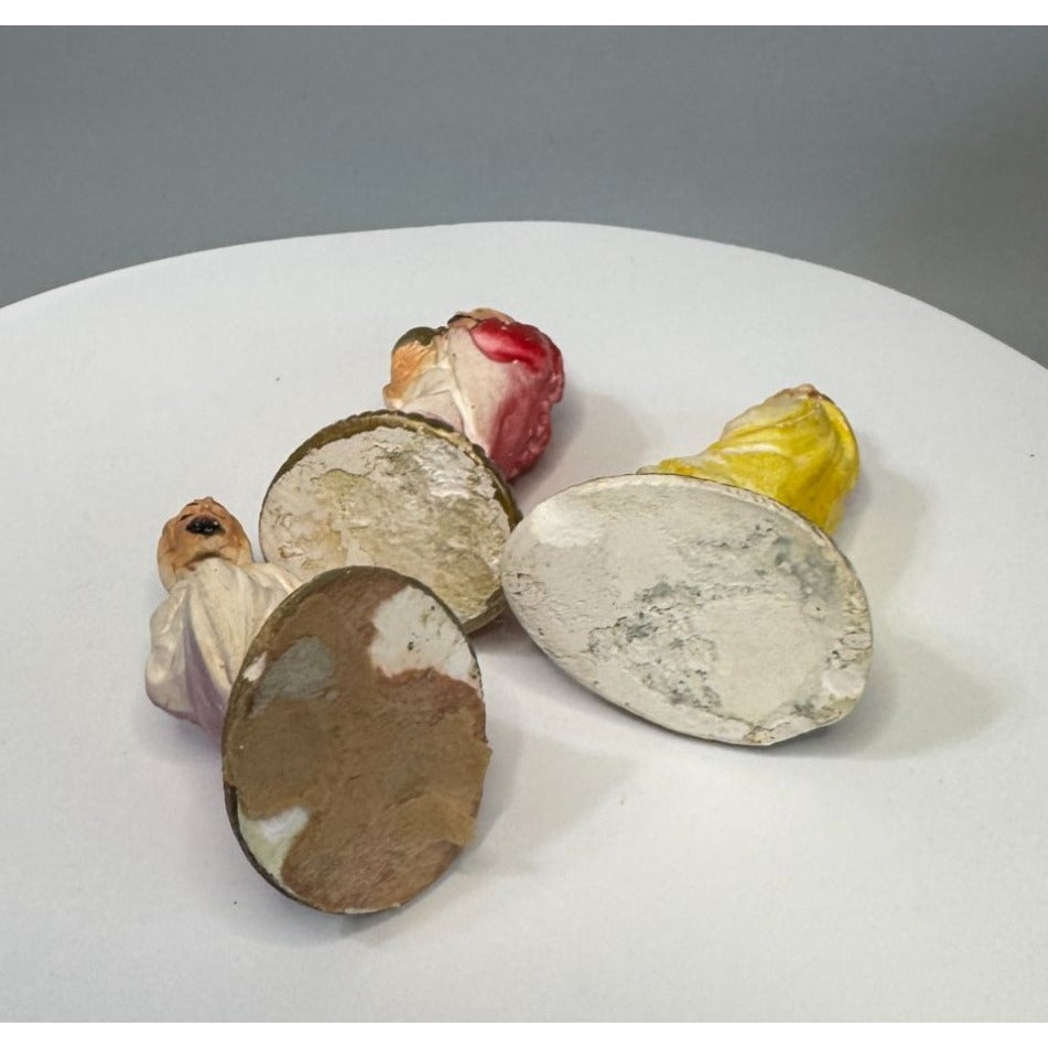 This antique chalkware nativity lot includes three classic pieces: Joseph, King Melchior, and a Shepherd. Dating to approximately c1930, these have that wonderful early creche look with aged paint and old-world character—perfect for completing a vintage nativity or putz display. Sized for a 4" scale set.