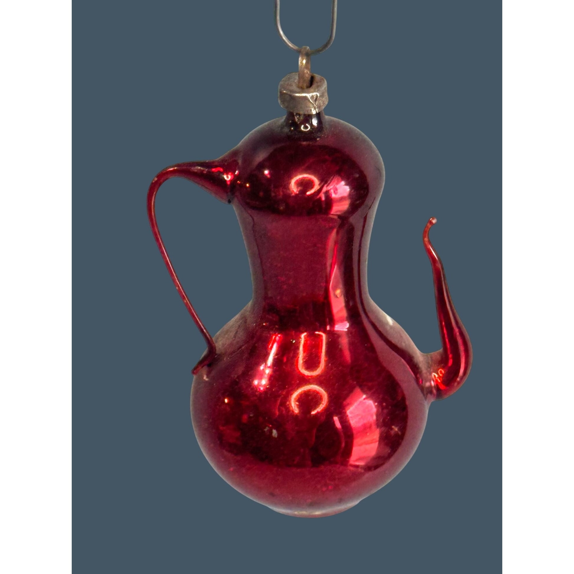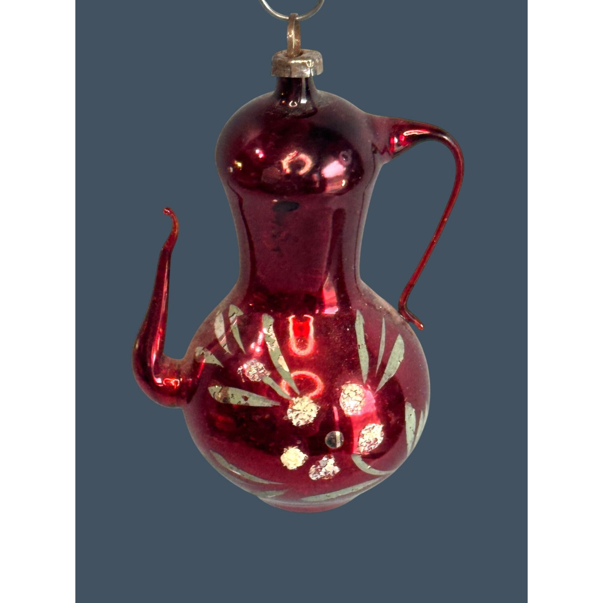 Beautiful vintage blown-glass Christmas ornament shaped like a little pitcher/ewer, done in a deep ruby-red shiny finish with applied glass handle and spout. Finished with hand-painted floral details (with a mica/glitter look) and a classic metal cap with hanging loop—such a fun, uncommon shape for a vintage ornament collection.