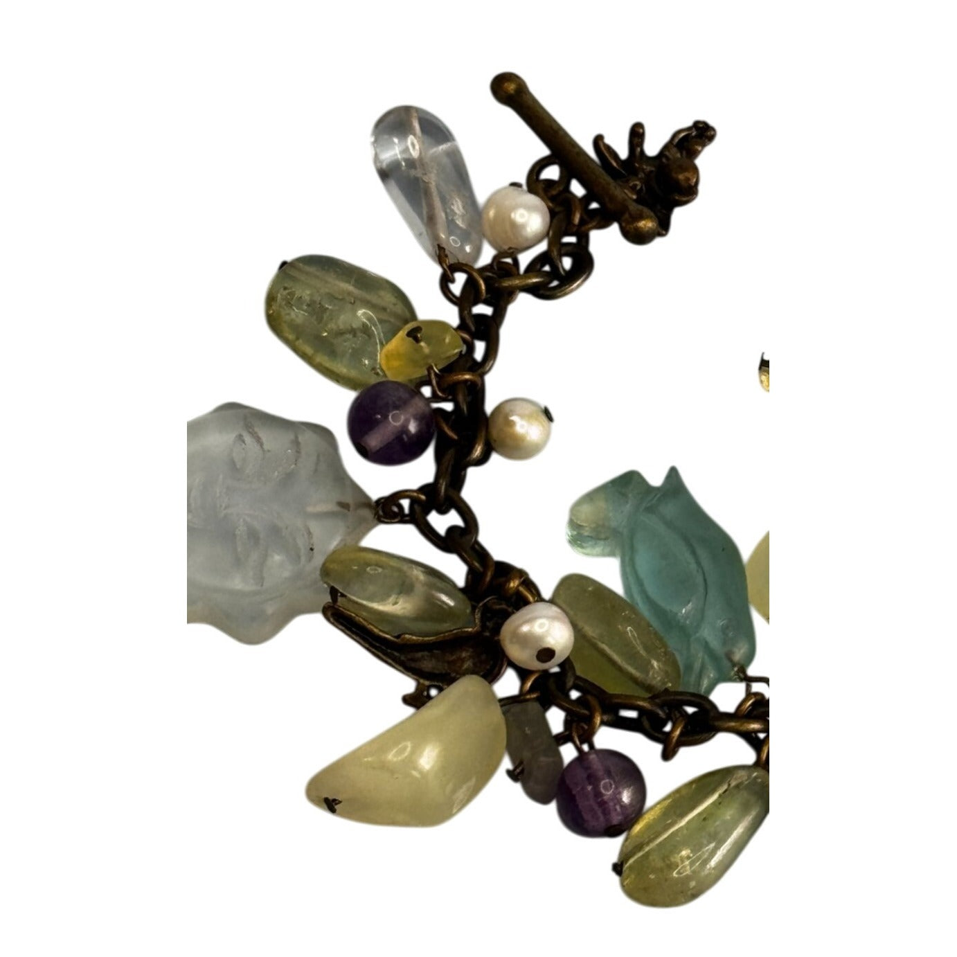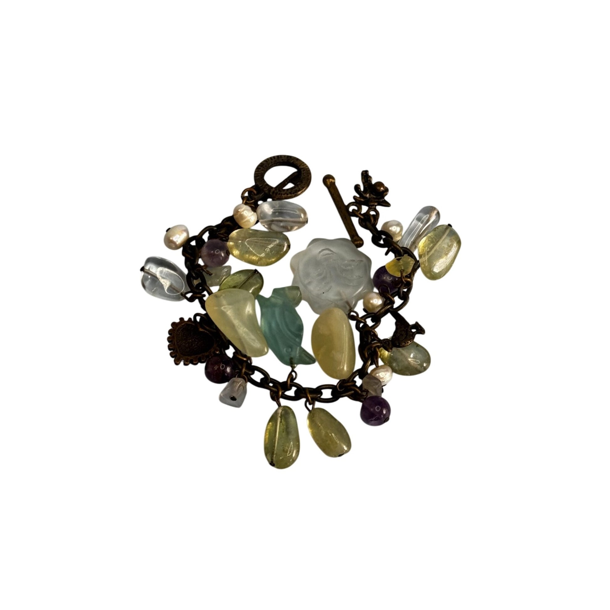 Whimsical charm bracelet with mixed quartz and glass beads in soft yellow, green, purple, and clear tones on antiqued goldtone chain. Features playful dangles and a textured toggle clasp.