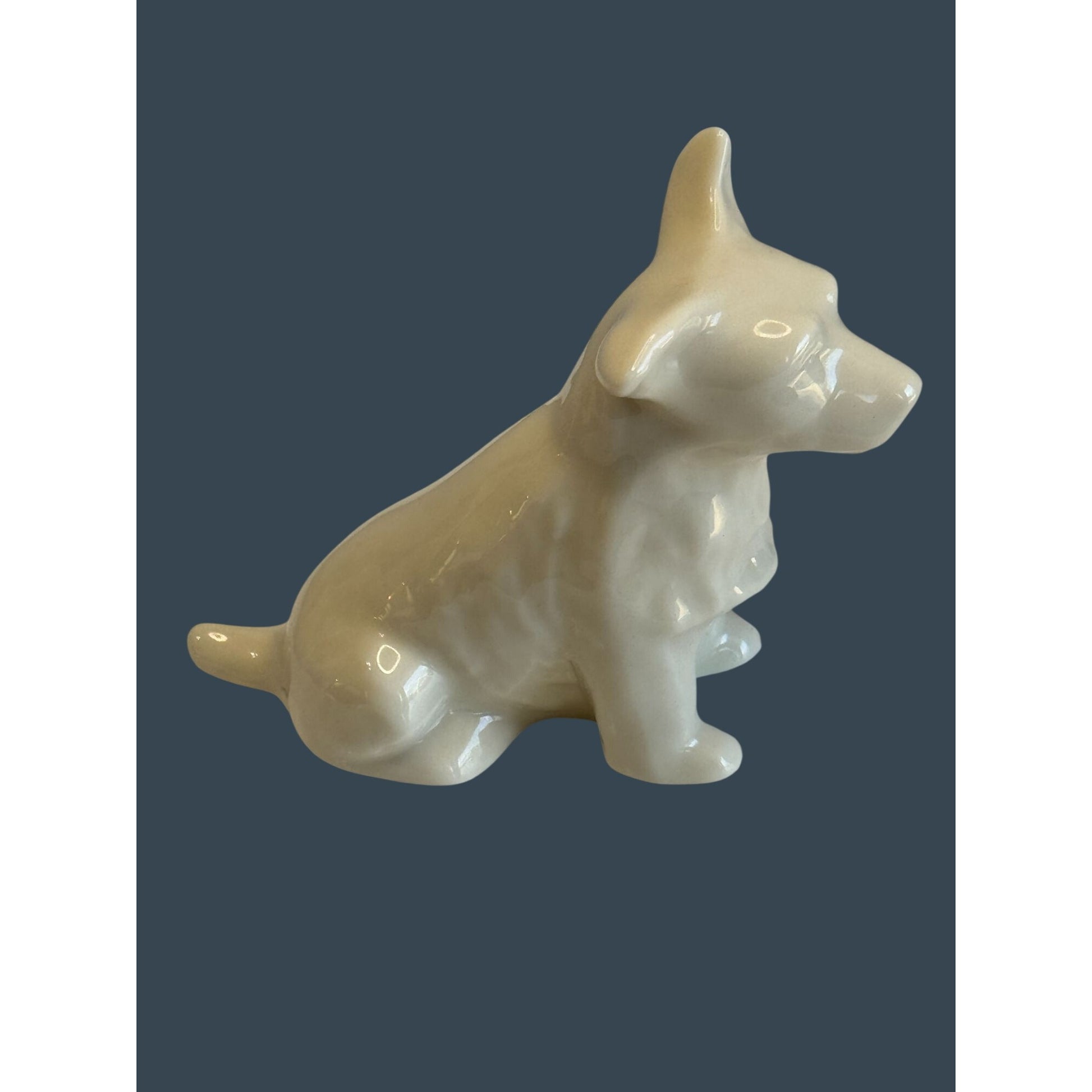 This charming little Belleek dog looks like a Scottish Terrier (Scottie) with its alert pointed ears, longer tapered muzzle, and sturdy sitting pose. The body has that classic “Scottie” silhouette—compact chest, rounded back, and the tail extended straight behind—finished in Belleek’s soft creamy ivory glaze that reflects beautifully in the light. The Belleek mark is on the bottom (see photos), making it a great collectible for Belleek lovers, dog figurine collectors, or anyone who adores Scotties.