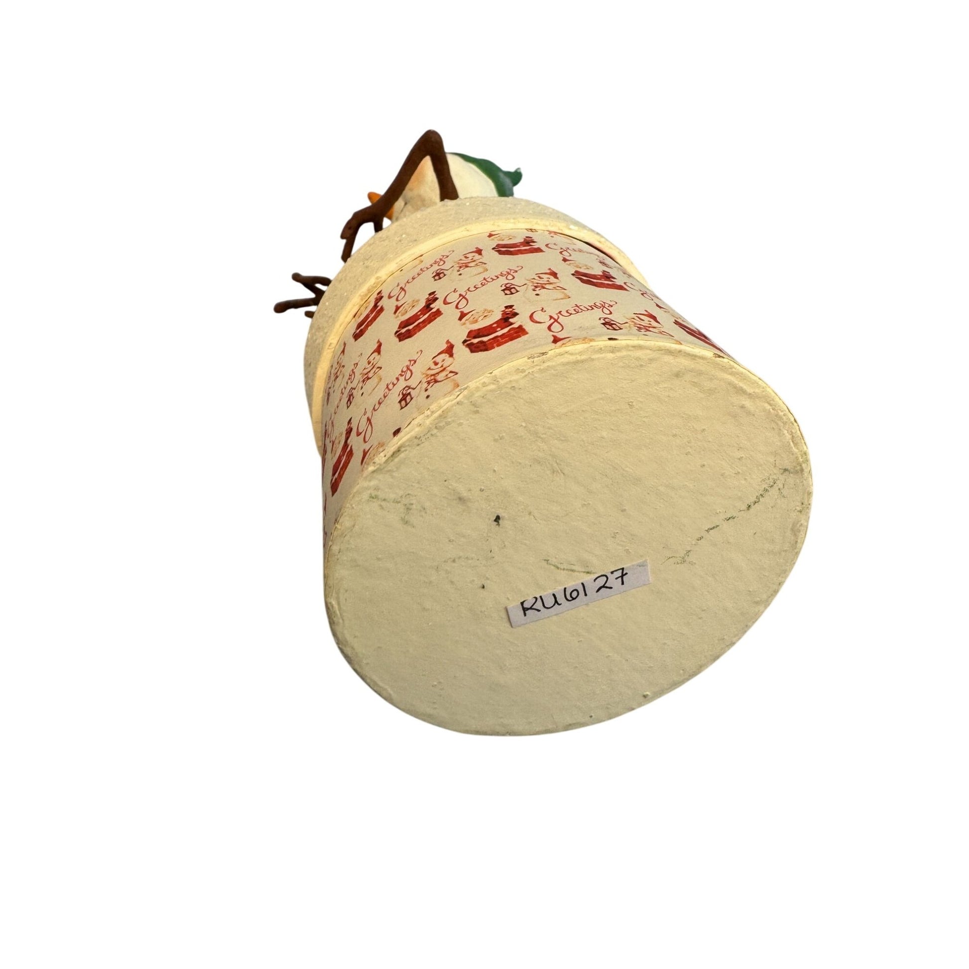 Charming Bethany Lowe snowman candy container featuring a cheerful snowman with twig arms, a carrot nose, and a green hat dusted with glitter. The snowman sits atop a vintage-style paper box decorated with red Santa and “Season’s Greetings” graphics. The base opens to reveal hidden candy storage, a nostalgic nod to early 20th-century holiday collectibles. Sticker on the bottom shows a designer’s item code (RU60127), confirming it as part of a Bethany Lowe designer collection. I these items were part of a Bethany Lowe designer's personal collection and were never sold, which is why there is only their designer coded label and not a Bethany Lowe label. One of a kind.