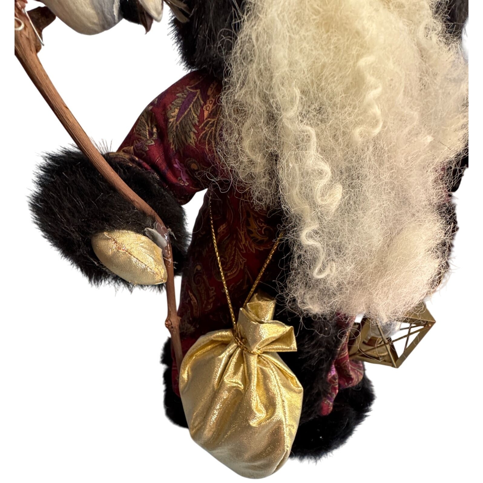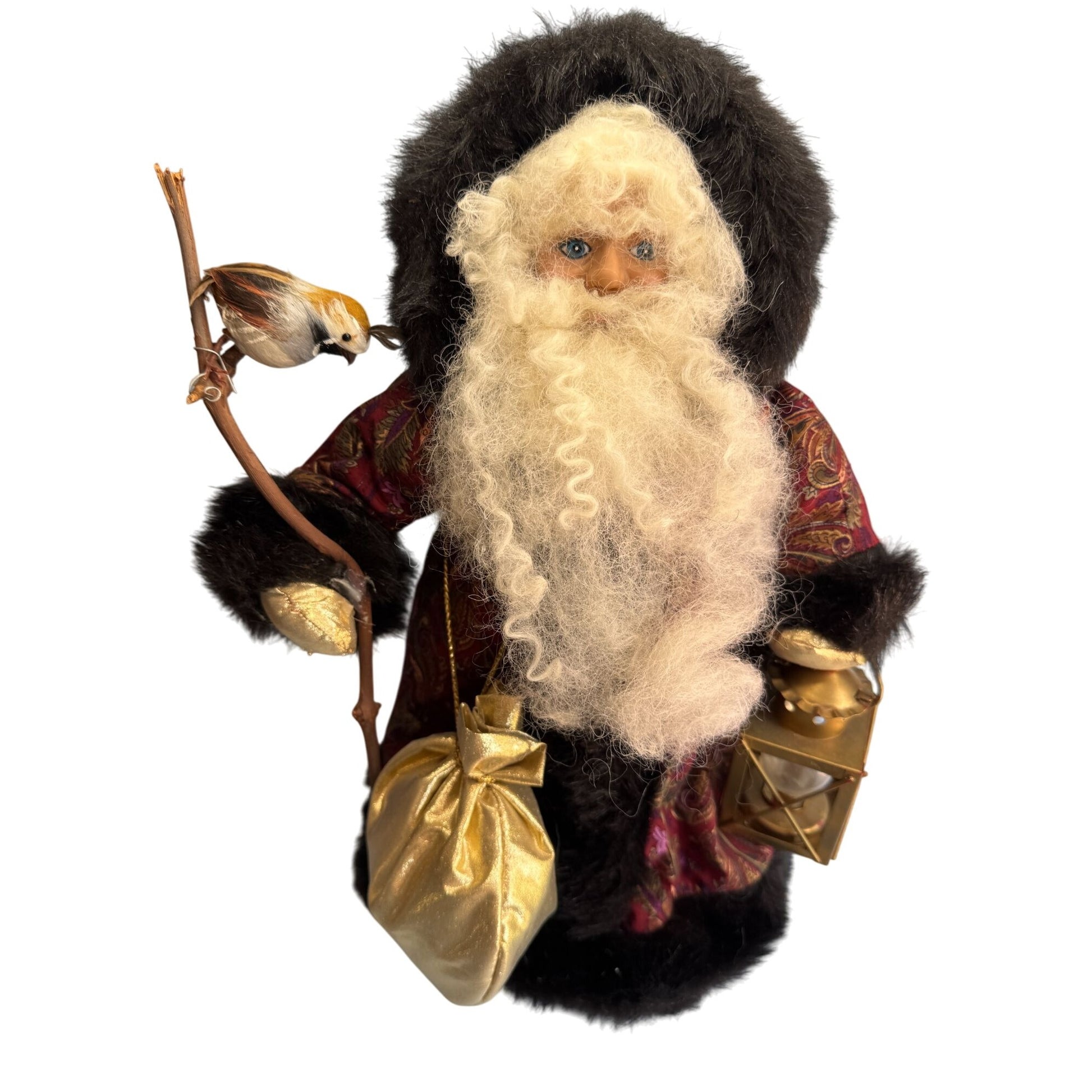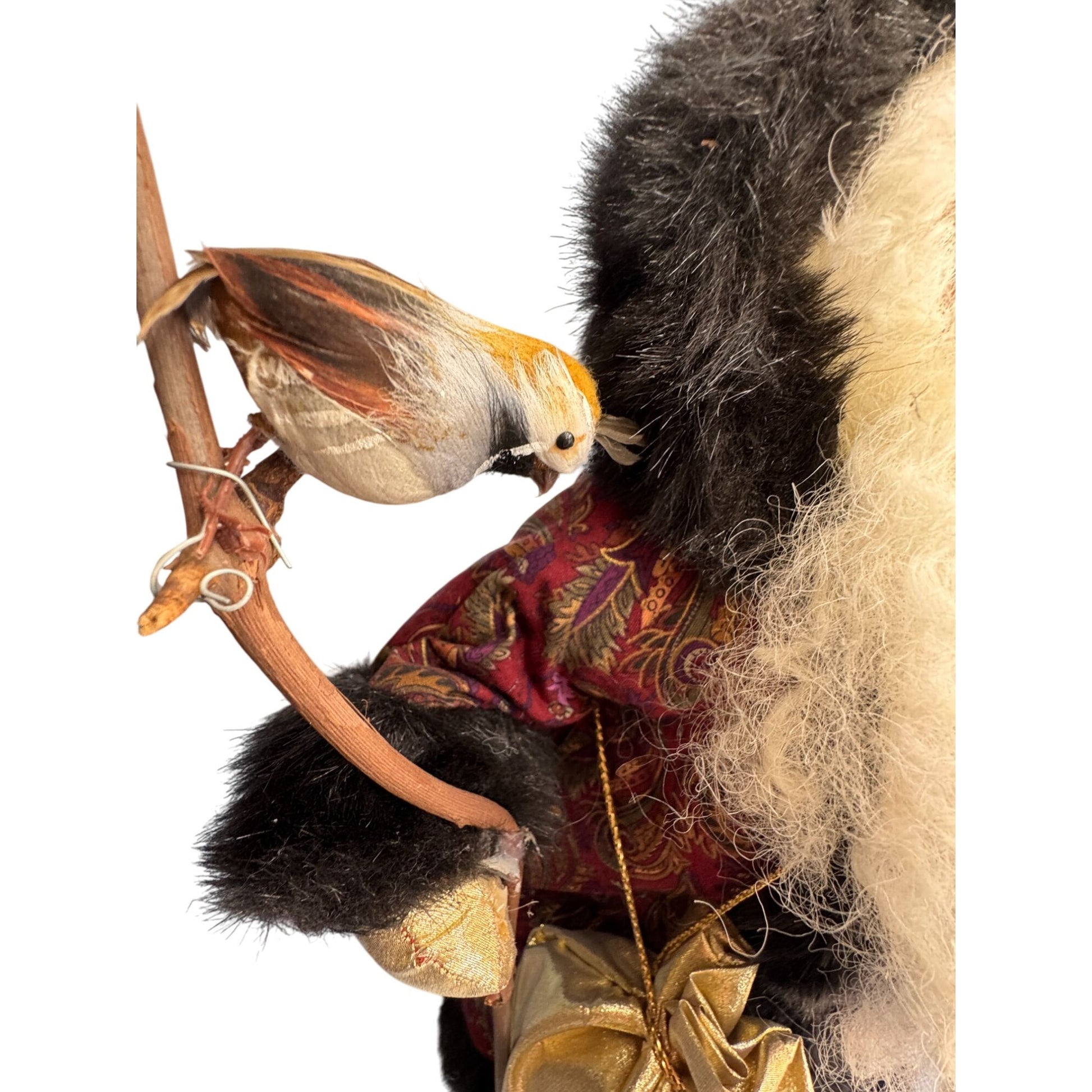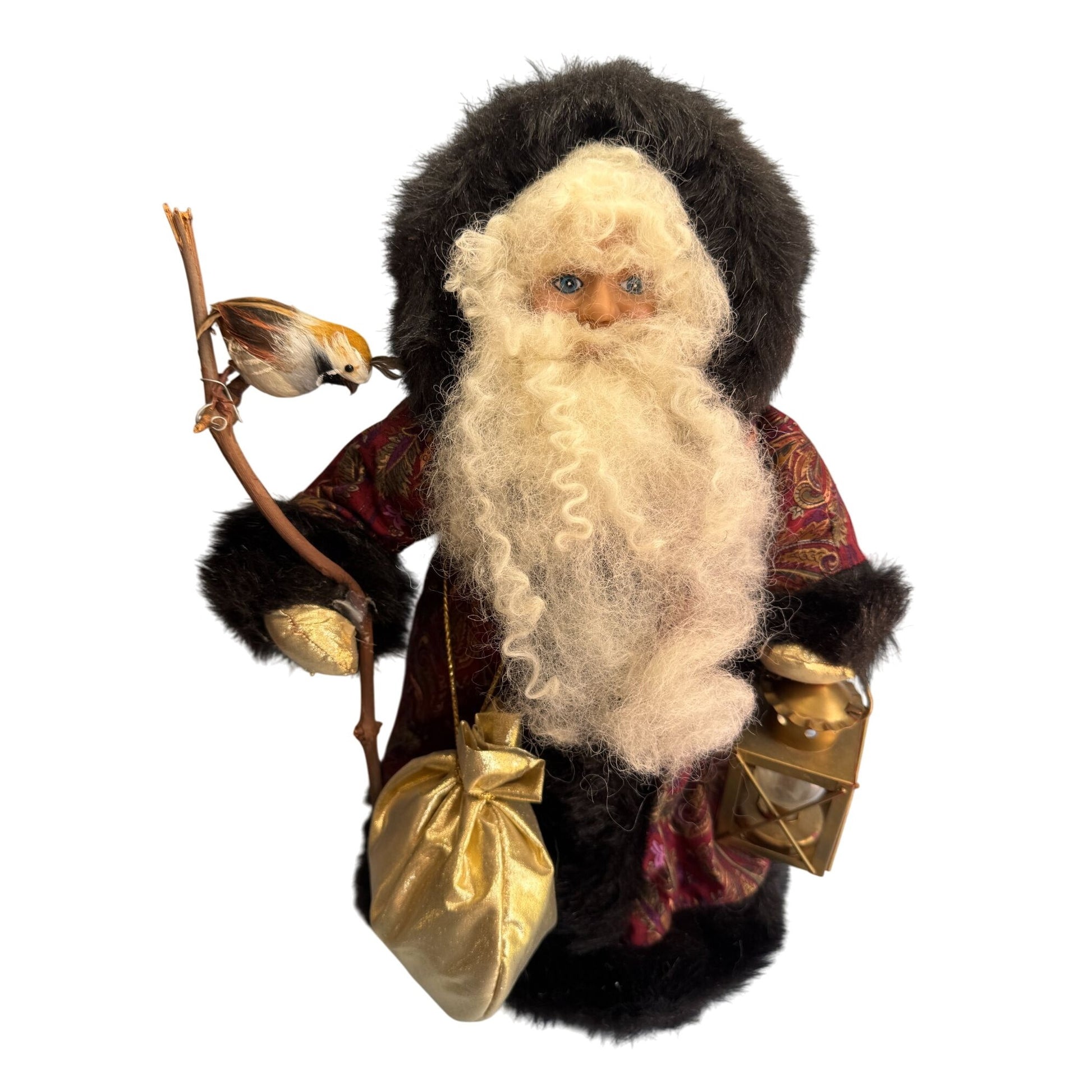 This handmade Santa Claus doll by Betty Boedt/Boldt, dated 1993, features exquisite craftsmanship and intricate detailing. It showcases a black faux fur hood, a red paisley coat, a sculpted lantern, and a gold gift pouch. The piece also includes a perching bird for added character. Mounted on a sturdy wooden base, this unique collectible carries the artist's signature and production year underneath. A charming addition to seasonal decor or a collector's display.
