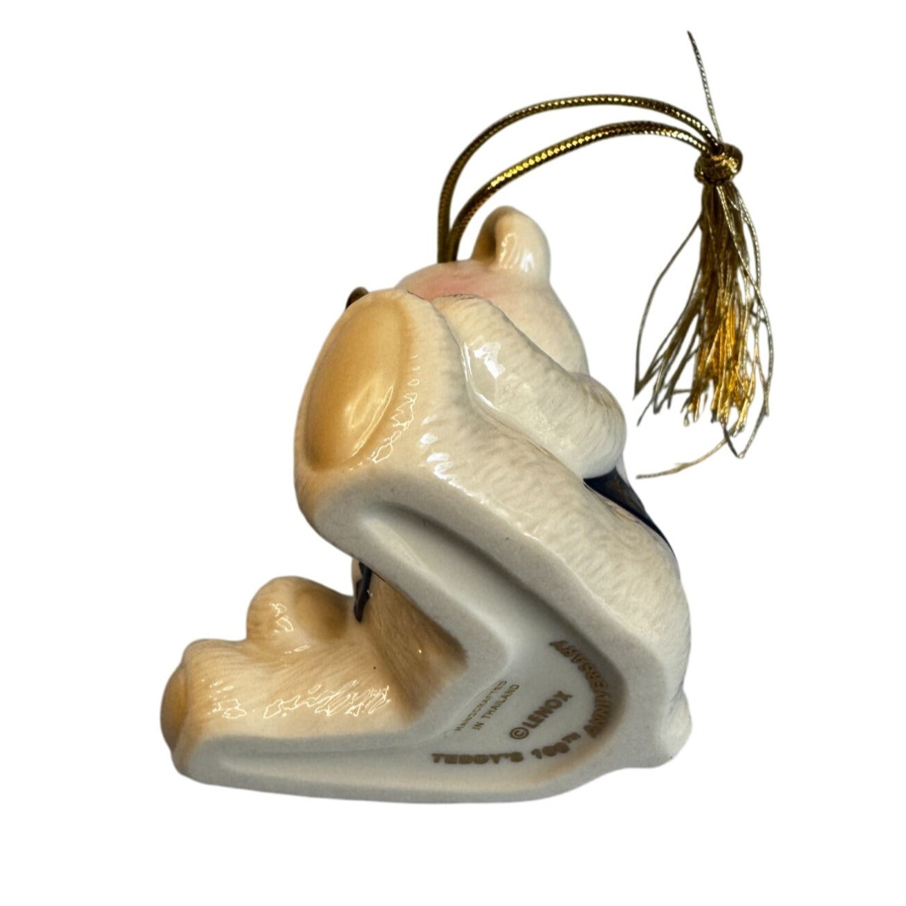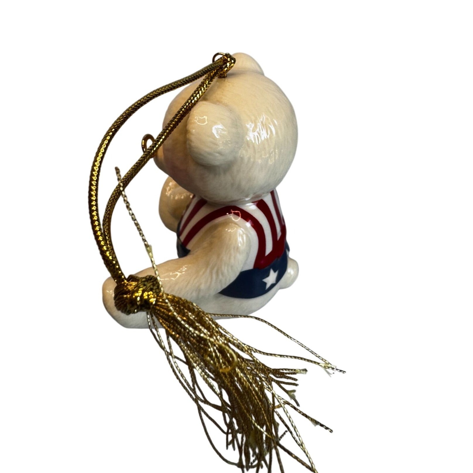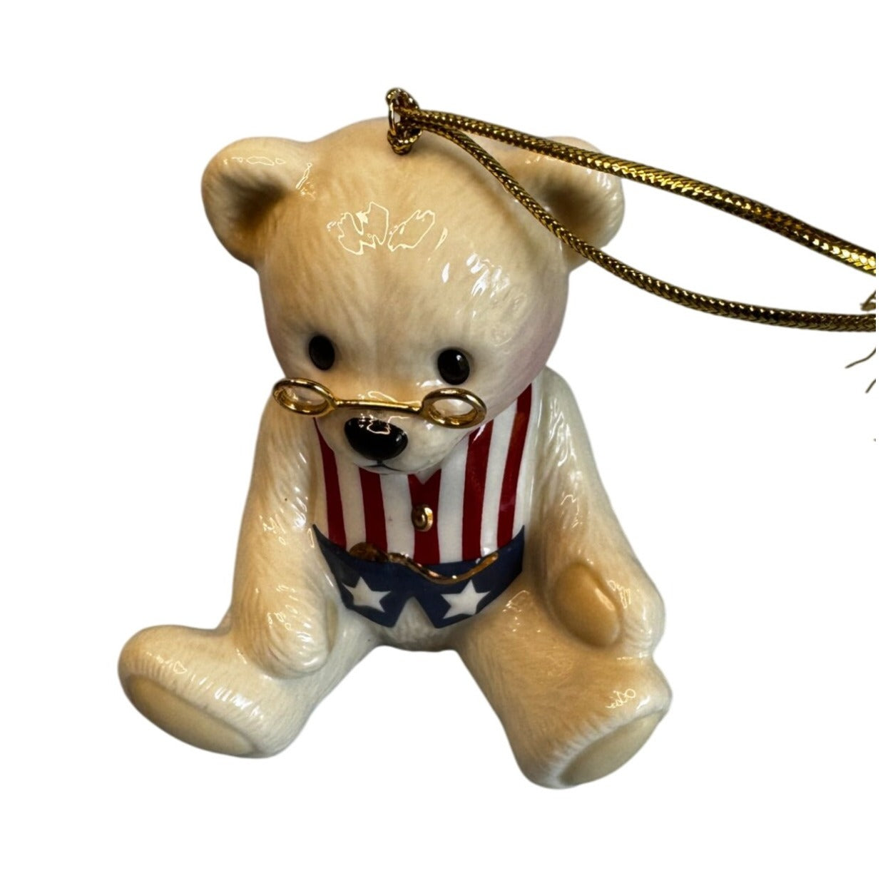 Adorable collectible Brandy’s Teddy ’96 ceramic ornament featuring a cream-colored bear wearing a red, white, and blue patriotic vest adorned with stars and stripes. The bear has gold wire glasses, a glossy finish, and a gold hanging cord with tassel. Comes in its original Brandy’s of Naperville, Illinois presentation box with tissue paper.
