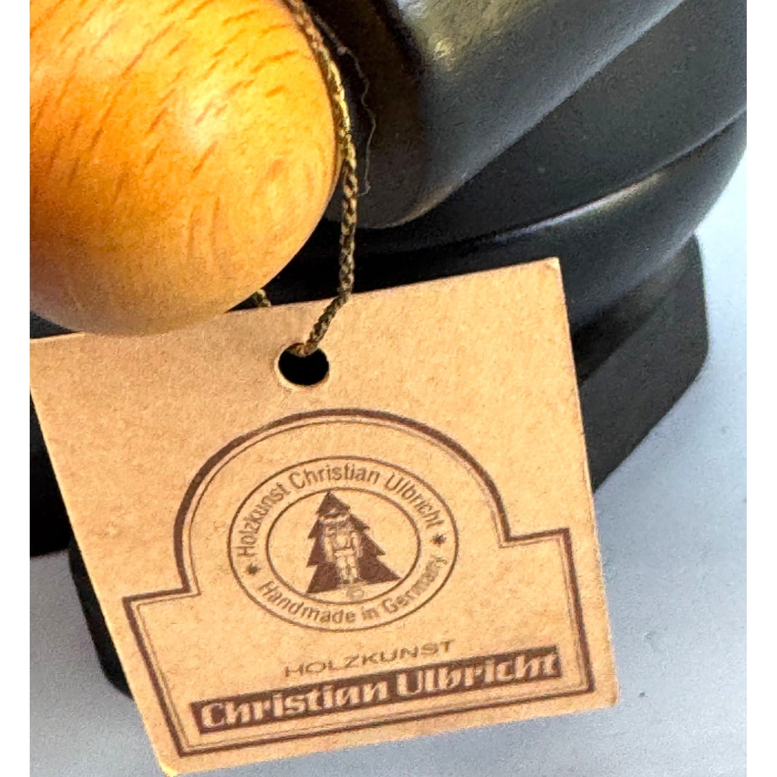 Vintage Christian Ulbricht German smoker incense burner featuring a chimney sweep in classic black suit with tall top hat, bushy white sideburns, and large mustache. He carries a traditional brush and pipe, with the hollow body designed to hold incense cones — smoke exits through his mouth for a charming effect. Comes with the original Ulbricht authenticity tag, showing it was handcrafted in Germany’s Erzgebirge region. Chimney sweeps are considered lucky symbols, making this a wonderful gift or collectible Christmas décor piece.