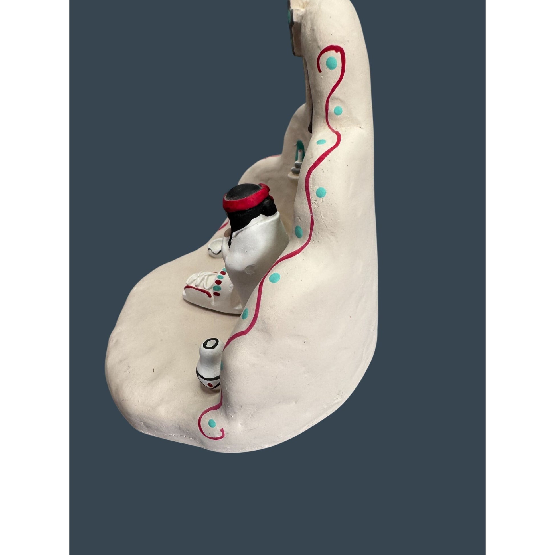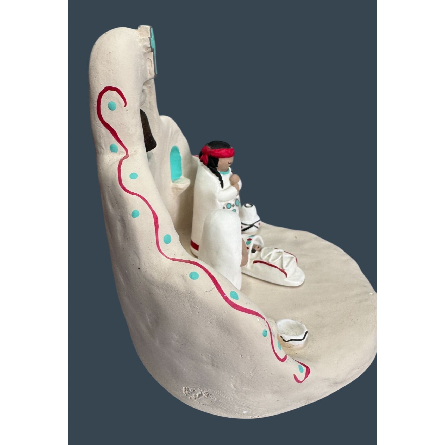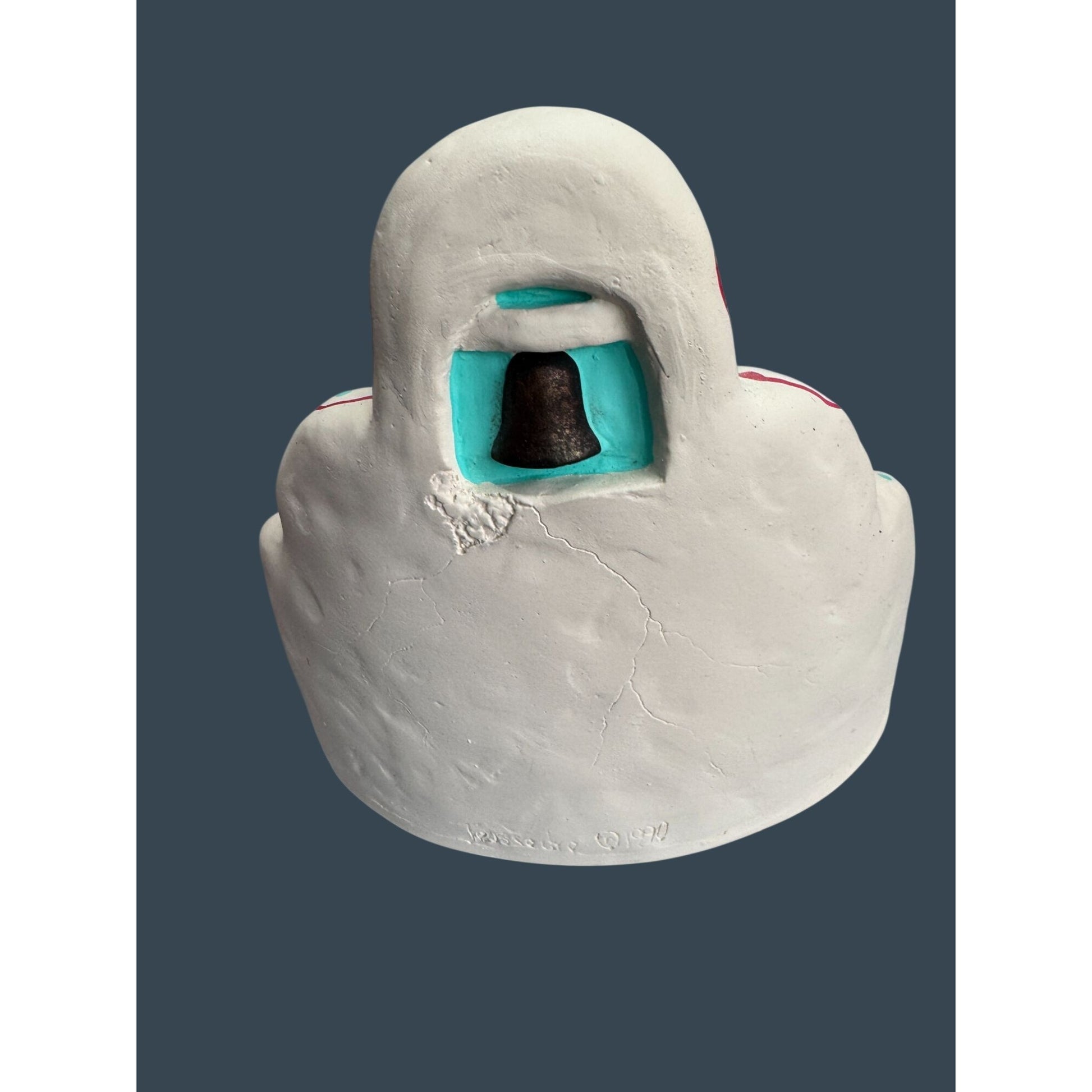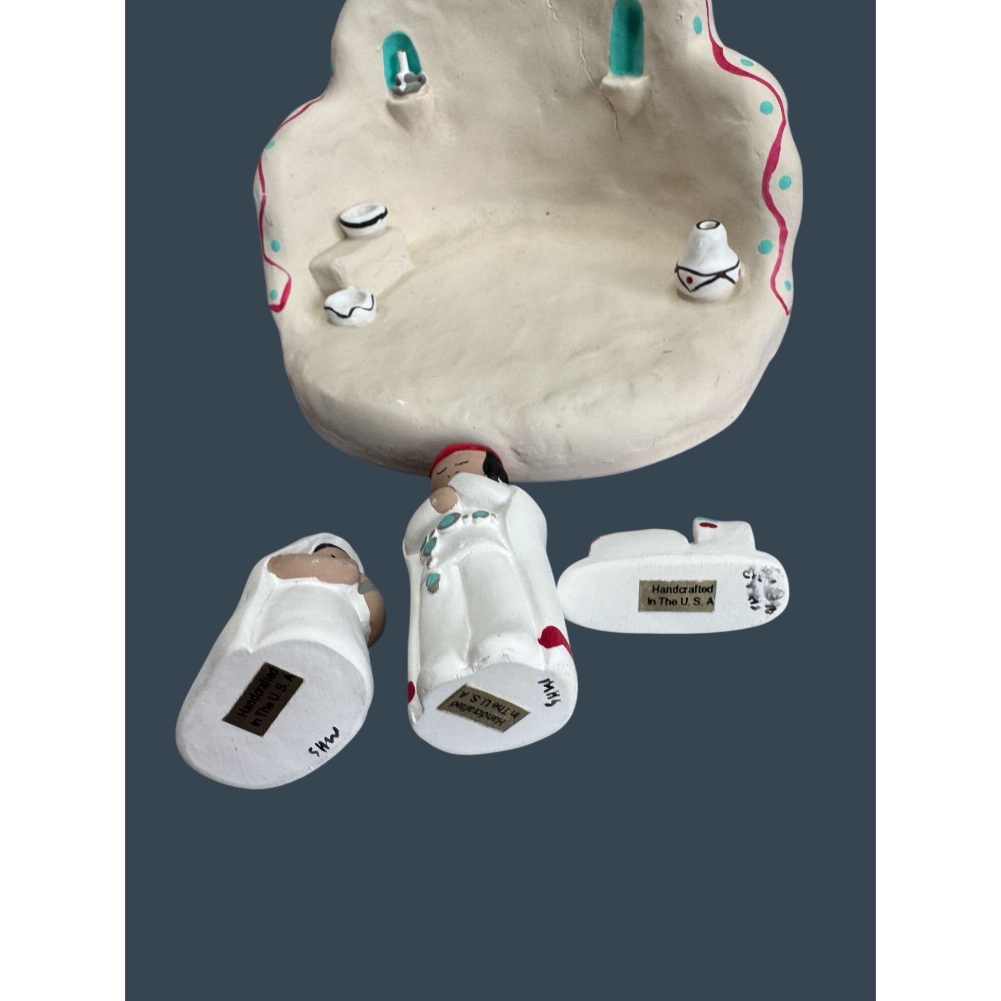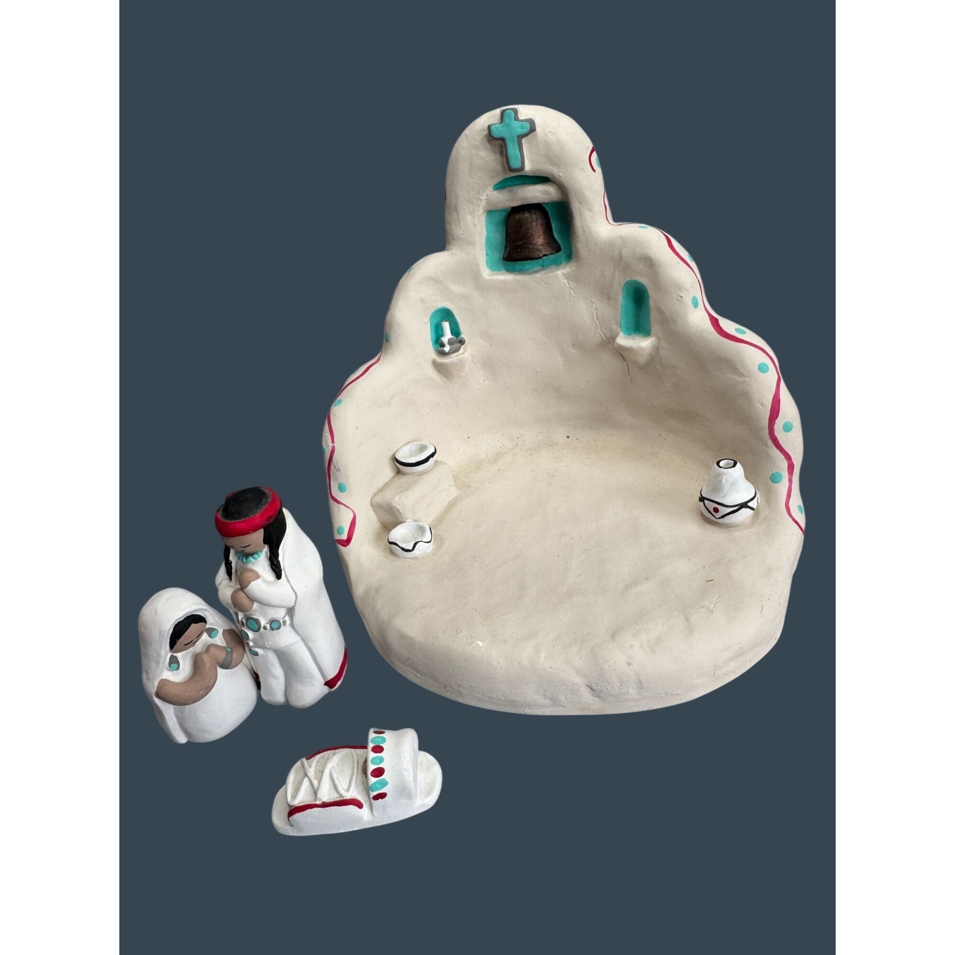 Handcrafted Southwestern nativity set by folk artist Cleo Teissedre, signed and dated 1990. The piece features an adobe-style church with bell tower and cross along with Mary, Joseph, and baby Jesus figures. Decorated with traditional turquoise and red accents inspired by Pueblo architecture and New Mexico folk art, this signed studio piece makes a charming Christmas display or collectible Southwestern nativity.