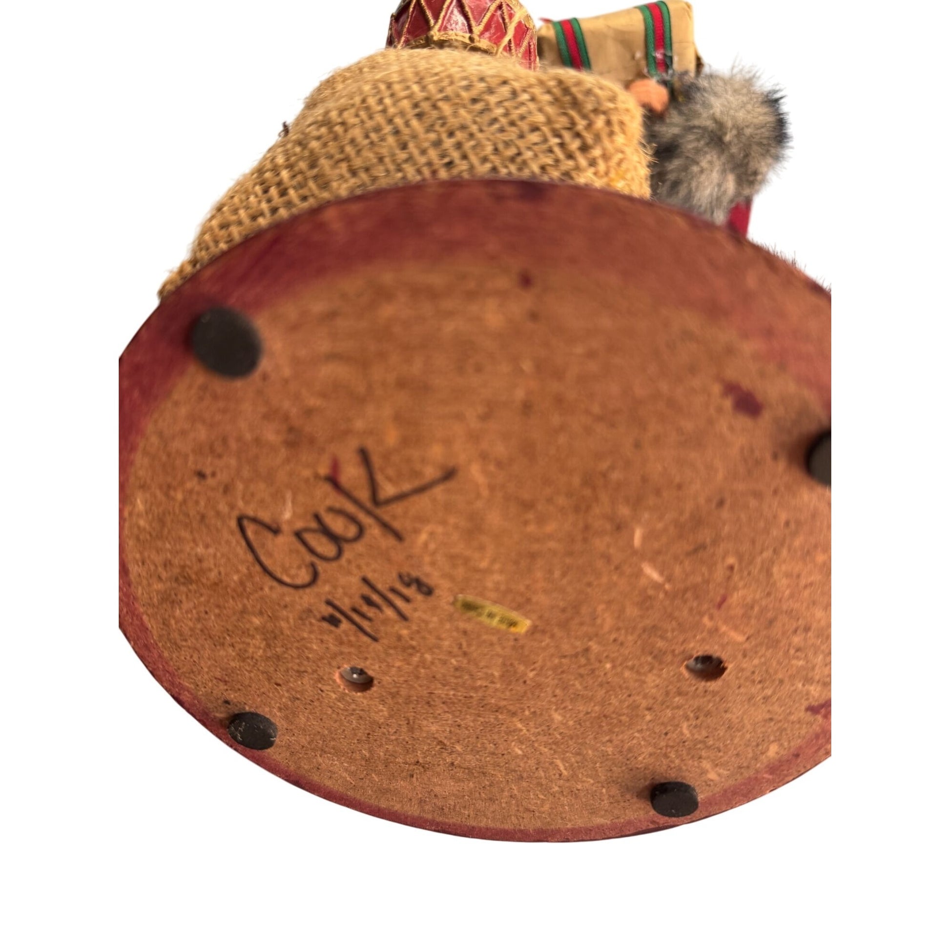 Handcrafted folk art Santa Claus figurine signed Cook and dated 2018. This artisan Santa stands about 14″ tall on a wooden base and features a burgundy felt coat with faux fur trim, a brown felt hat with pinecones and berries, a wool beard, and a hand-painted face with rosy cheeks.