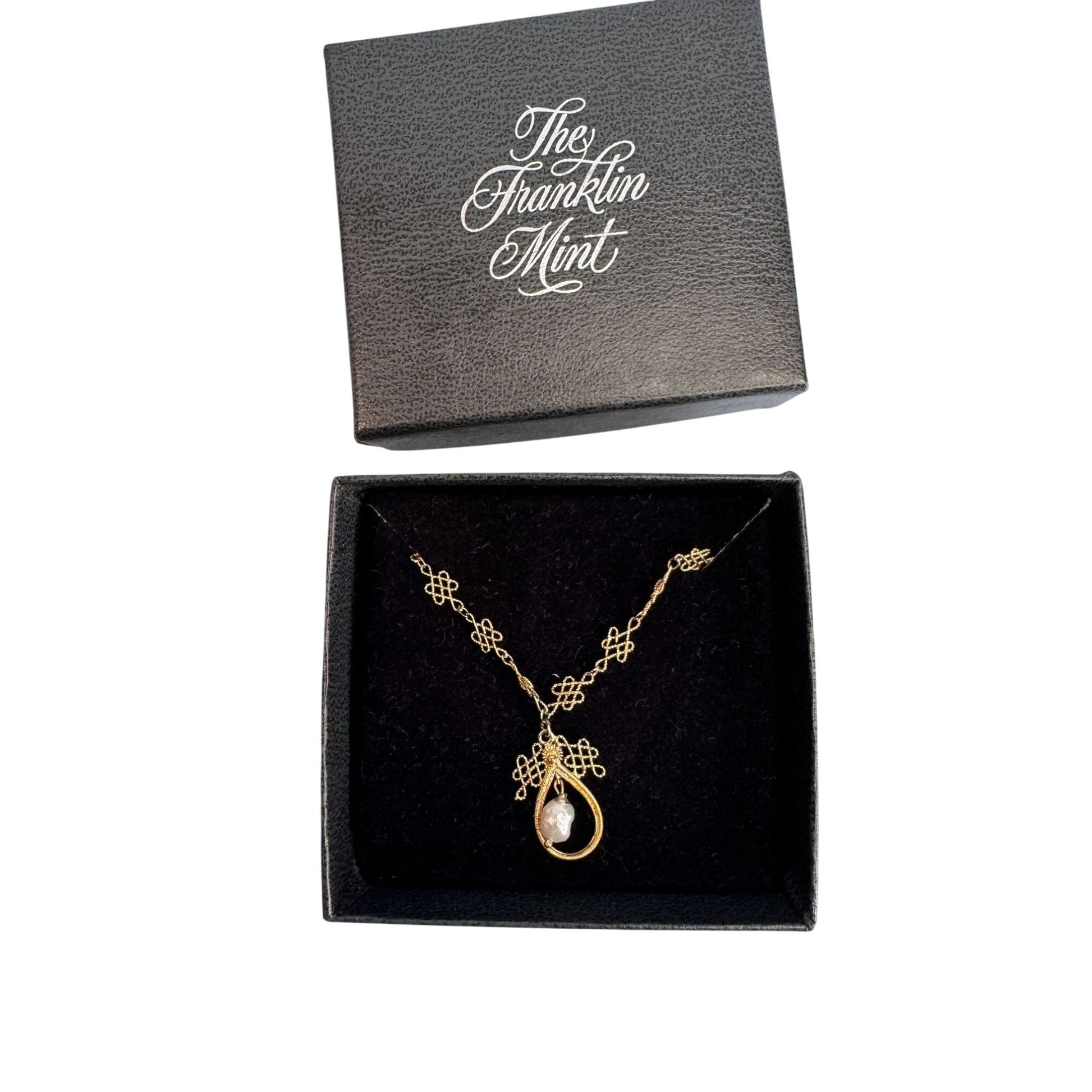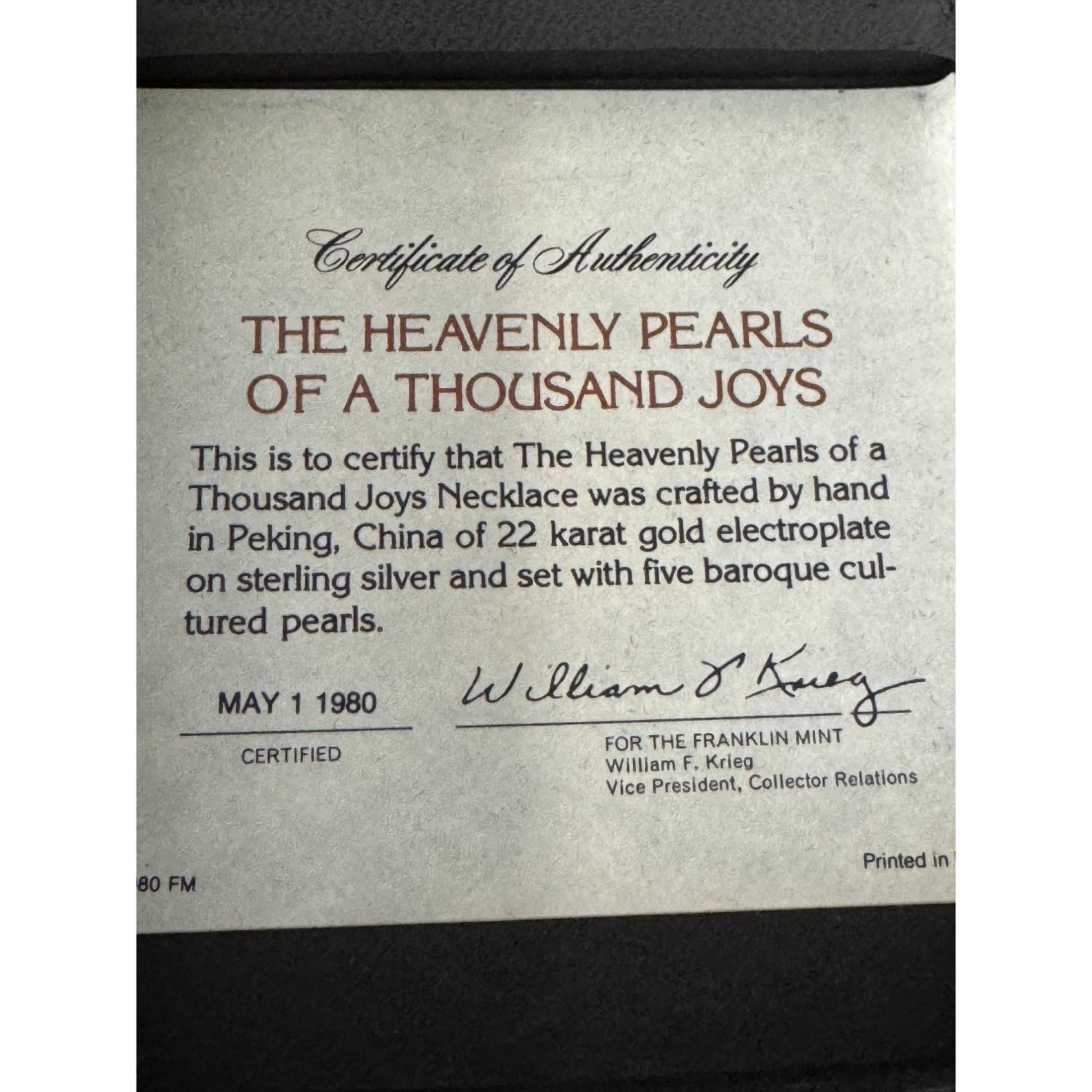 The Franklin Mint necklace offers elegance with its 22K gold electroplate and sterling silver design, adorned with five baroque cultured pearls. A timeless piece crafted in 1980.