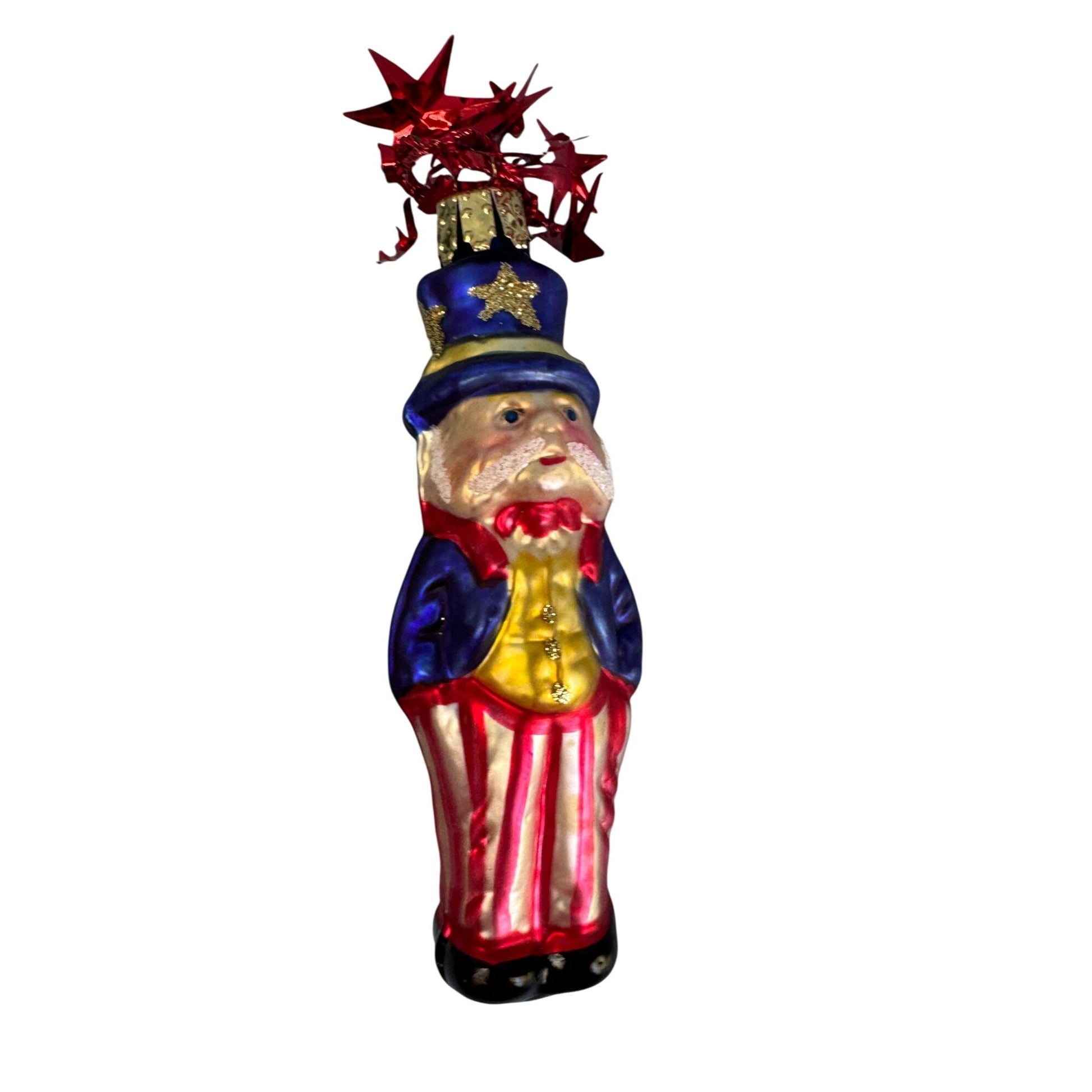 German Blown Glass Christmas Ornament Uncle Sam Red White Blue 4 1/2 Inch
