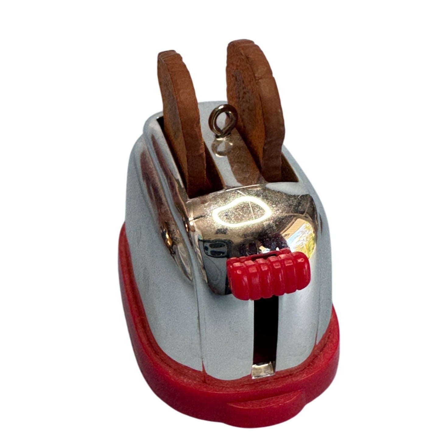 Hallmark Keepsake miniature from Christmas 2007 featuring a shiny chrome-look toaster with bright red base and two slices of toast, one with a heart design. The red lever on the side makes the toast pop up and down, adding a fun interactive touch. Measures approx. 2 1/8" x 2 1/8" with toast up. This piece was not designed as an ornament—there is no hanger—so it works best as a shelf, tabletop, or curio display collectible.