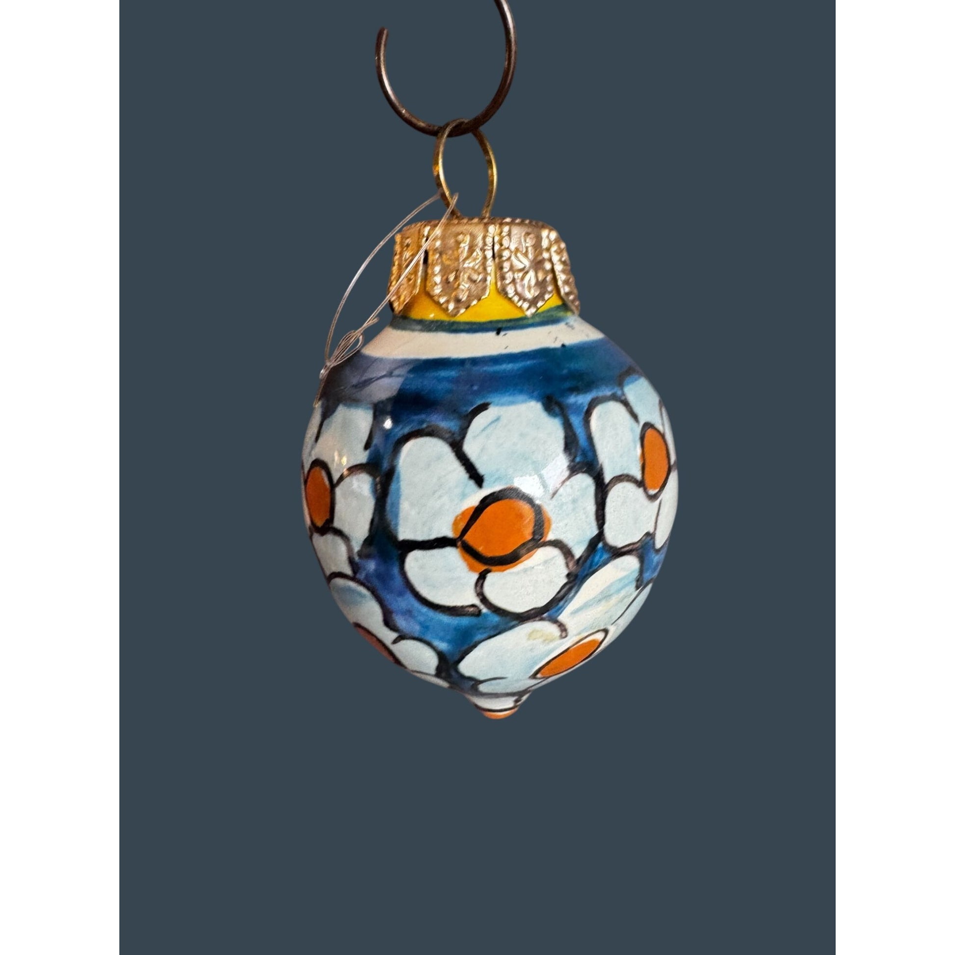 This is a hand-painted porcelain Christmas ornament featuring bold stylized flowers in blue, white, and orange with black outlining. The glossy glaze gives it a vibrant folk-art look, and the gold-tone cap adds a vintage touch. Lightweight, colorful, and perfect for adding a pop of artisan style to your holiday tree.