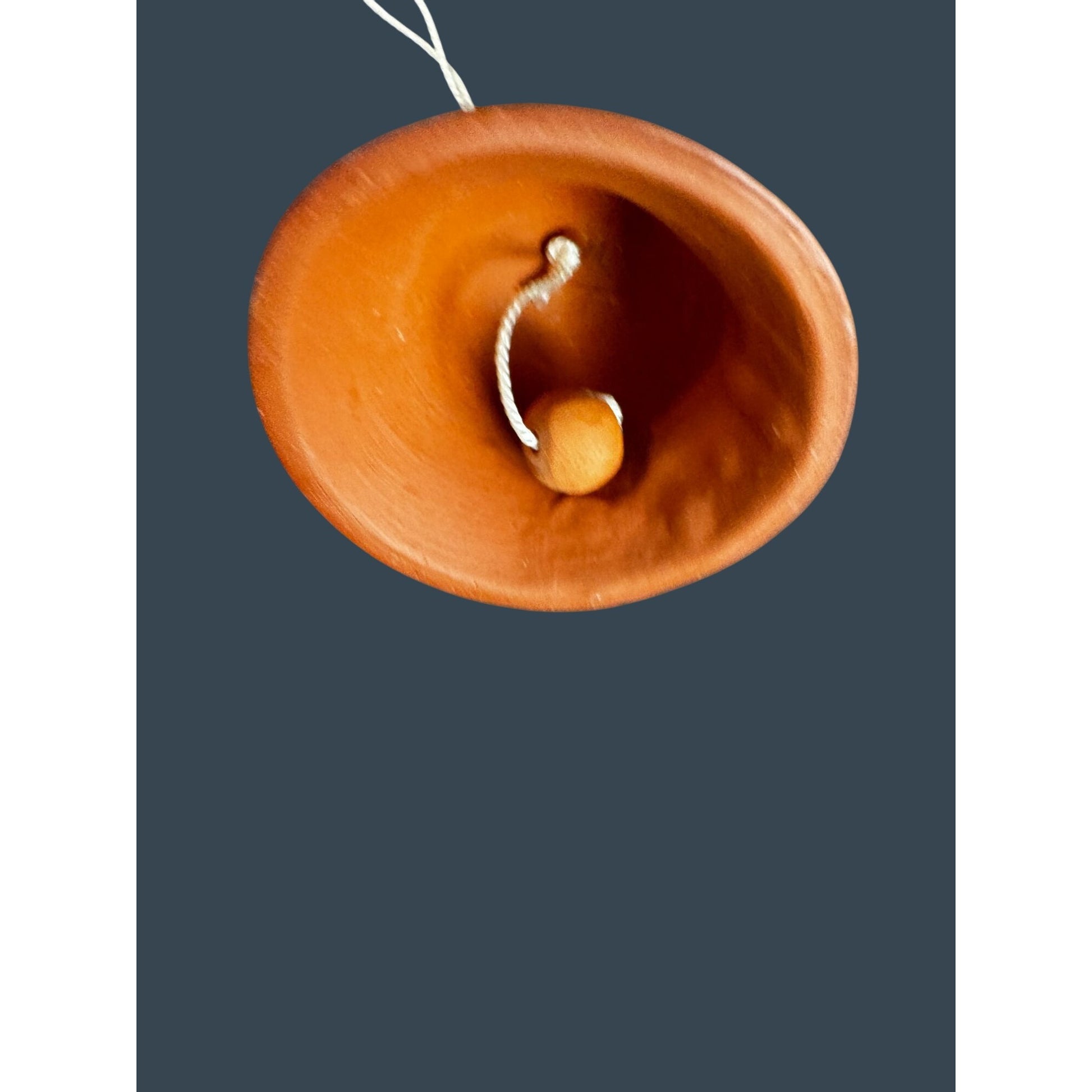 This is a charming hand-painted pottery bell ornament featuring a colorful mountain landscape on one side and a white village with red roofs on the other. The bell is made of unglazed terracotta inside with a glazed, glossy exterior. Simple natural string hanger and clay clapper. A sweet rustic folk-art piece perfect for holiday décor or year-round display.