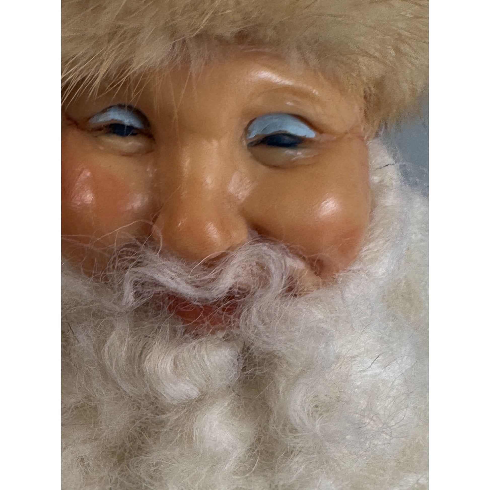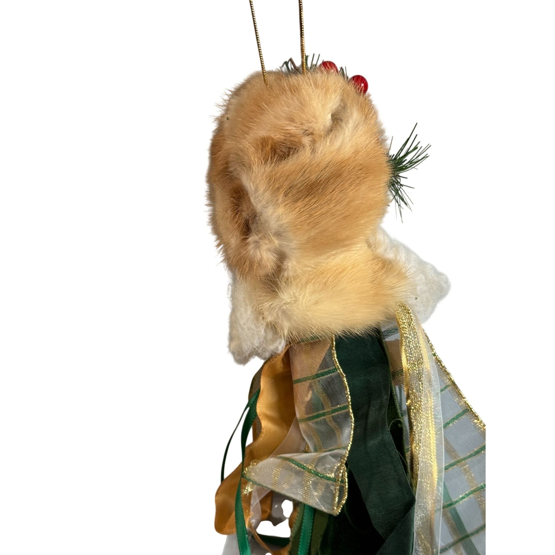 This handmade folk art Santa ornament has a jolly hand-painted molded face, fluffy curly white beard, and a tall faux fur Russian-style hat accented with holly berries and evergreen. Finished with layered green, gold, and ivory ribbons, it’s a statement 9" hanger that adds that cozy old-world/European Christmas look to a tree, garland, or wreath. No tags.