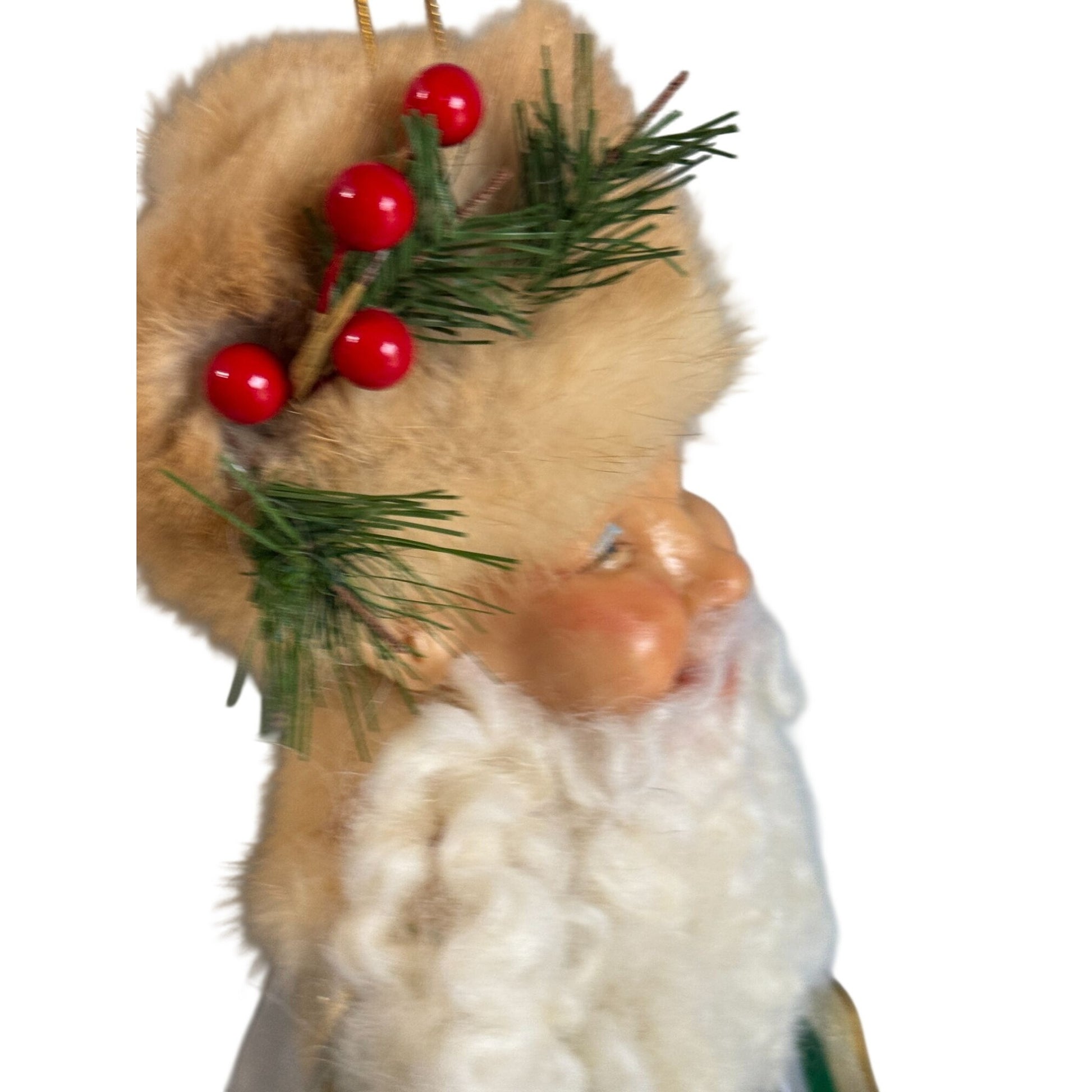 Handmade Folk Art Russian Style Santa Ornament Fur Hat Holly Green Gold Ribbon 9"