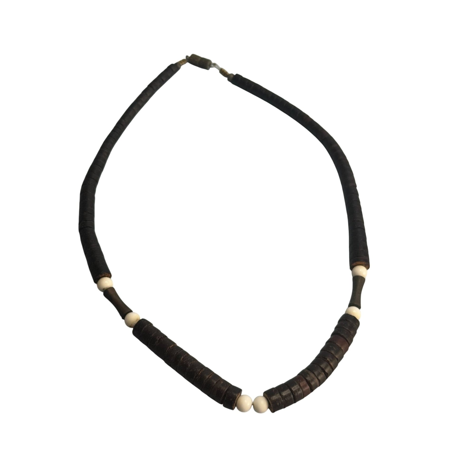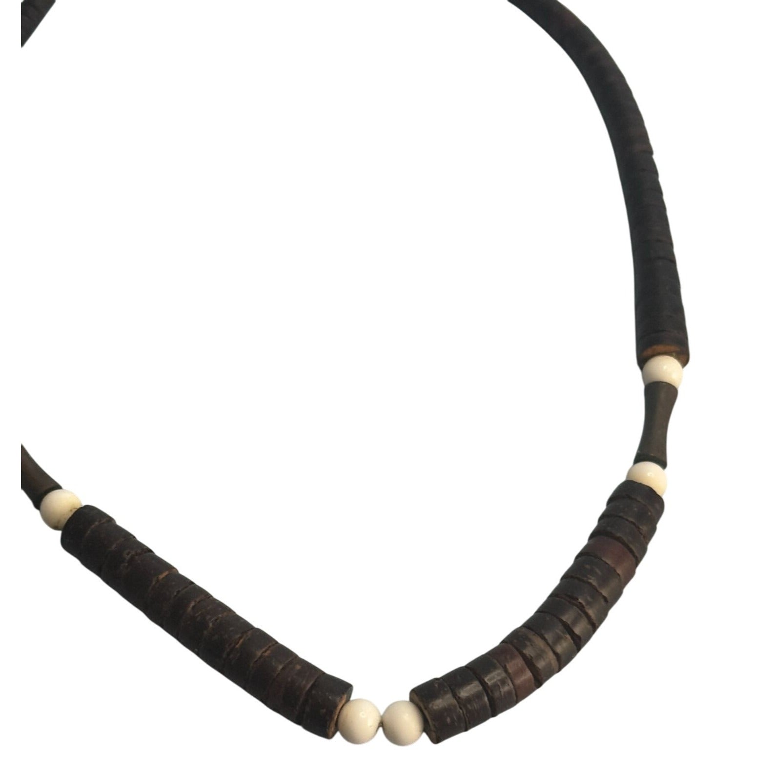 Heshi Style Wood Beads Tribal Folk Art Necklace Brown White 17 Inch Vintage