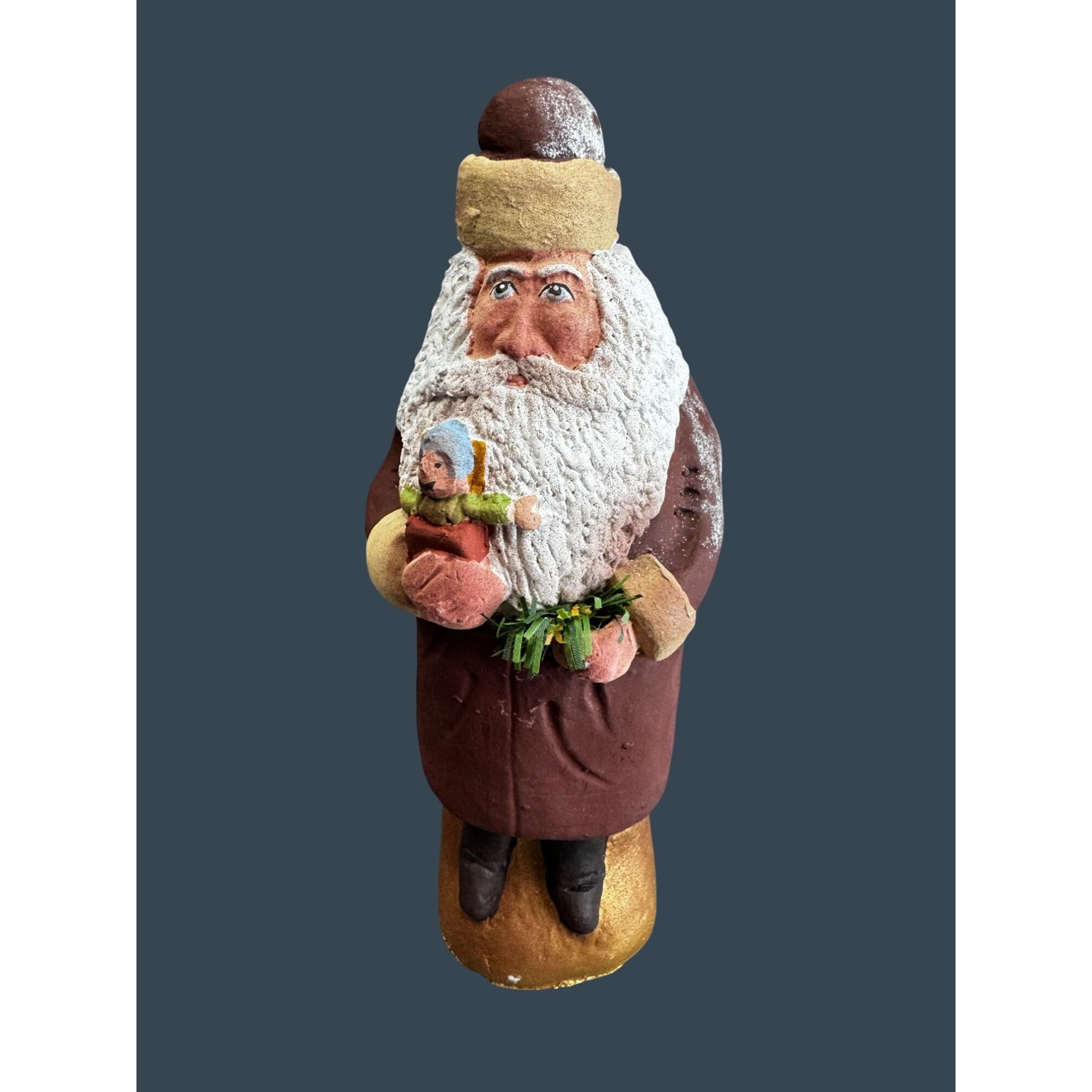 This charming handmade pottery Santa is a signed studio piece by Robert & Sandy Jackson of Jackson Pottery, Rock Island, Illinois. Each figure was sculpted and painted by hand, giving it a distinctive folk-art style with wonderful character and textured details. Displays beautifully for Christmas or year-round collectors.