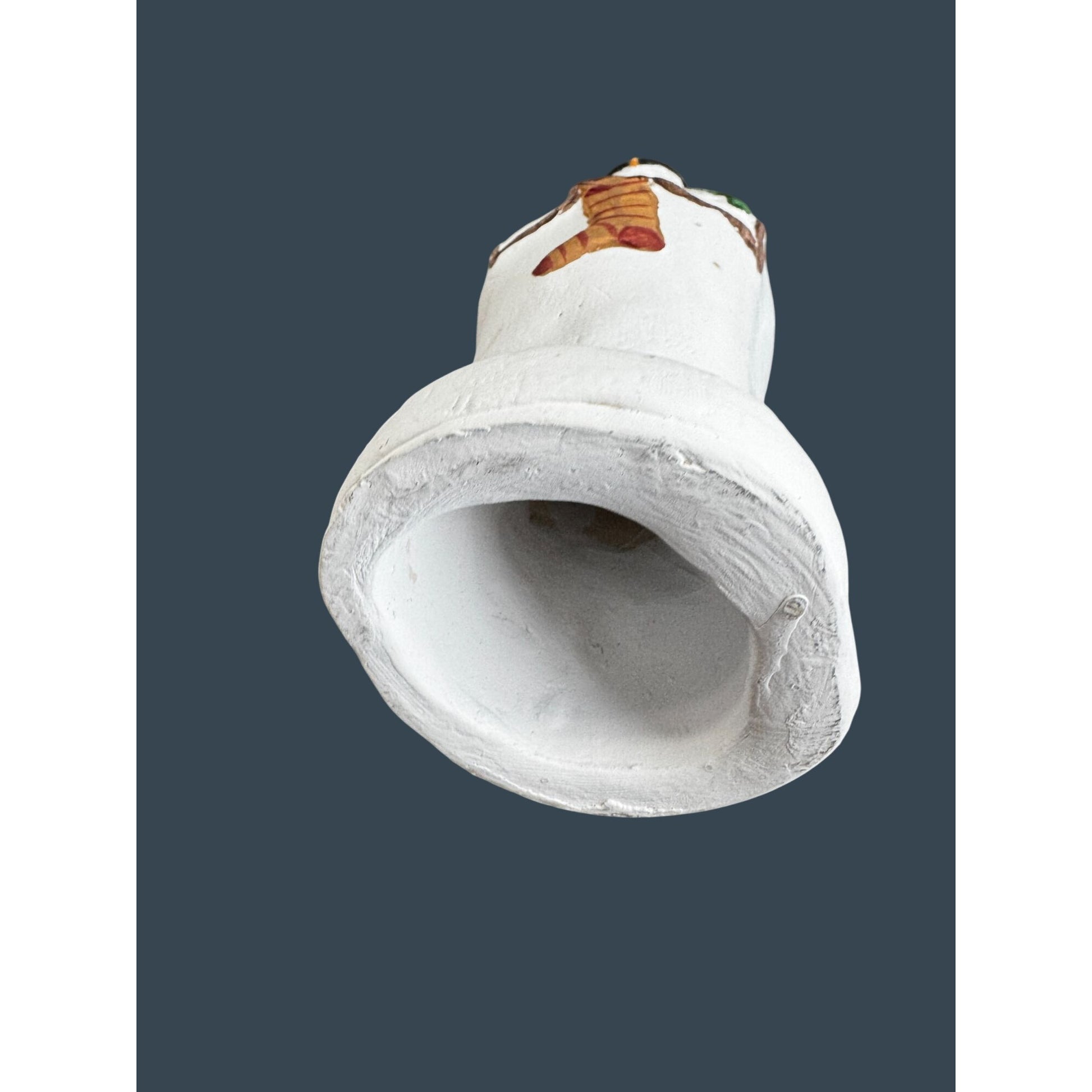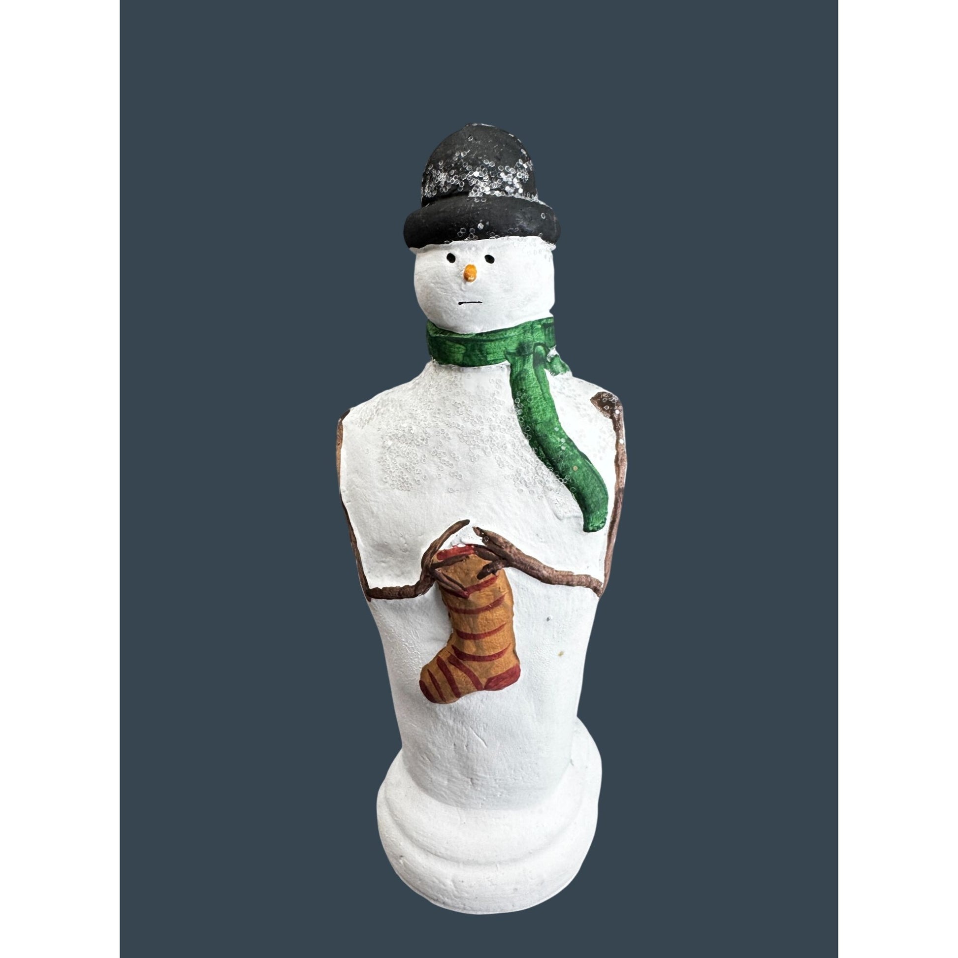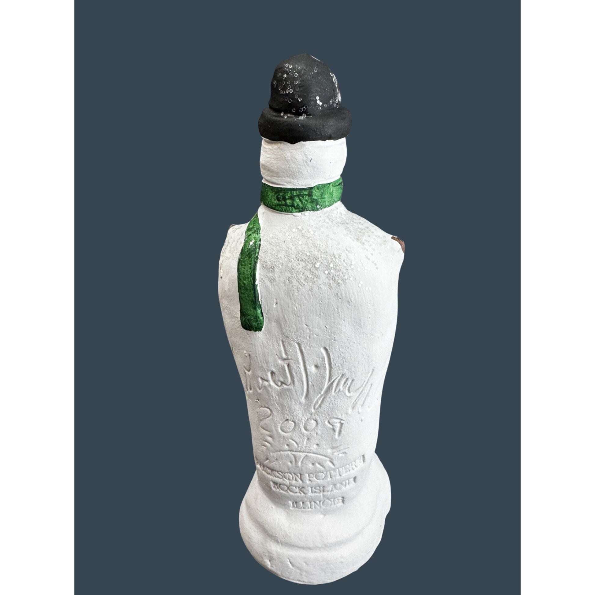 This charming handmade pottery snowman is an early studio piece crafted and signed by Robert Jackson of Jackson Pottery, Rock Island, Illinois. He features a black glittered top hat, green scarf, twig-style arms, and a painted stocking detail. Each Jackson Pottery figure is individually sculpted and hand-painted, making every piece one of a kind.