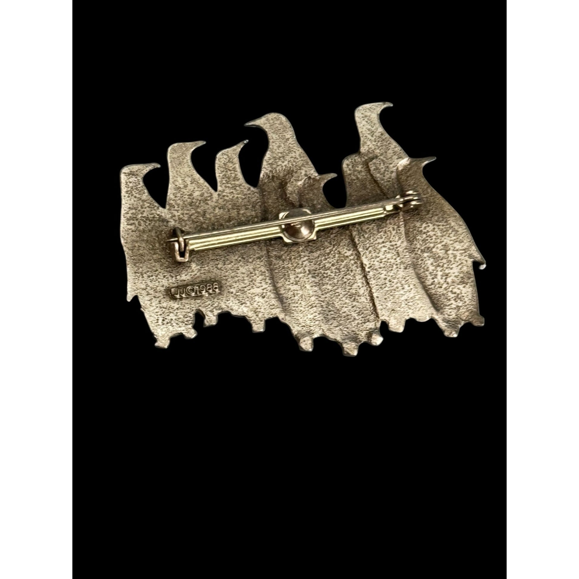 This JJ 1988 vintage brooch depicts a group of stylized penguins crafted with fine attention to detail. Made from pewter with a gold-toned finish, this pin showcases intricate texturing and craftsmanship. Ideal for collectors, it features a single secure pin-back closure on the reverse. A signed piece, the JJ hallmark is stamped for authenticity. Versatile for wear or display.