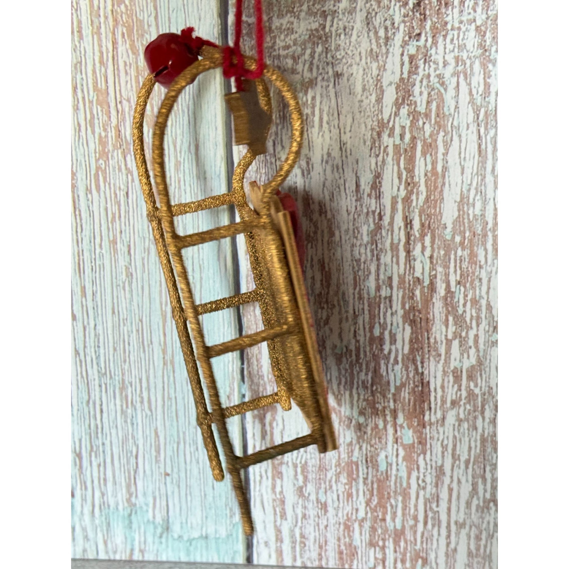 This charming sled ornament tells a story of love and warmth, adorned with a red heart and star. Crafted with golden details, it embodies festive joy. Its petite size makes it ideal for decorating trees or adding a touch of holiday spirit to your space.
