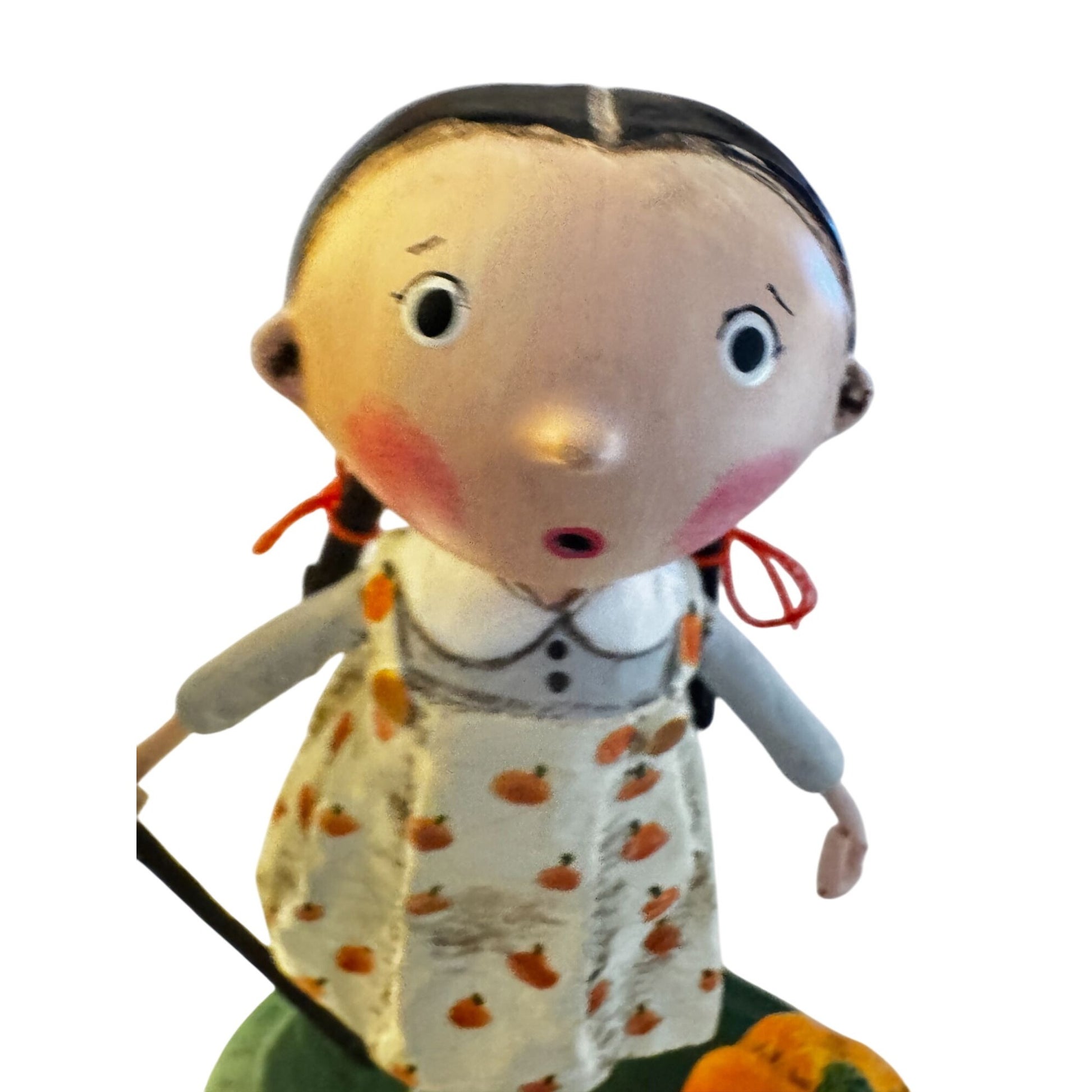 Adorable Pru the Pumpkin Farmer figurine from Lori Mitchell’s charming folk art collection. Pru stands holding her golden pitchfork beside a plump pumpkin, dressed in a cream apron adorned with tiny orange pumpkins, striped stockings, and red ribbon-tied braids. Crafted from hand-painted resin and signed on the back of the base, this delightful piece captures Lori’s whimsical Halloween style perfectly.