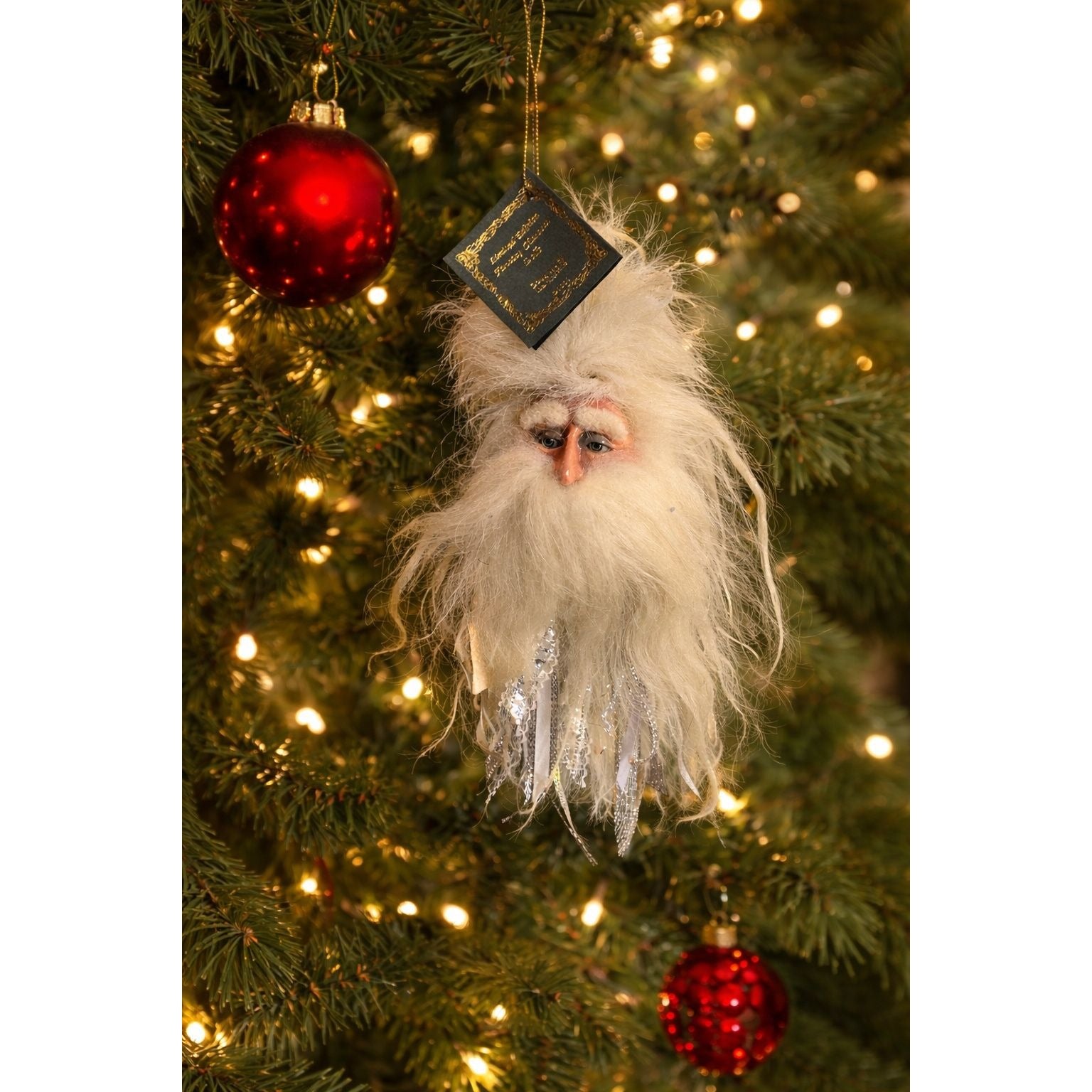 This Marci Wolfe Father Frost Santa head ornament is a hard-to-find piece with serious character—glass eyes and a beautifully sculpted face give him a lifelike, old-world expression, finished with classic spun cotton details for that vintage folk art holiday look. Father Frost examples are much less common, making this a desirable ornament for collectors and elevated Christmas tree styling.