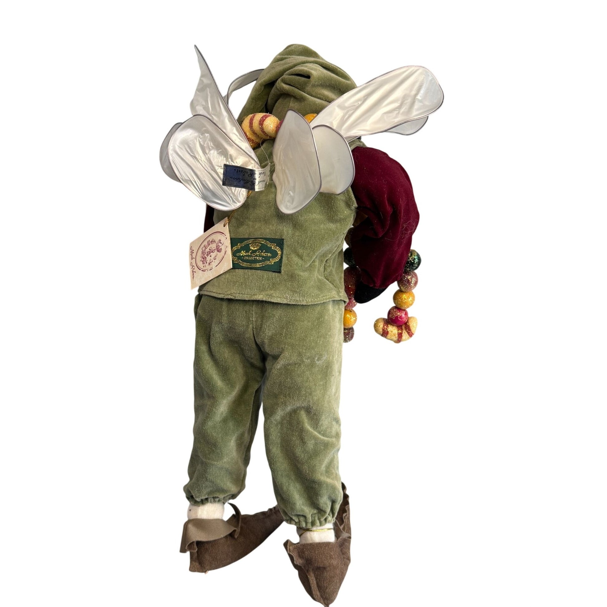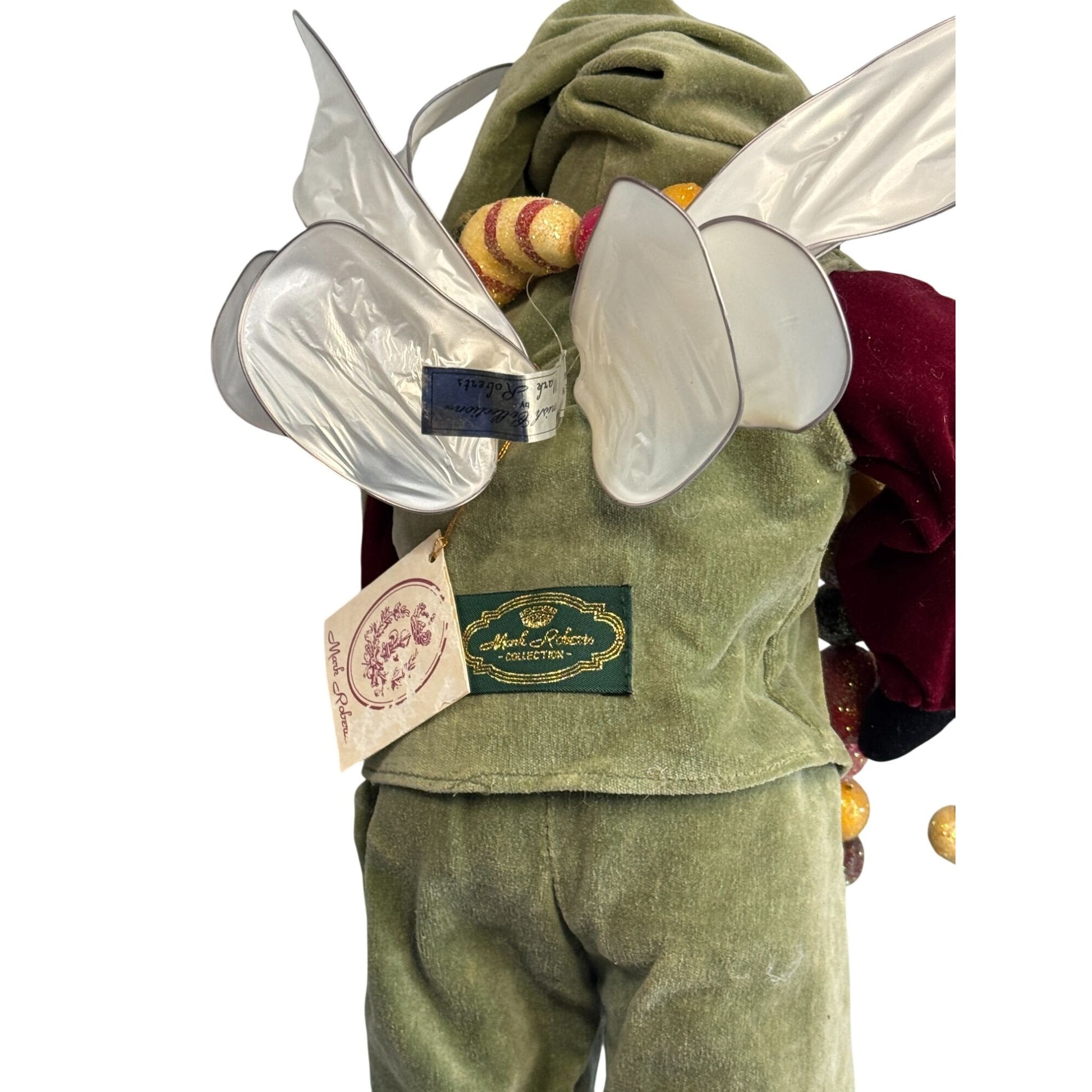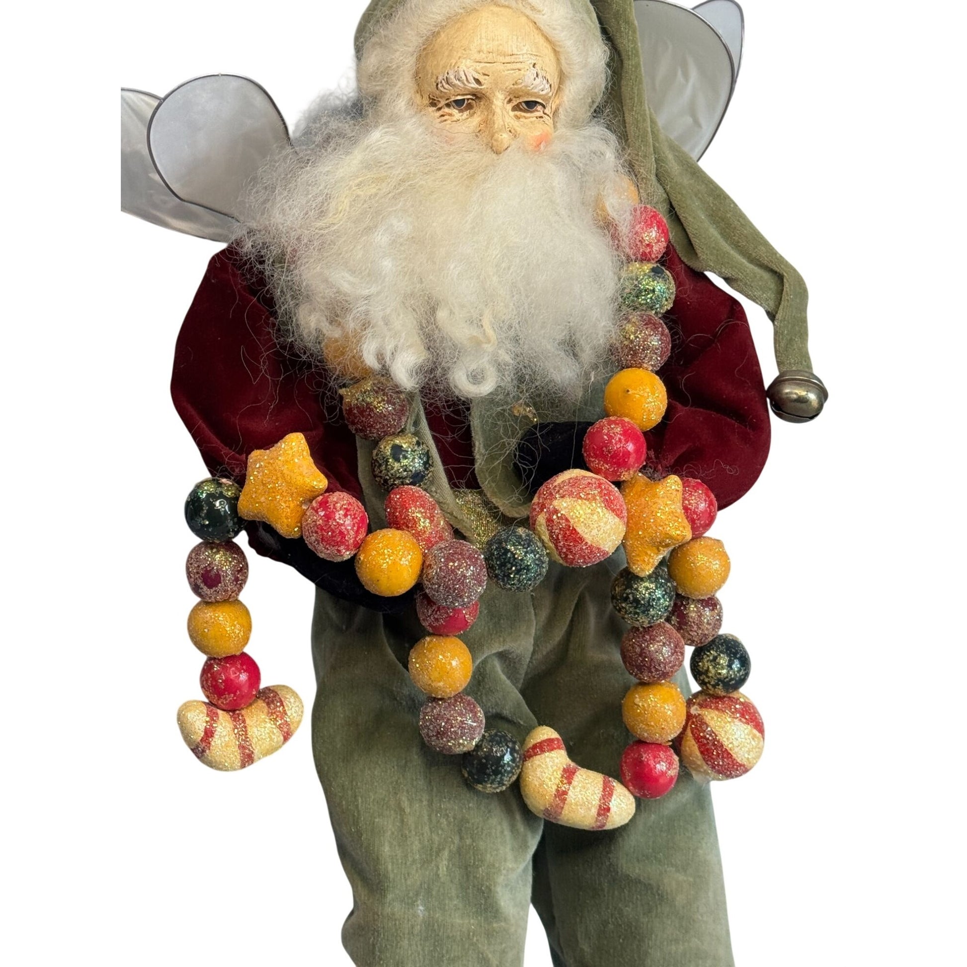 his is an older Mark Roberts “premier” Fairy Santa from the Flemish Collection, made in the late 1980s. He’s dressed in soft green velvet with a burgundy jacket, has translucent fairy wings, and is holding a glittered bead garland with candy-cane accents—such a whimsical, collectible holiday display piece that looks great on a mantel or tabletop.