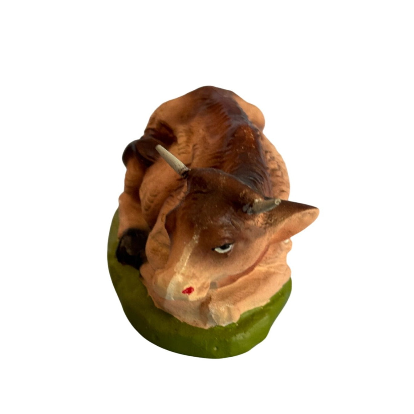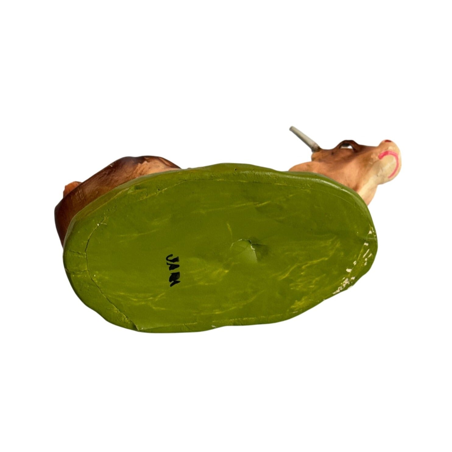 This midcentury paper mache cow figurine showcases a seated brown cow on a green base. Measuring 4.5 inches, its hand-painted details portray realism and subtle wear consistent with vintage Japanese craftsmanship. A unique collectible for art and design enthusiasts.