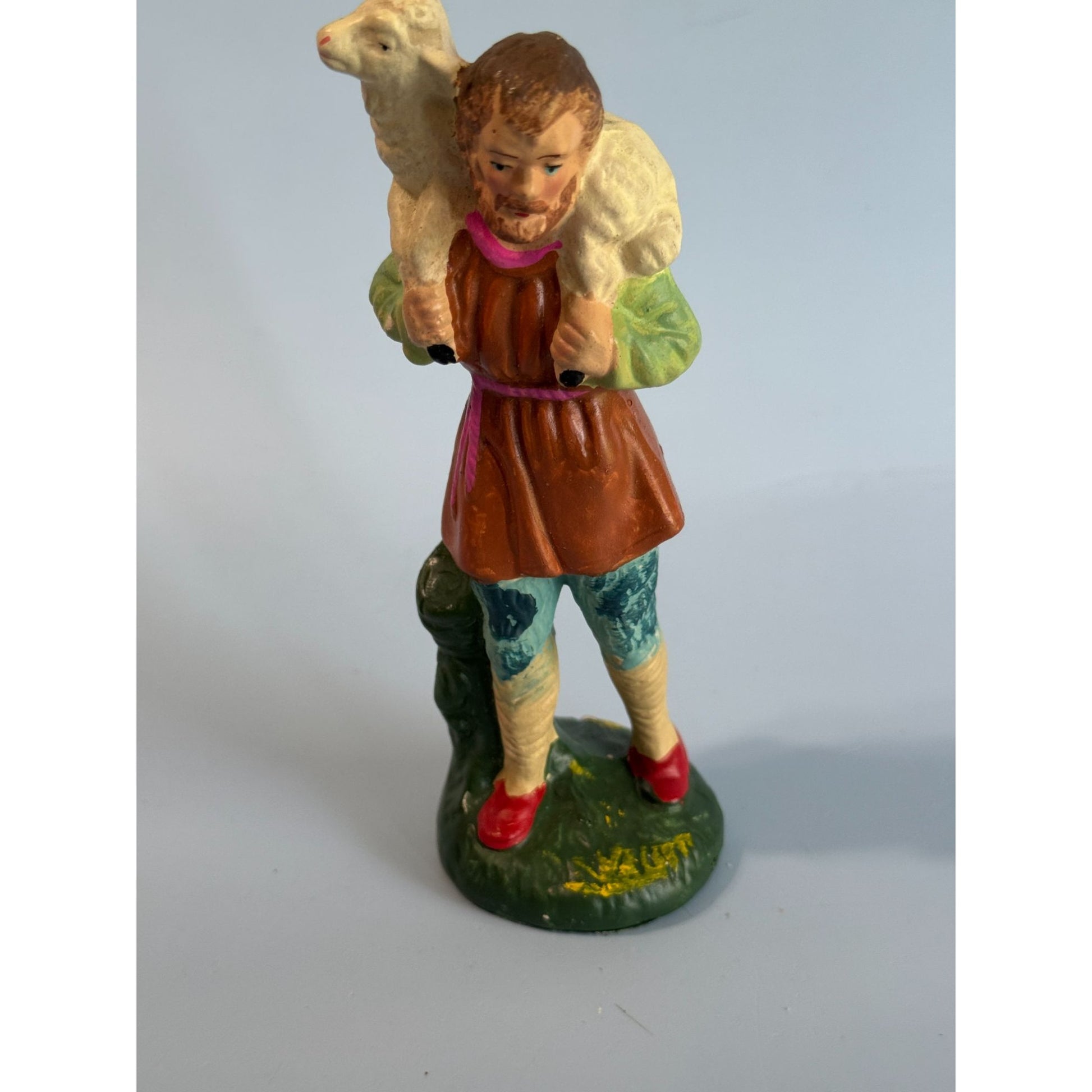 This midcentury figurine features a shepherd, accompanied by a lamb. Handmade in Japan, it is crafted from paper mache and intricately painted in vibrant multicolor tones. Measuring approximately 4.5 inches tall, it exhibits charming details characteristic of the era. A great collectible or decor piece, the figurine embodies a rustic pastoral theme with a classic touch of Japanese craftsmanship.