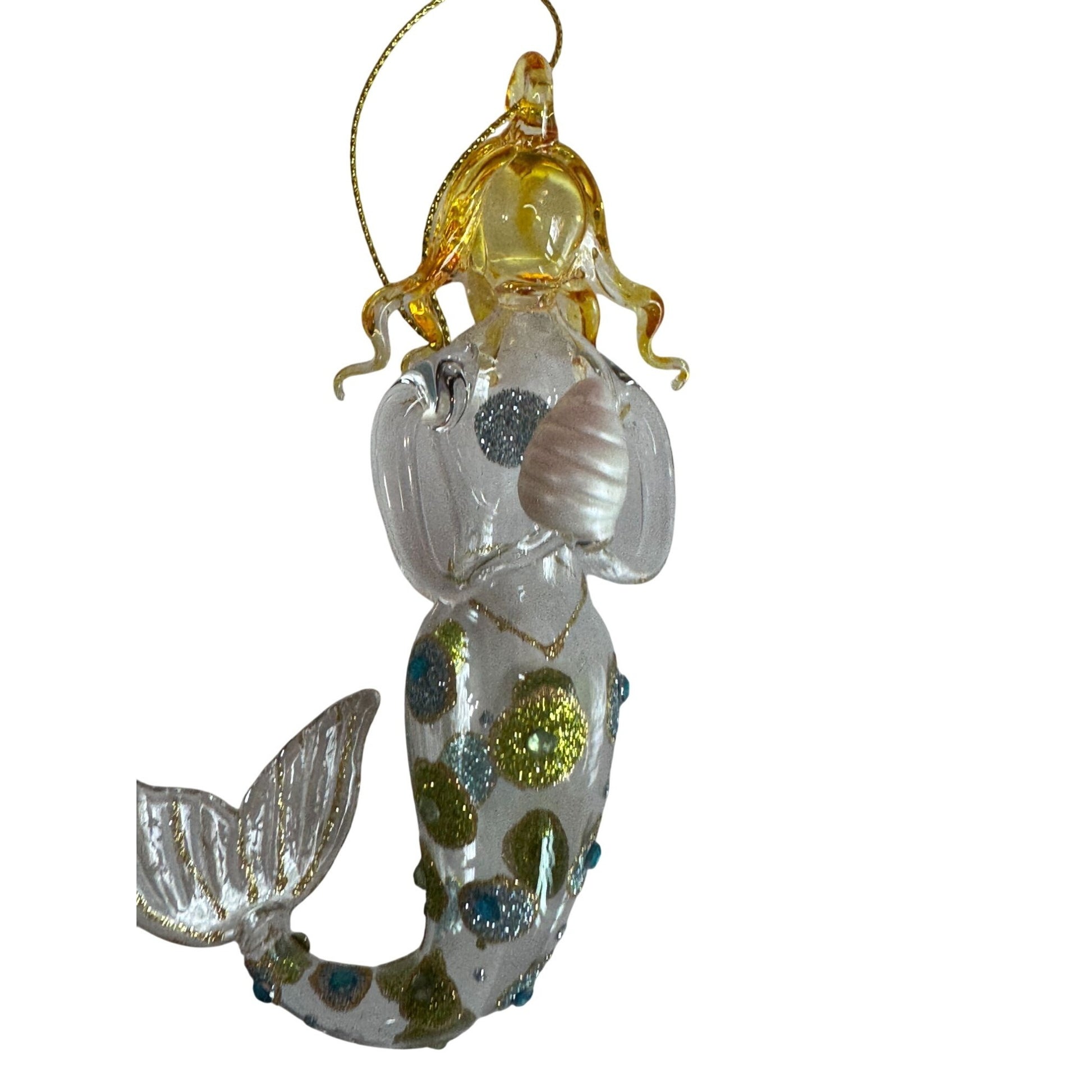 This enchanting Midwest CBK blown glass ornament depicts a nautical goddess and mythical sea creature with golden hair, holding a starfish. Her clear glass body shimmers with iridescent blue and green glitter and jeweled accents, evoking the sparkle of ocean waves. A whimsical sea siren that adds elegance and fantasy to any beach or coastal Christmas theme.