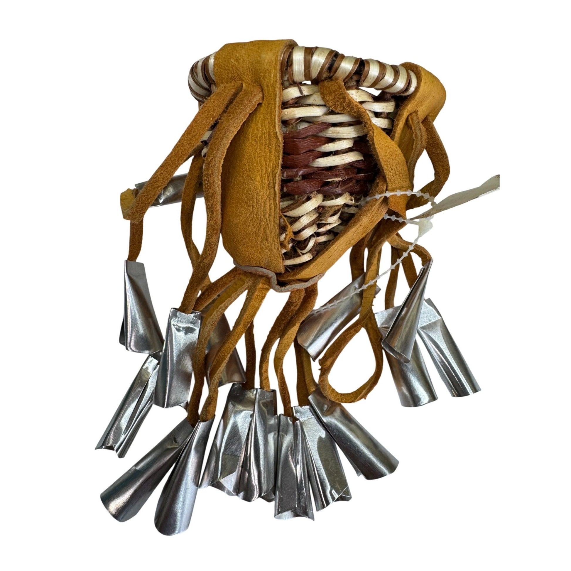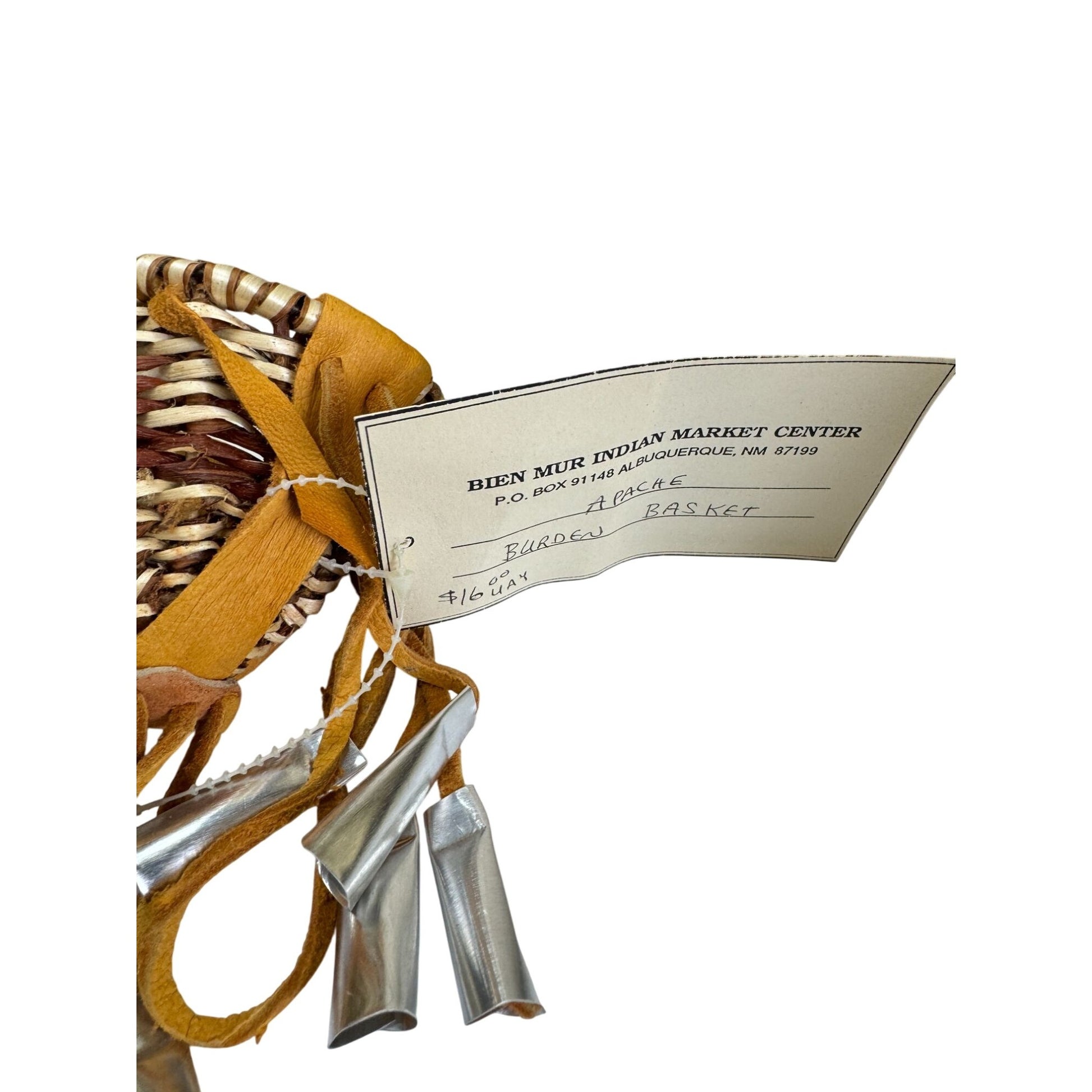 This miniature Native American burden basket is beautifully handwoven with natural fibers, wrapped in soft leather, and decorated with jingling metal cones. Traditionally, burden baskets were used for carrying food and supplies, and miniatures like this are cherished as symbolic art pieces. This one comes from Bien Mur Indian Market Center in Albuquerque, NM, and still retains its original tag.