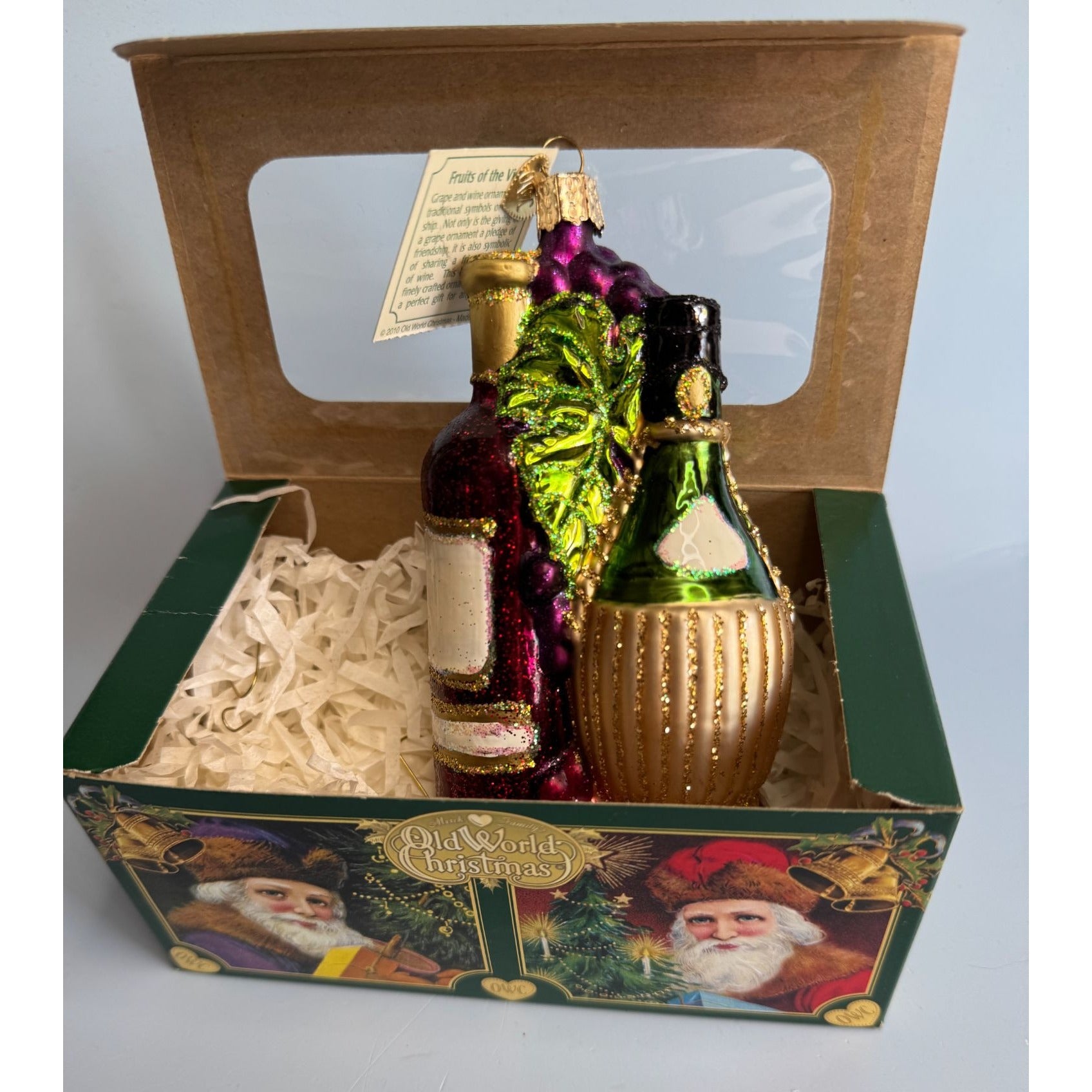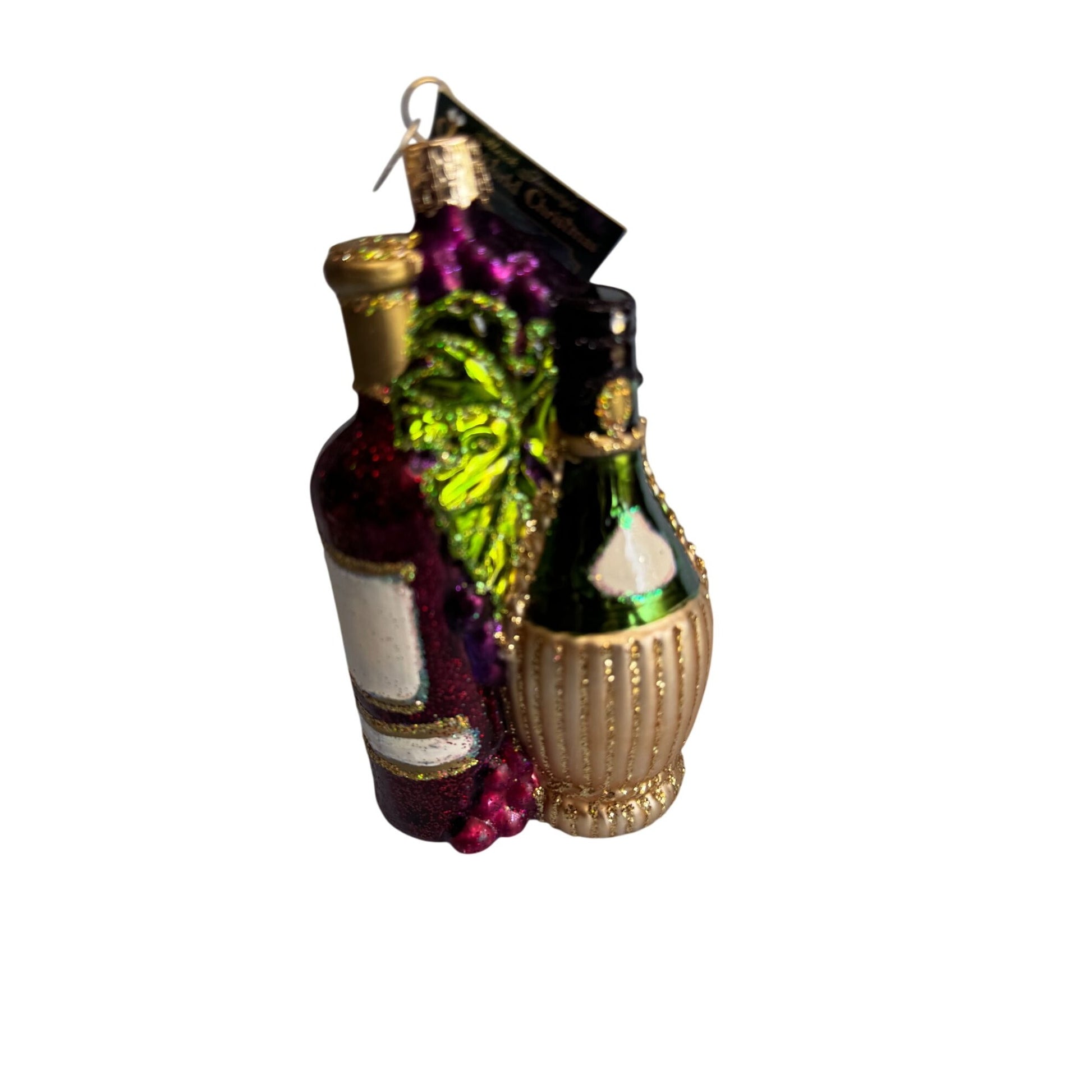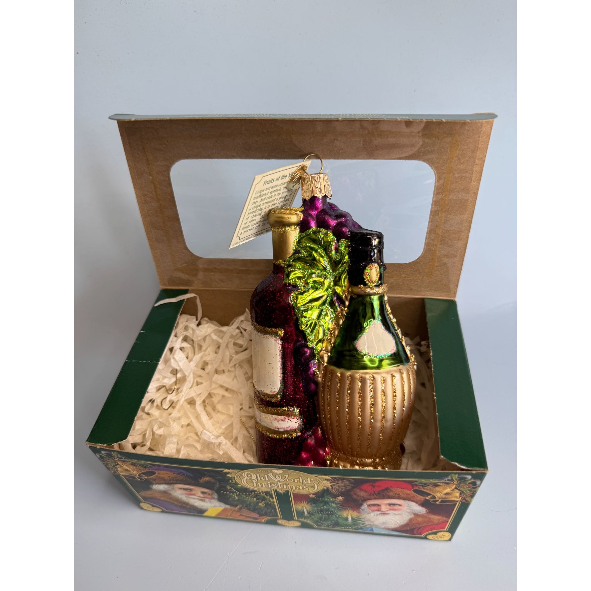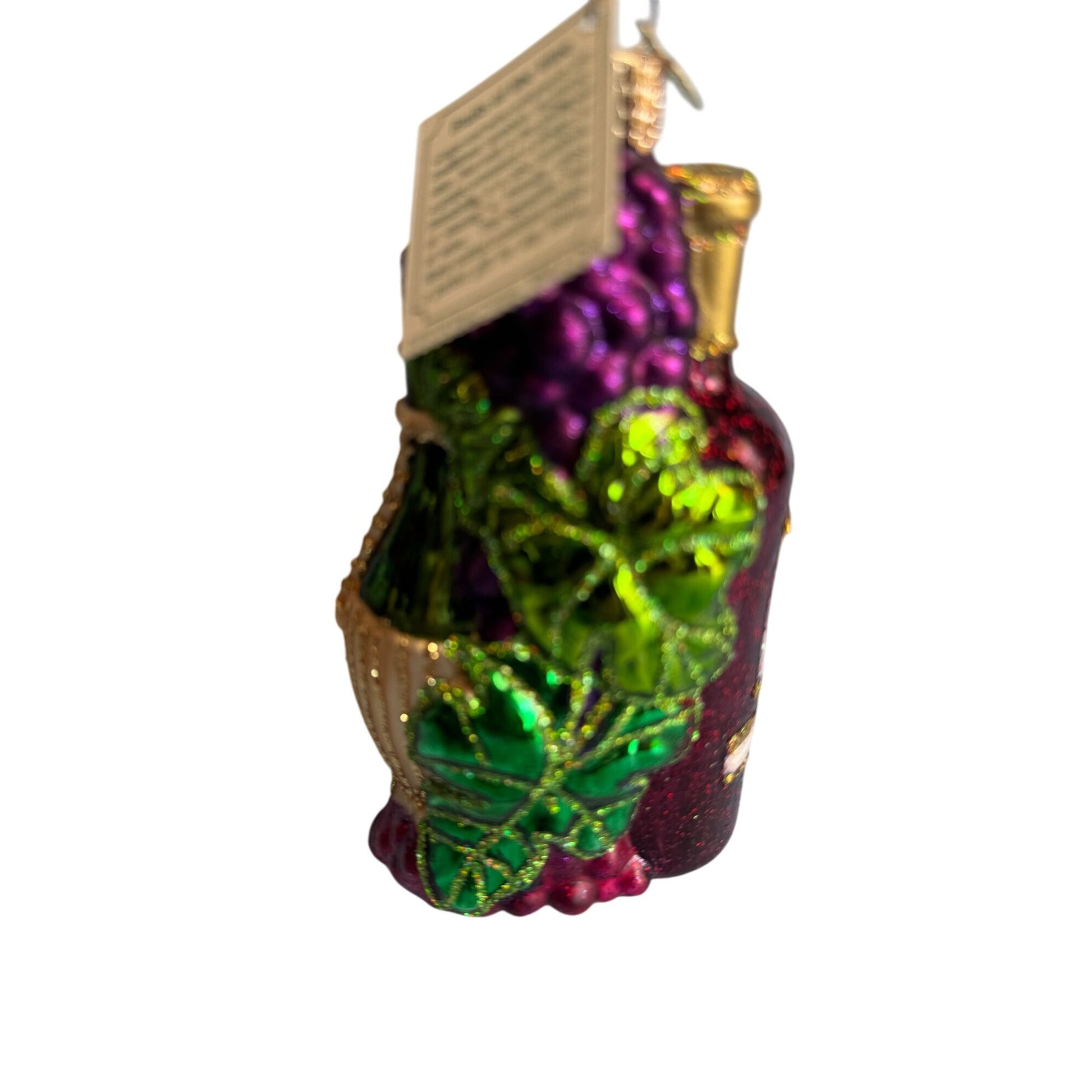 This Old World Christmas “Fruits of the Vine” ornament (2010 release) beautifully captures the richness of wine and celebration. Handcrafted in blown glass, it features a glittering bottle of wine, a golden Chianti-style bottle, and a cluster of purple grapes with green leaves, all detailed in vibrant colors and sparkling glitter. A true collectible piece, it comes with its original Old World Christmas box and hang tag. Perfect for wine lovers and OWC collectors alike.