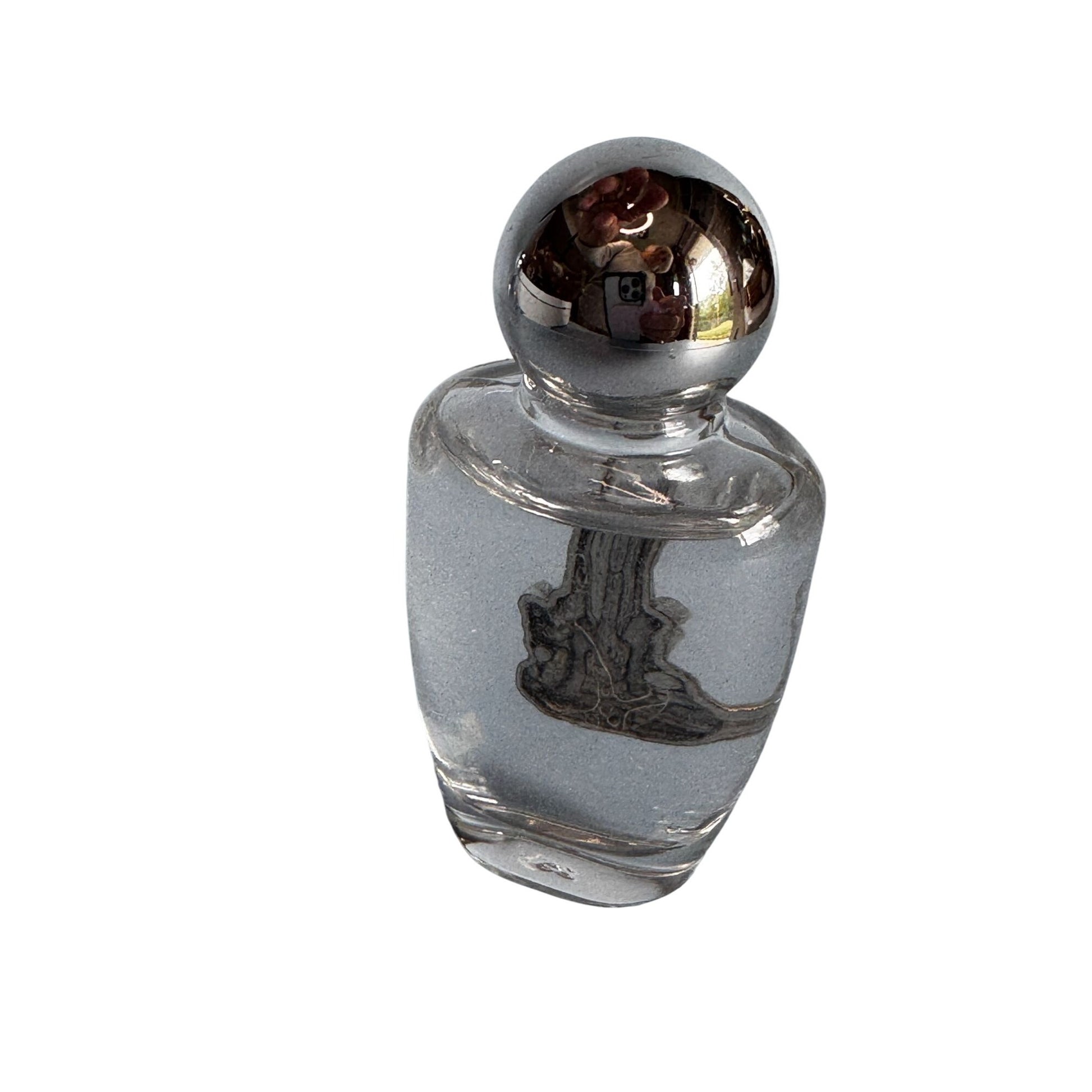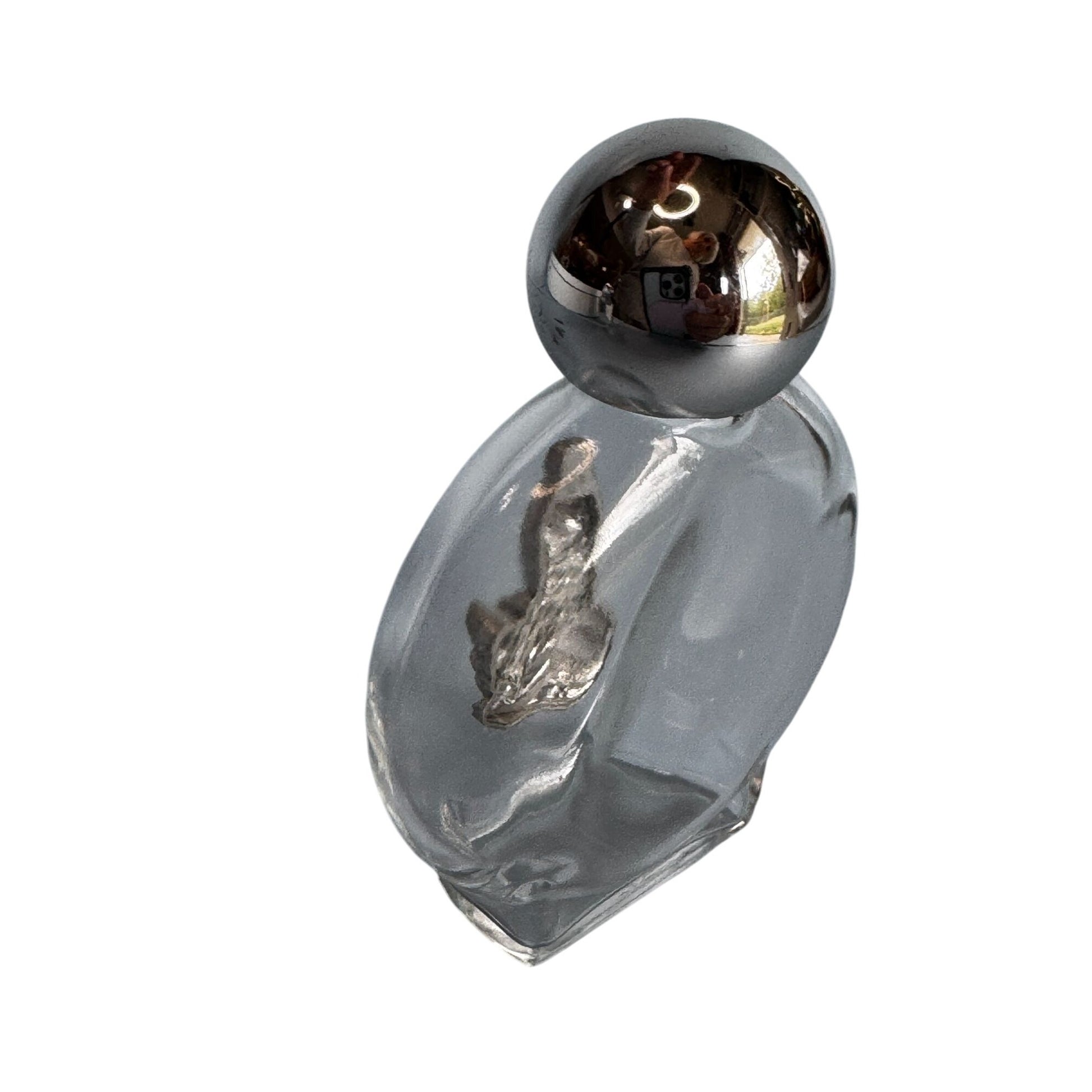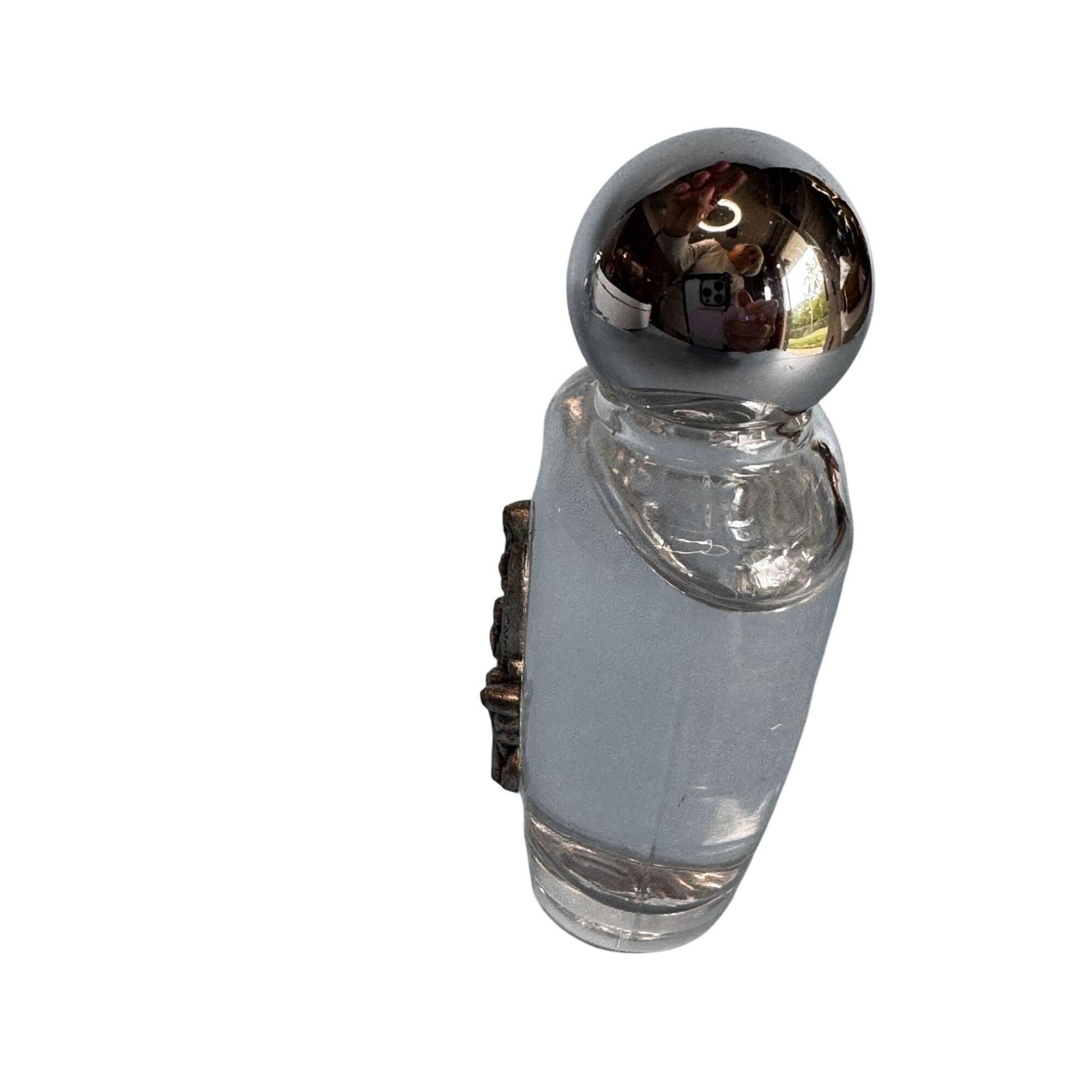 This pair of Our Lady of Fatima religious glass bottles features elegant craftsmanship, with each bottle showcasing a silver-tone medallion of the iconic figure. The bottles vary slightly in design for a unique touch while maintaining cohesive style. The polished chrome spherical stoppers add a sleek, contemporary contrast to the timeless religious imagery. These versatile bottles are perfect for decorative use or as meaningful keepsakes, blending faith and artistry seamlessly in design. Tall bottle is 3 1/4" and full. Other bottle is 3 1/8" and empty.