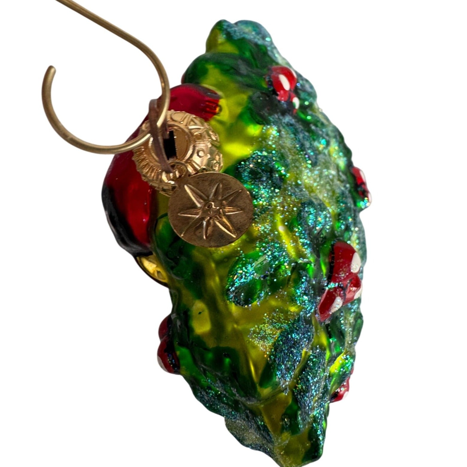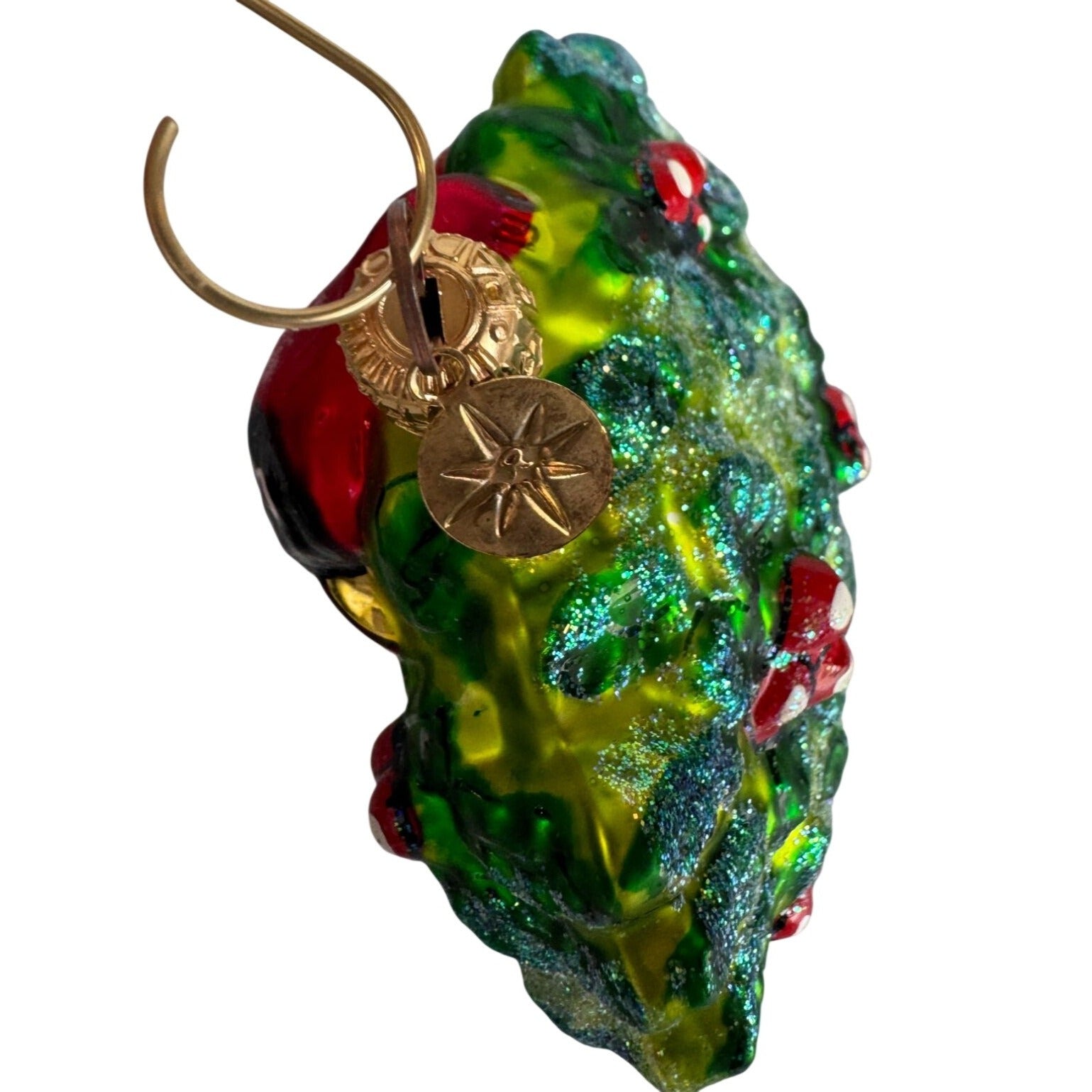 style: cardinal bird, holly wreath, Christmas collectible ornament
