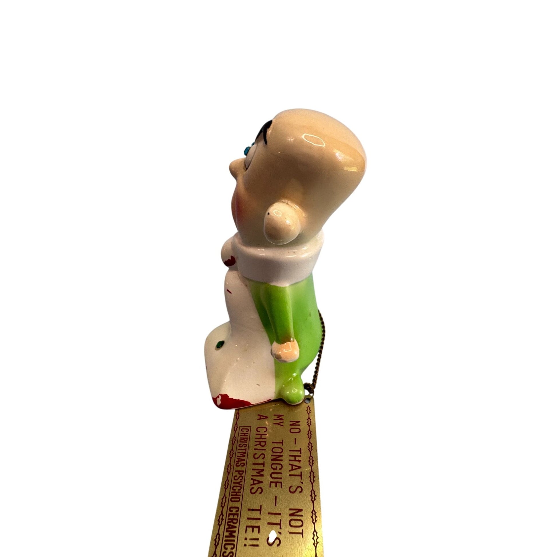 Rare 1960s Kreiss & Co. Psycho Ceramics Christmas figurine, made in Japan. This exaggerated big-brow character shows off Kreiss’s trademark humor with a sign reading: “No — that’s not my tongue — it’s a Christmas tie!!” The figure retains its original chain-hung cardboard tag and is stamped “Psycho © Kreiss & Co” on the base. Part of the hard-to-find holiday Psycho Ceramics line, these whimsical figurines are prized by collectors for their quirky mid-century humor and bold cartoon styling.