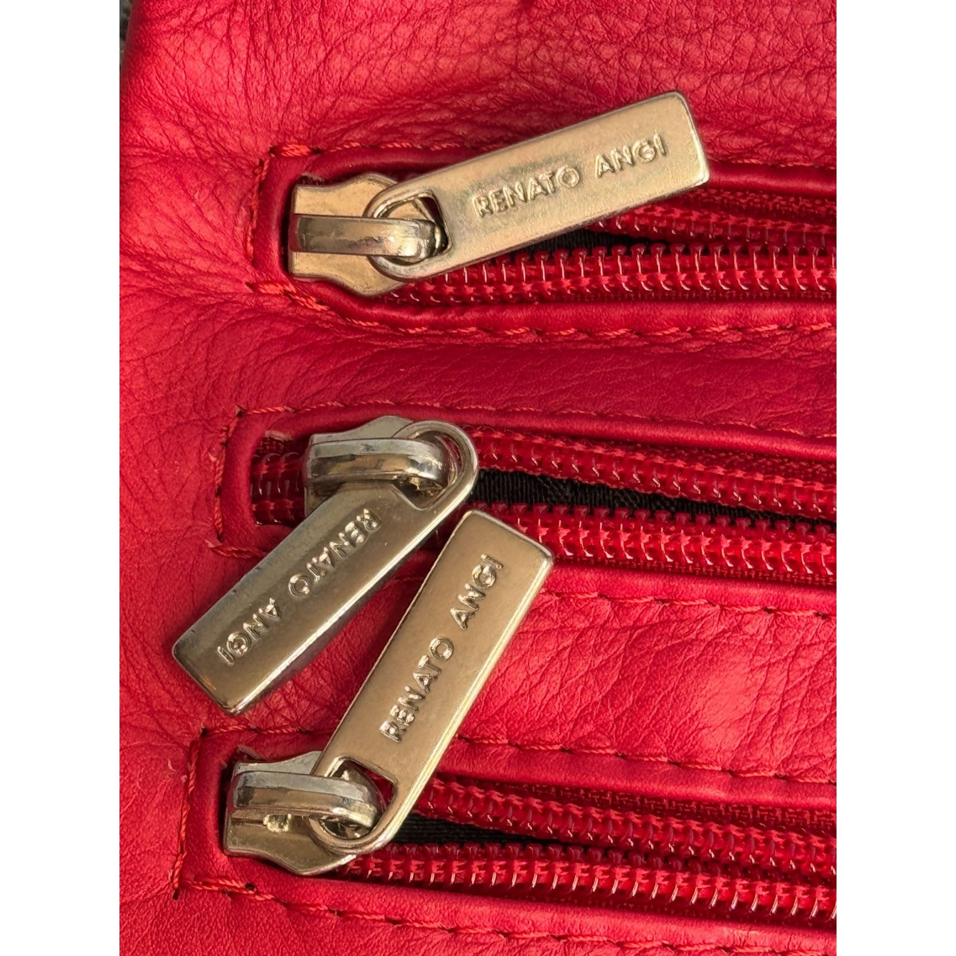 Chic Renato Angi crossbody bag made in Italy, featuring supple red leather with a scenic Portofino village print. Compact yet functional, it offers three zippered compartments, a built-in mirror, and a long crossbody strap. A stylish piece that combines Italian craftsmanship with travel-inspired charm.