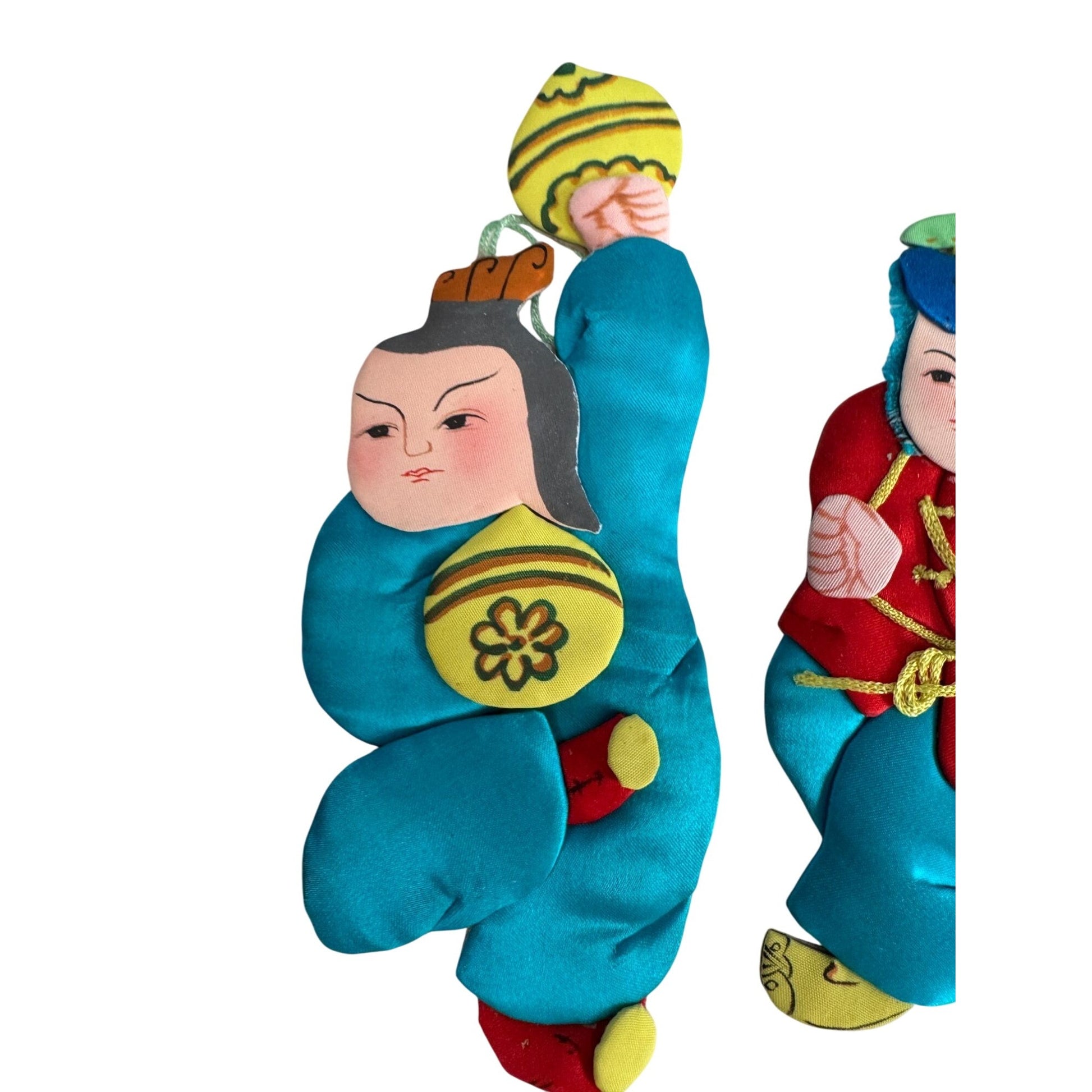 Colorful set of 6 vintage handmade Chinese ornaments crafted from silk over cardboard with painted faces and bright robes. Each figure measures about 6" tall and features fine details, including symbolic props and accessories. These folk art ornaments make wonderful display pieces or holiday decorations. No box included.