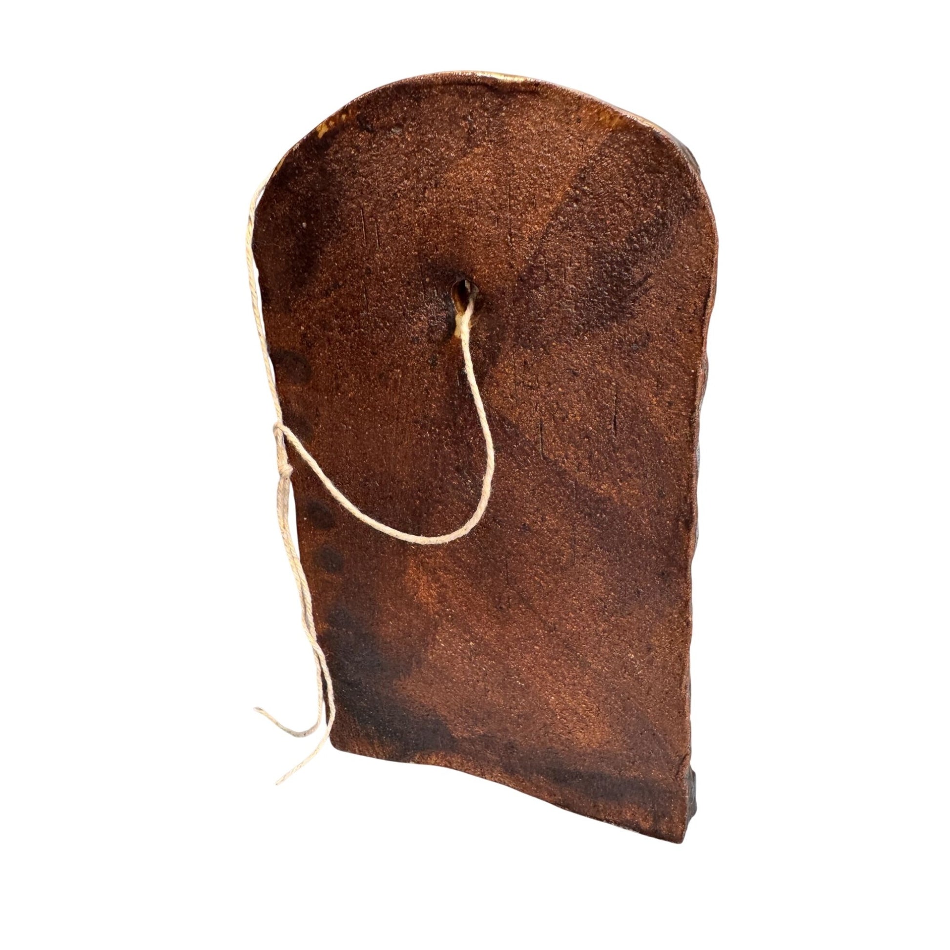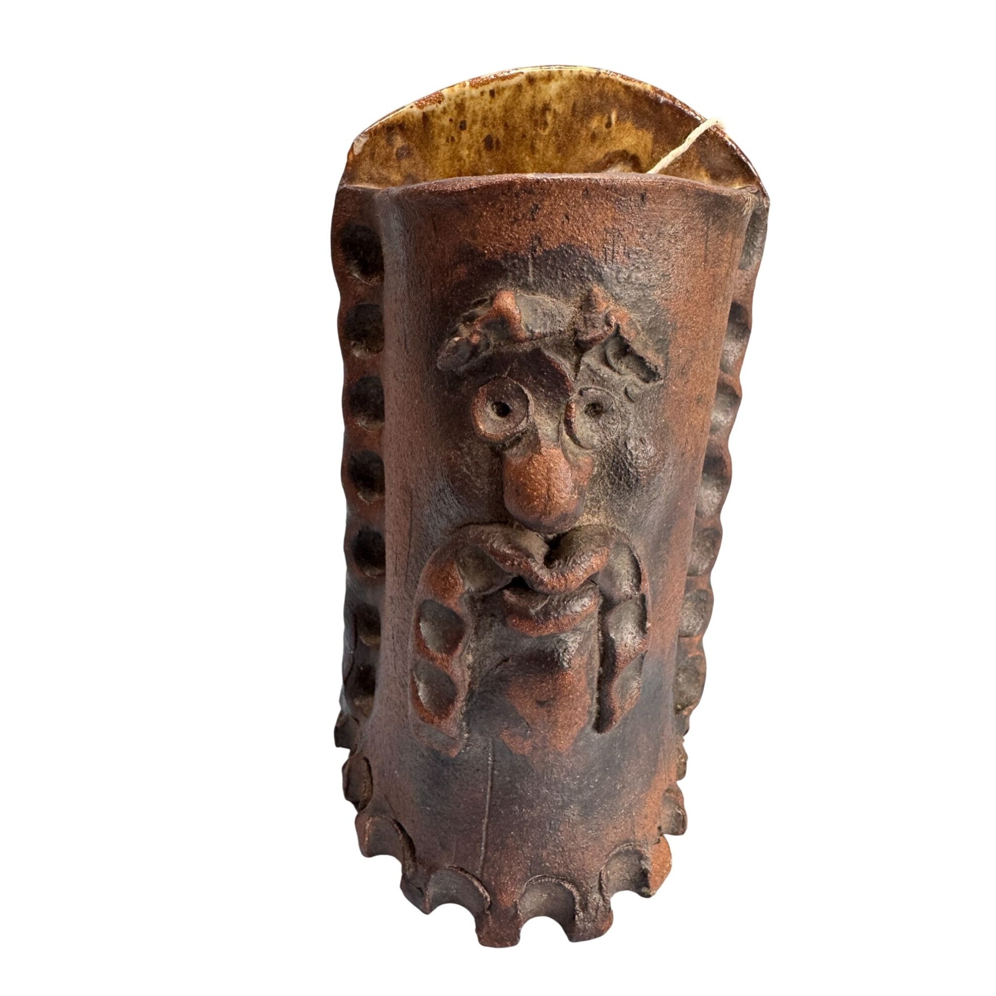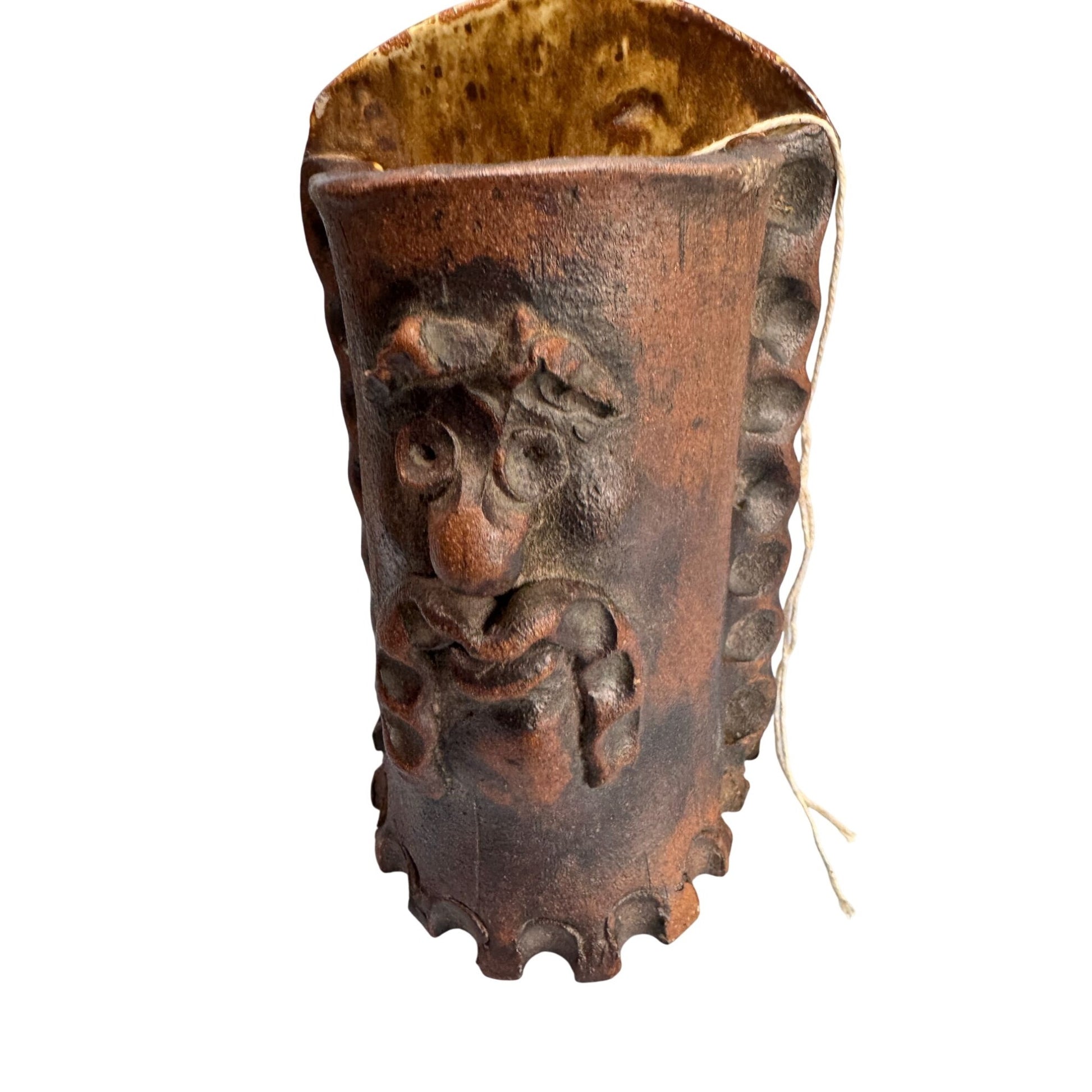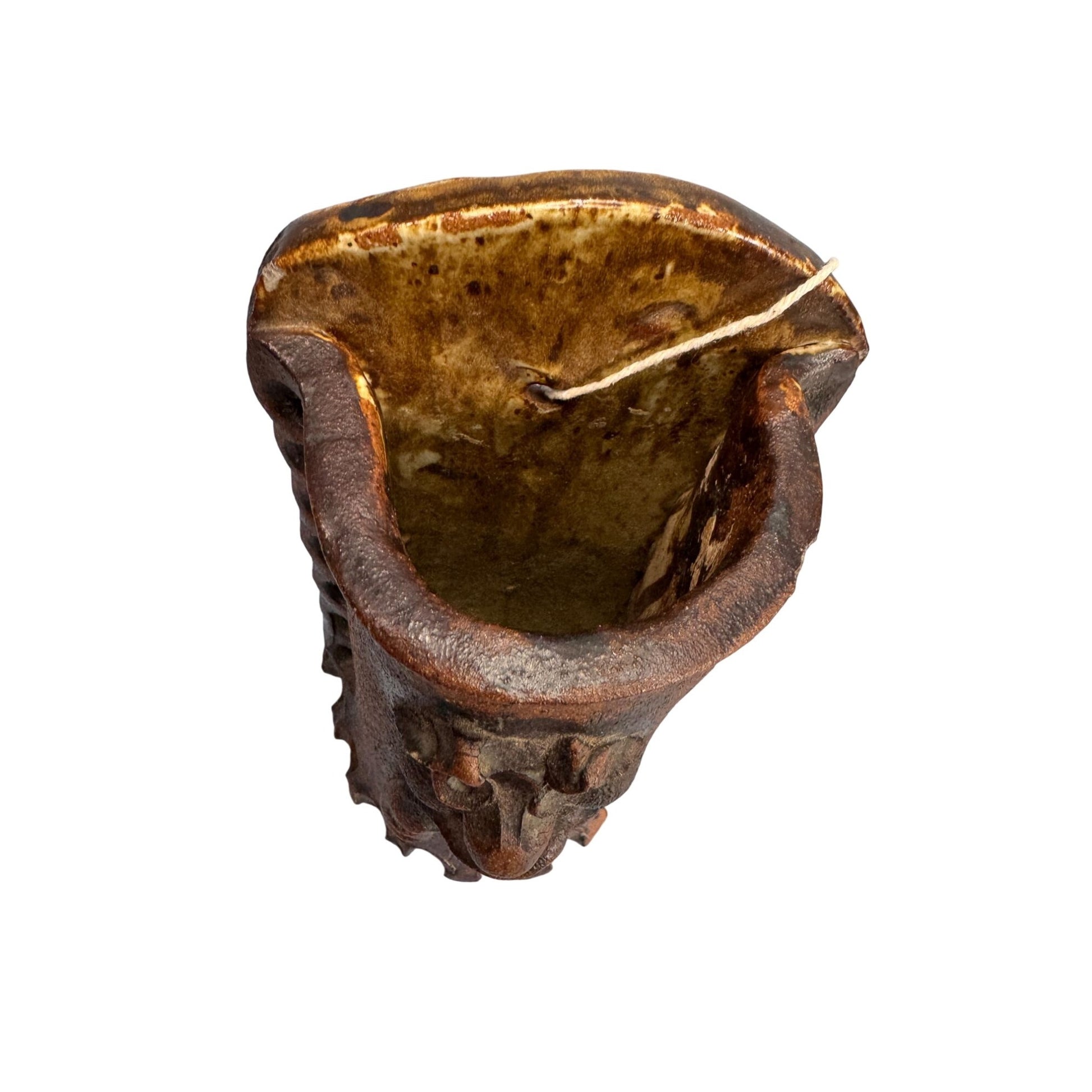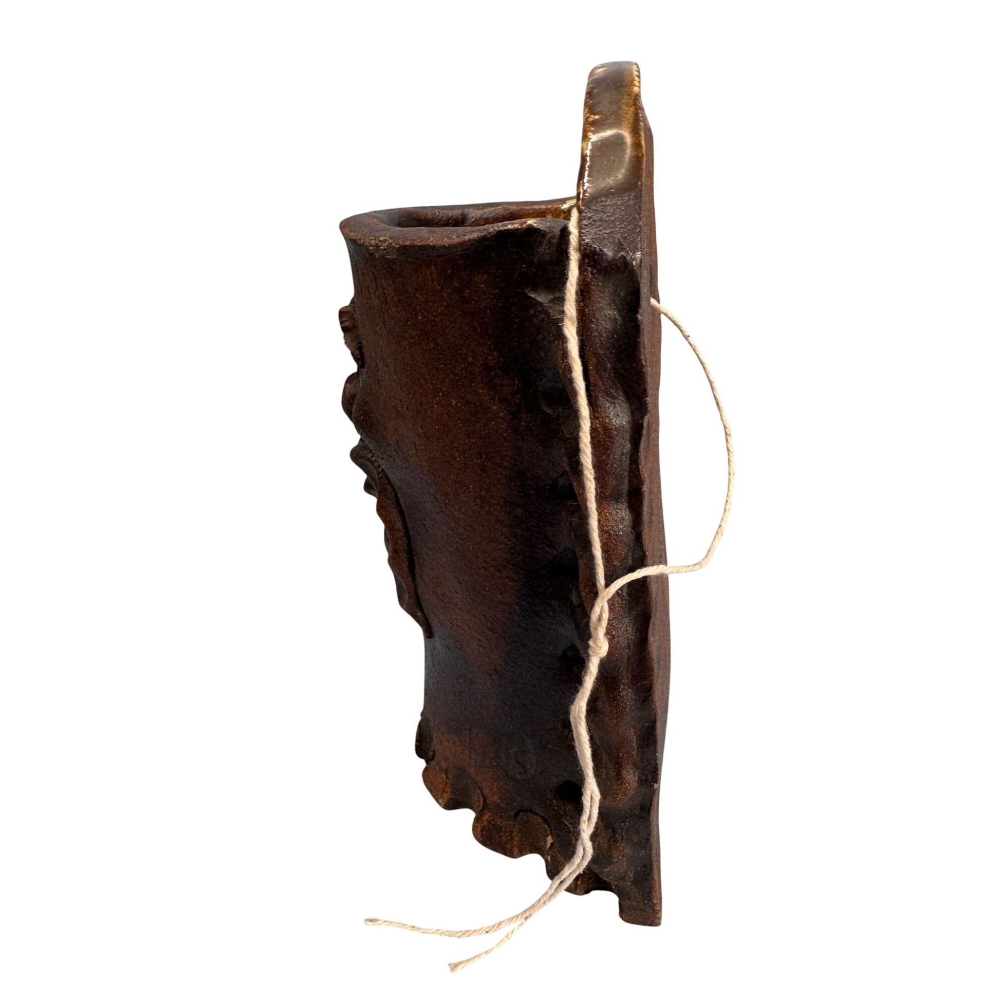 This heavy stoneware wall pocket is a one-of-a-kind piece of studio pottery, featuring a whimsical face motif in rustic brown glaze. The potter’s mark appears as “IC” (or lC) on the side, adding authenticity to this artisan folk art piece. Perfect for wall display or use with dried flowers.