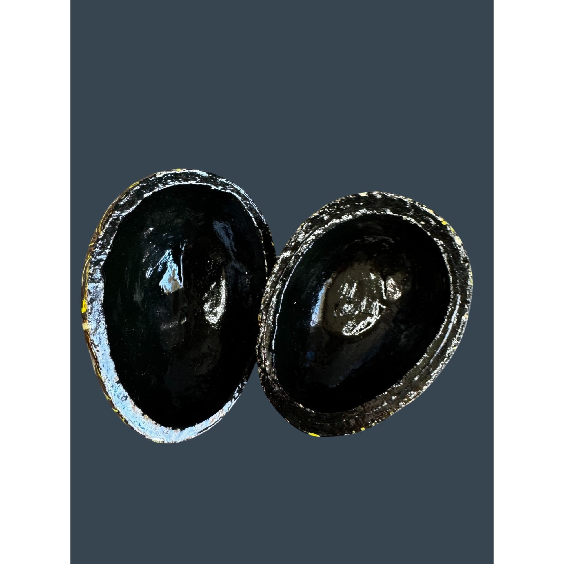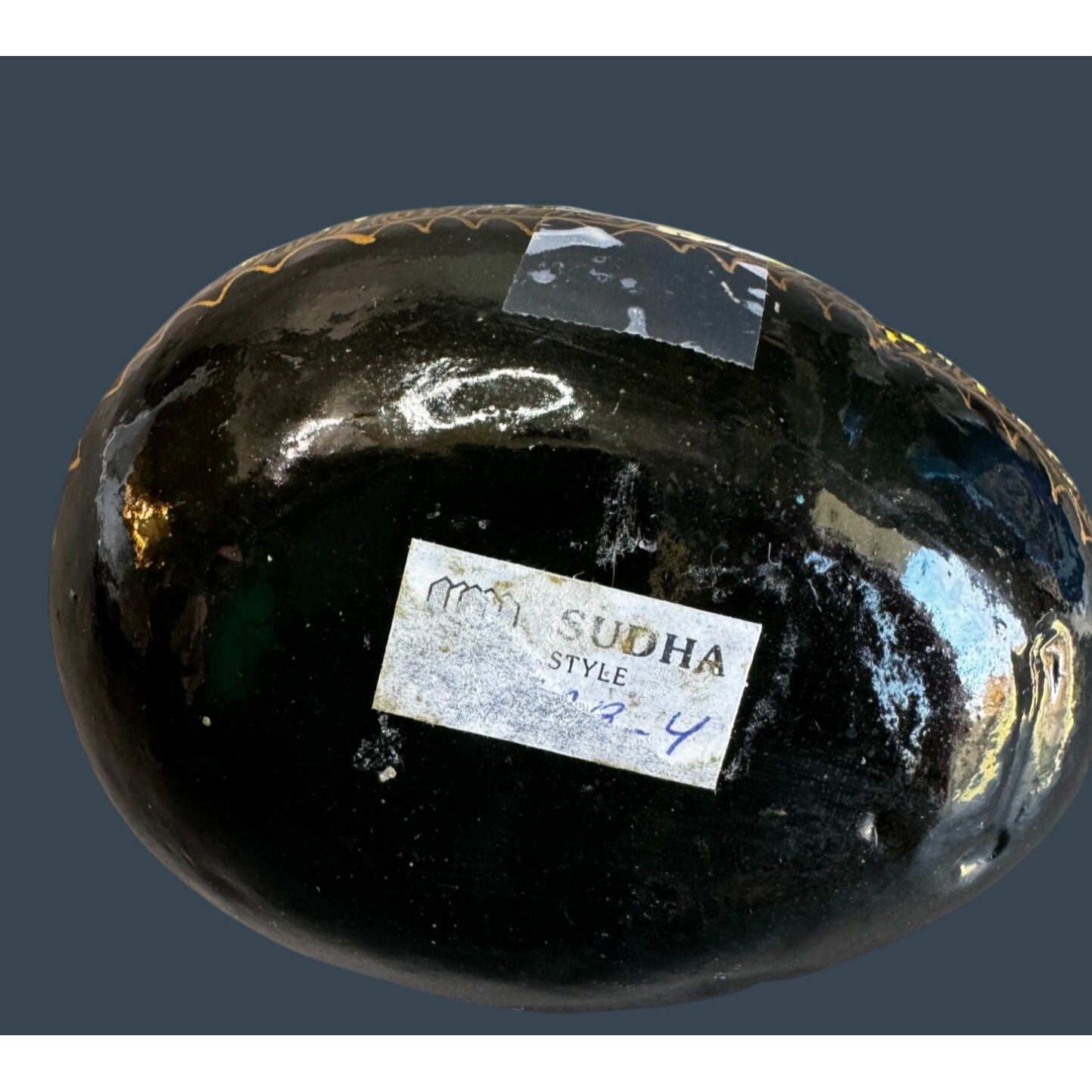 This hand-painted Sudha Style papier-mâché rabbit trinket box features vibrant floral designs, metallic gold accents, and a glossy lacquered finish. Shaped like a curled sleeping rabbit, it opens into two halves for holding small jewelry or display items. A beautifully detailed folk-art piece with bright colors and strong visual appeal.