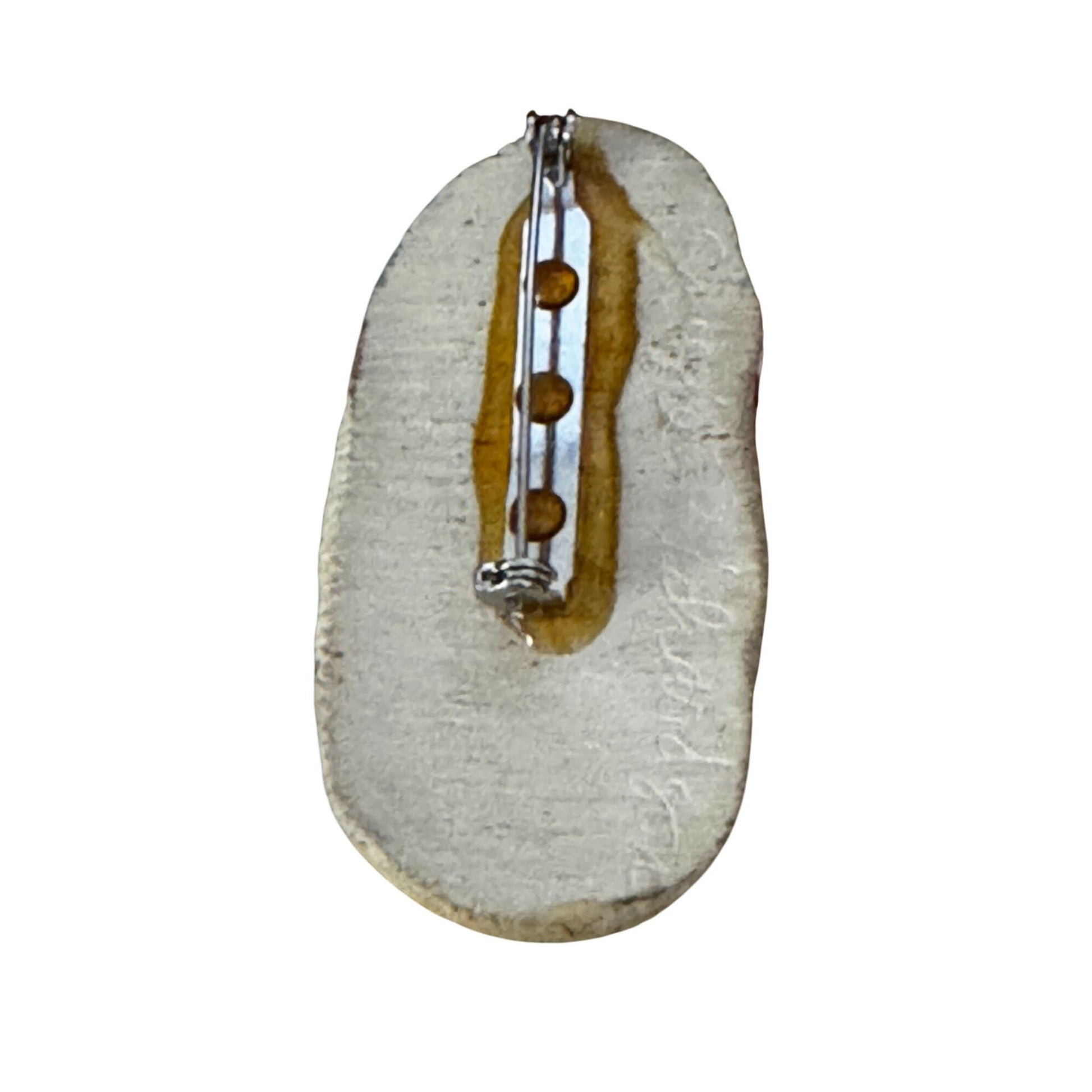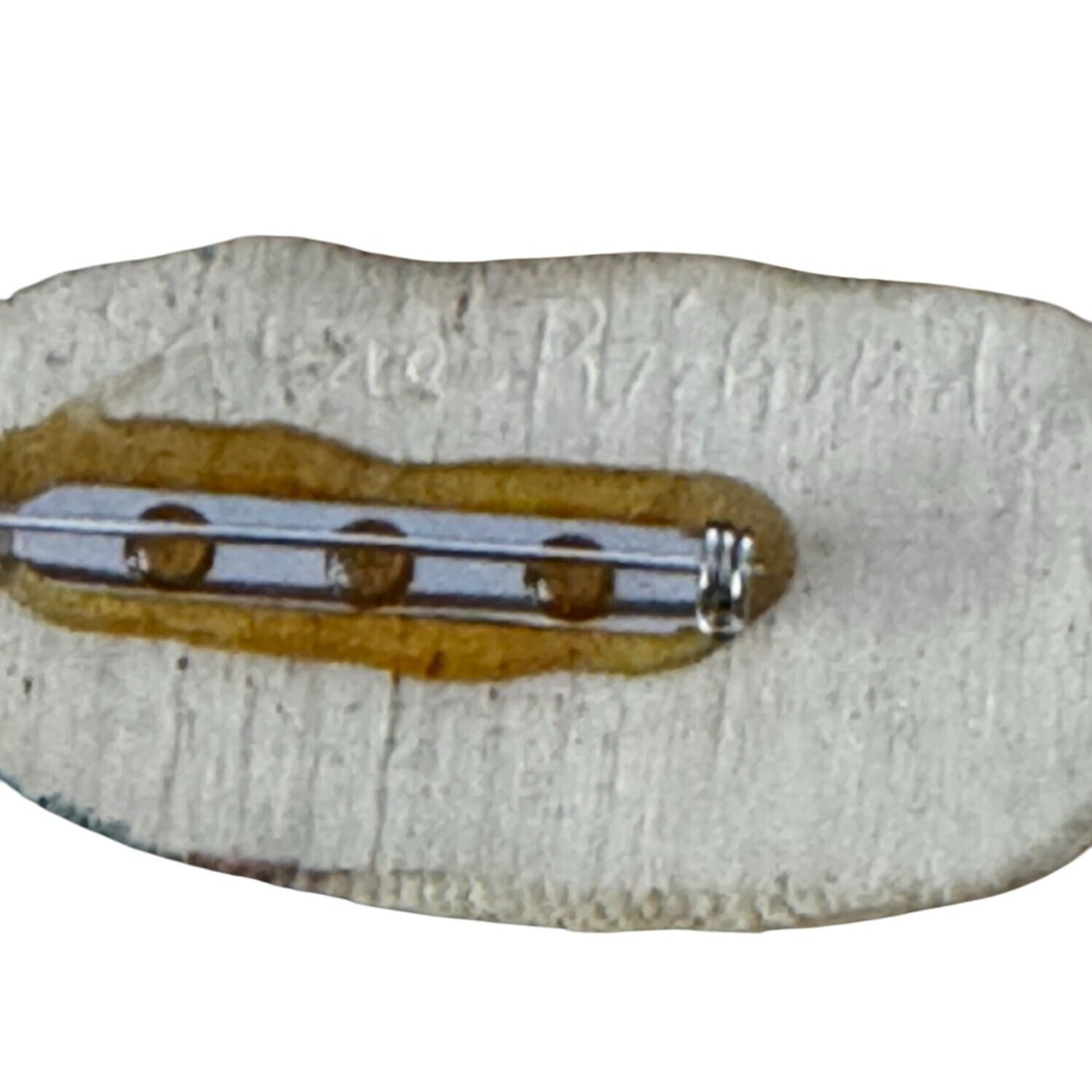 Pre-owned with minor adhesive residue near pin. Overall in good condition with no cracks. Measures approximately 2.5 inches in height.