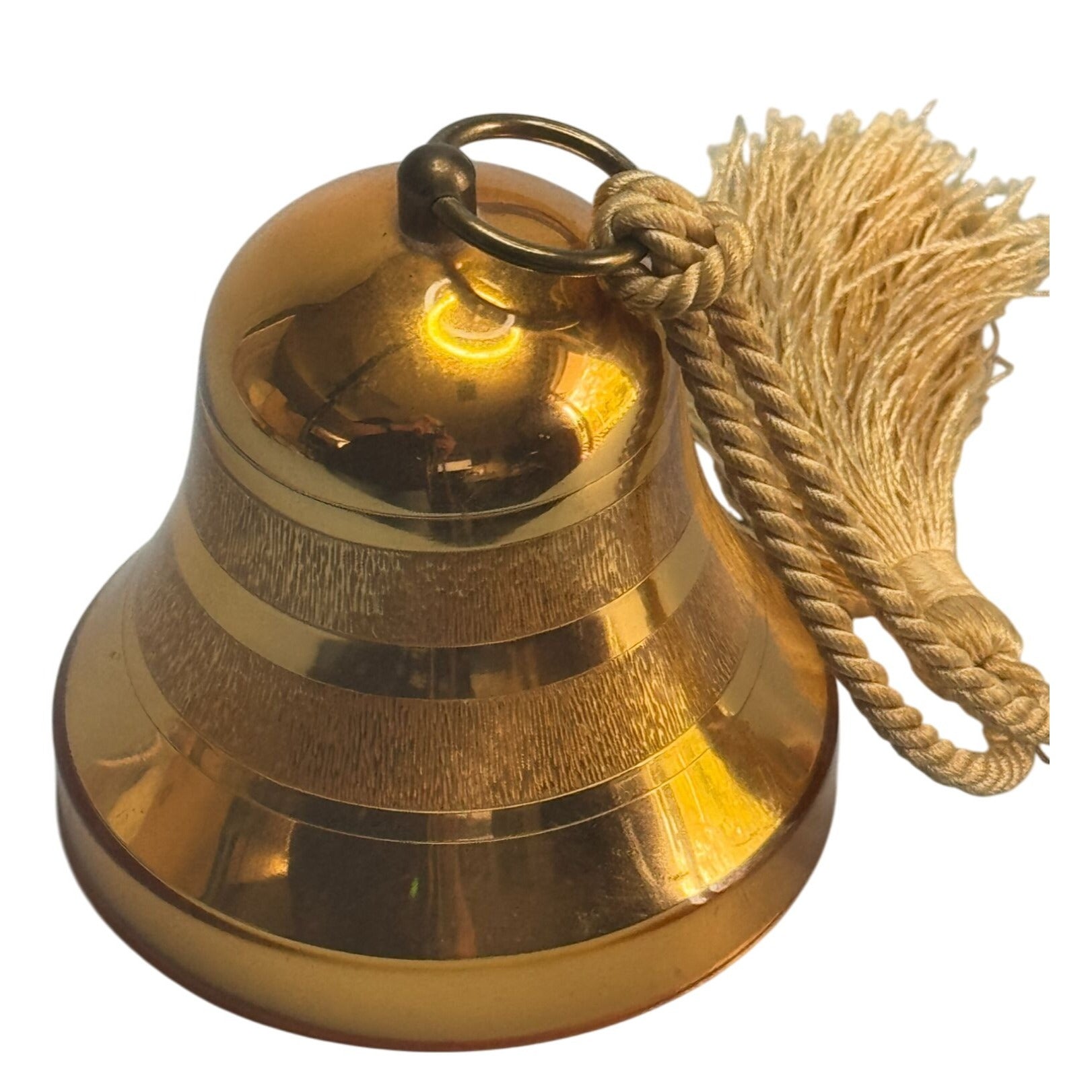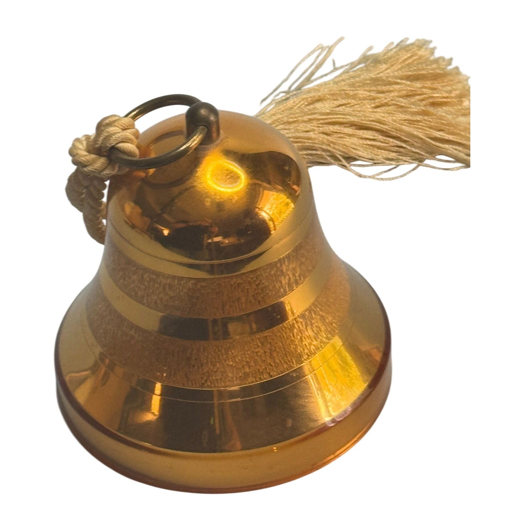 This vintage Reuge musical bell is a beautiful golden color and delivers the soothing "Anniversary Song" melody. Made in Switzerland, the bell has a charming design with engraved details and a decorative tassel, doubling as both a decorative and functional collectible. The durable brass construction ensures long-lasting beauty and resonance. The base features a winding mechanism for operation. A timeless piece that showcases quality craftsmanship and Swiss engineering.