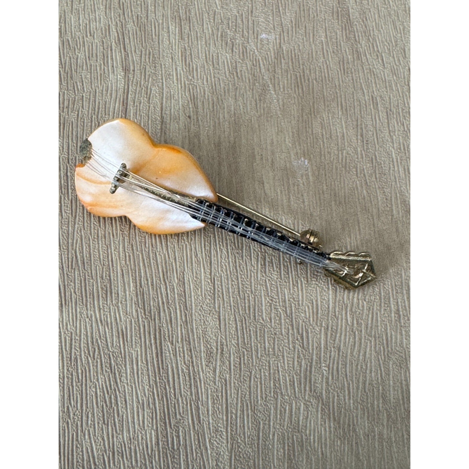 Beautiful vintage violin brooch with a shimmering abalone/mother-of-pearl look that catches the light and adds a fun musical touch to jackets, sweaters, scarves, hats, and bags. A great gift for a violinist, orchestra member, music teacher, or any lover of vintage costume jewelry.