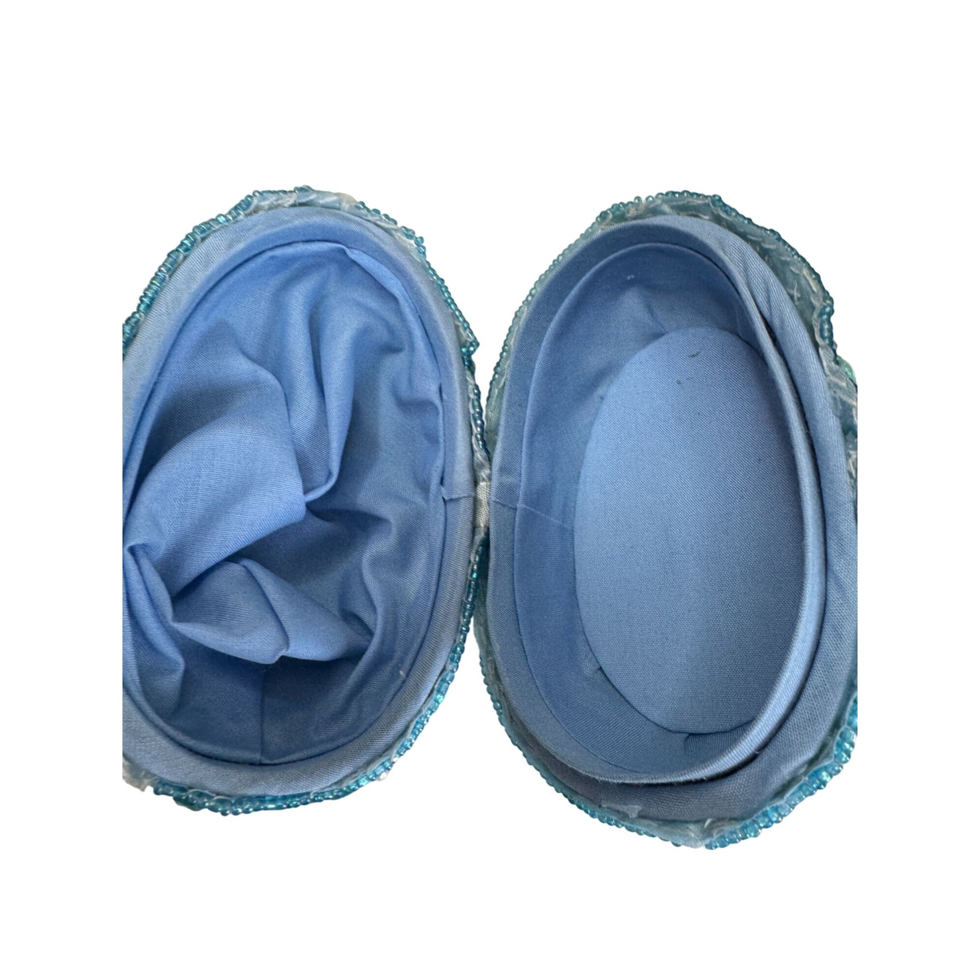 Vintage Beaded Sequin Egg Trinket Box Blue Satin Lined Jeweled 5" x 3 1/2"