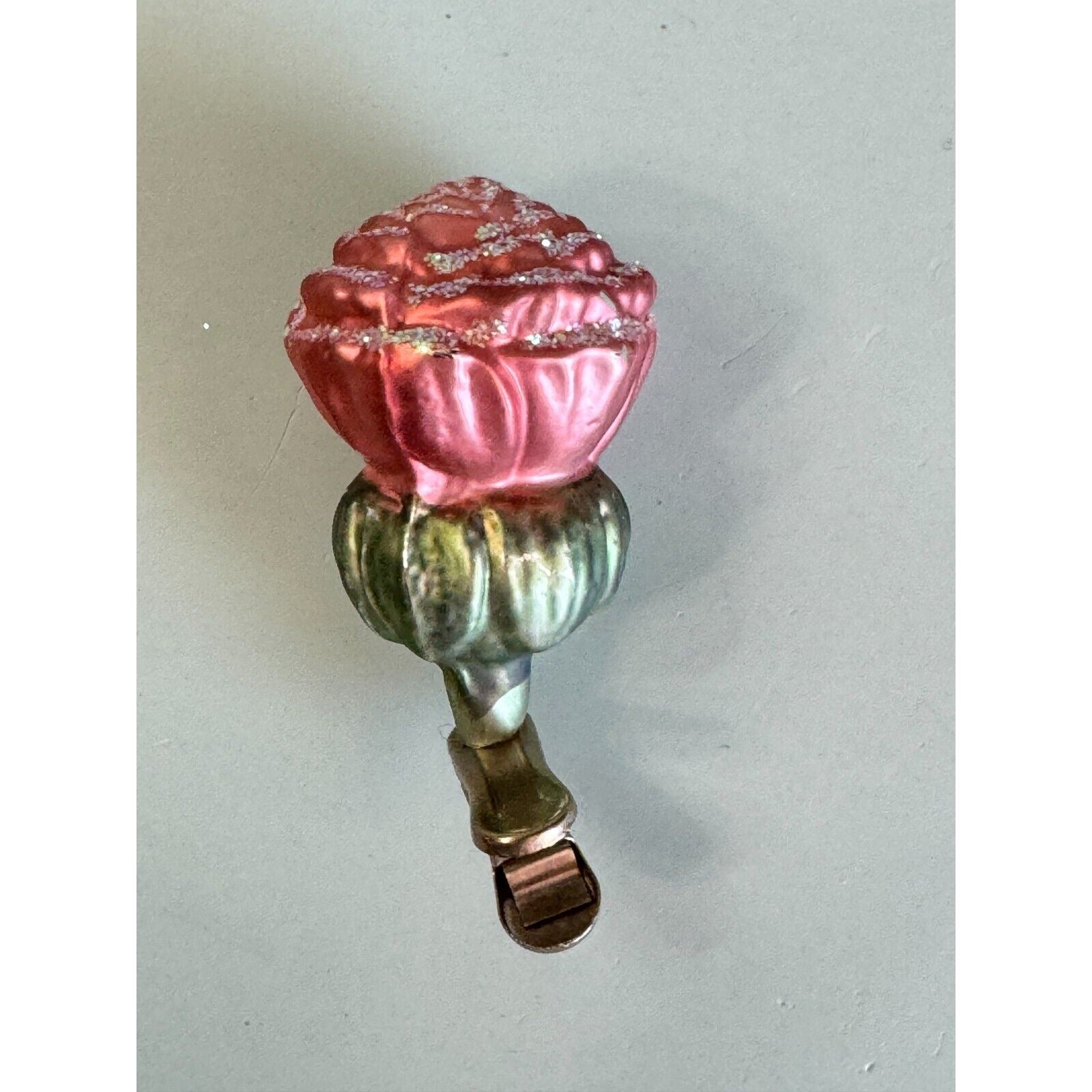 Vintage Blown Glass Rose Bud Clip On Christmas Ornament Midcentury