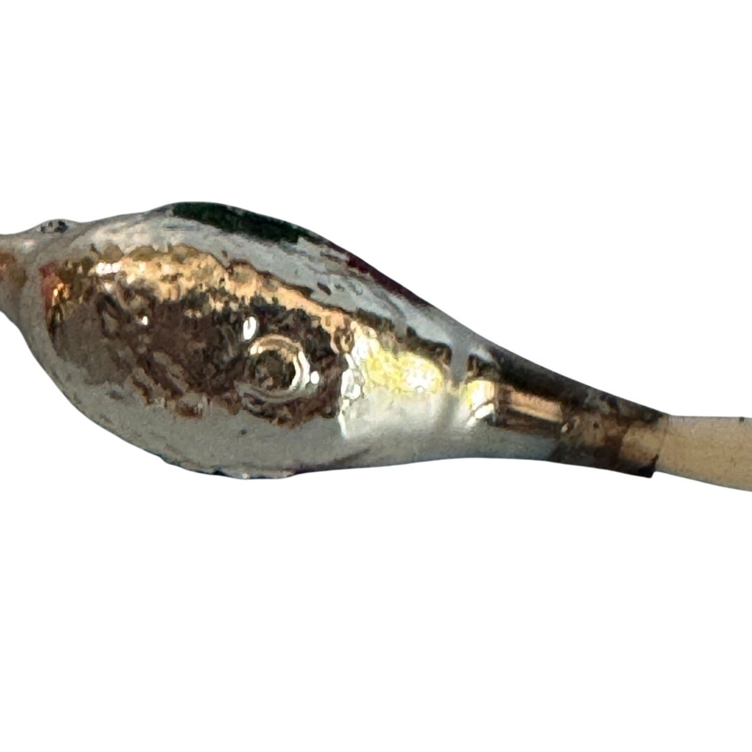 This vintage bird ornament, dating back to the 1940s-1950s, showcases stunning craftsmanship with hand-blown mercury glass. The bird features vibrant red and green accents on a silver base and has a spun glass tail for added detail. A metal loop is attached for secure hanging. This delicate ornament measures approximately 4.5 inches. A charming representation of mid-century holiday decor tradition.
