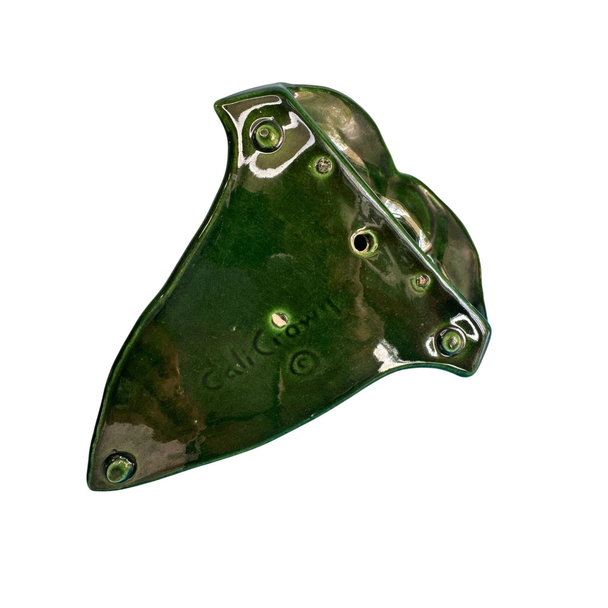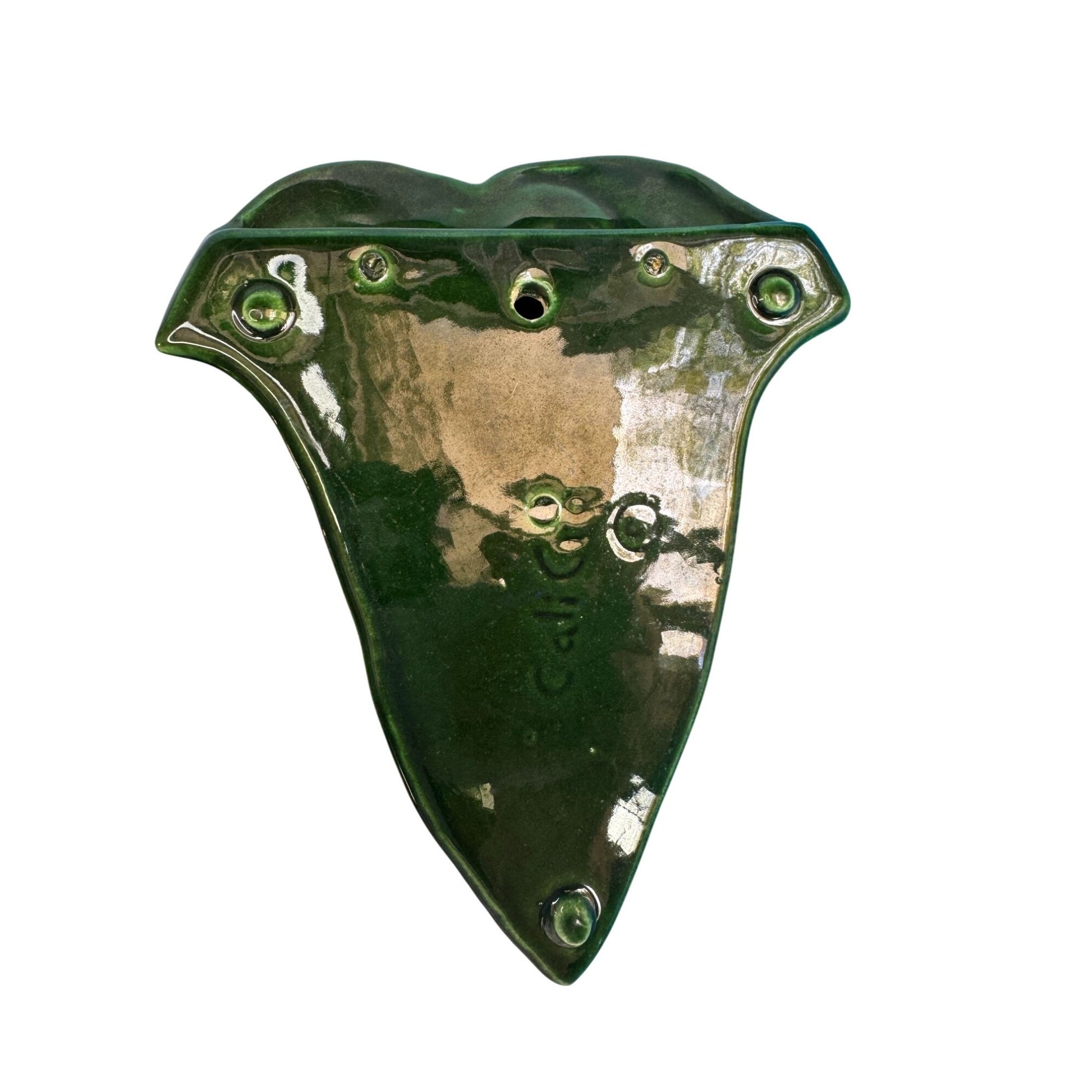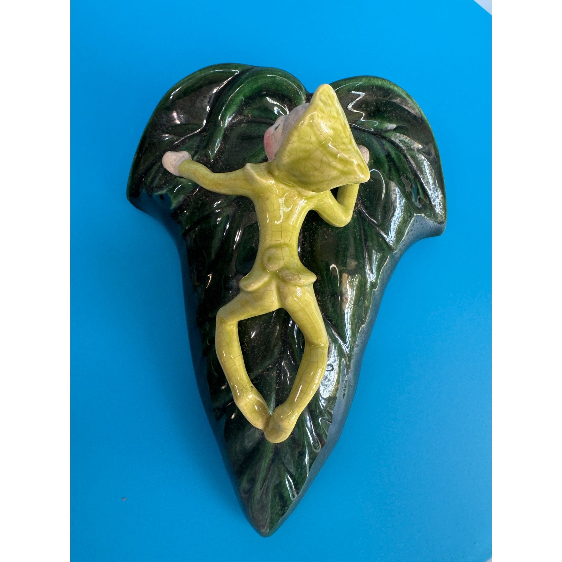This charming vintage wall pocket by Cali Crown Pottery features a playful elf climbing across a large glossy green leaf. Made in mid-century California, it combines whimsical design with vibrant glaze, making it a wonderful accent for collectors of novelty ceramics.