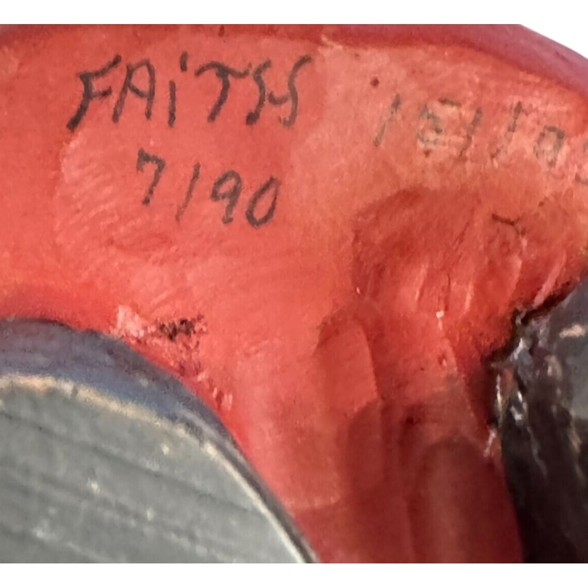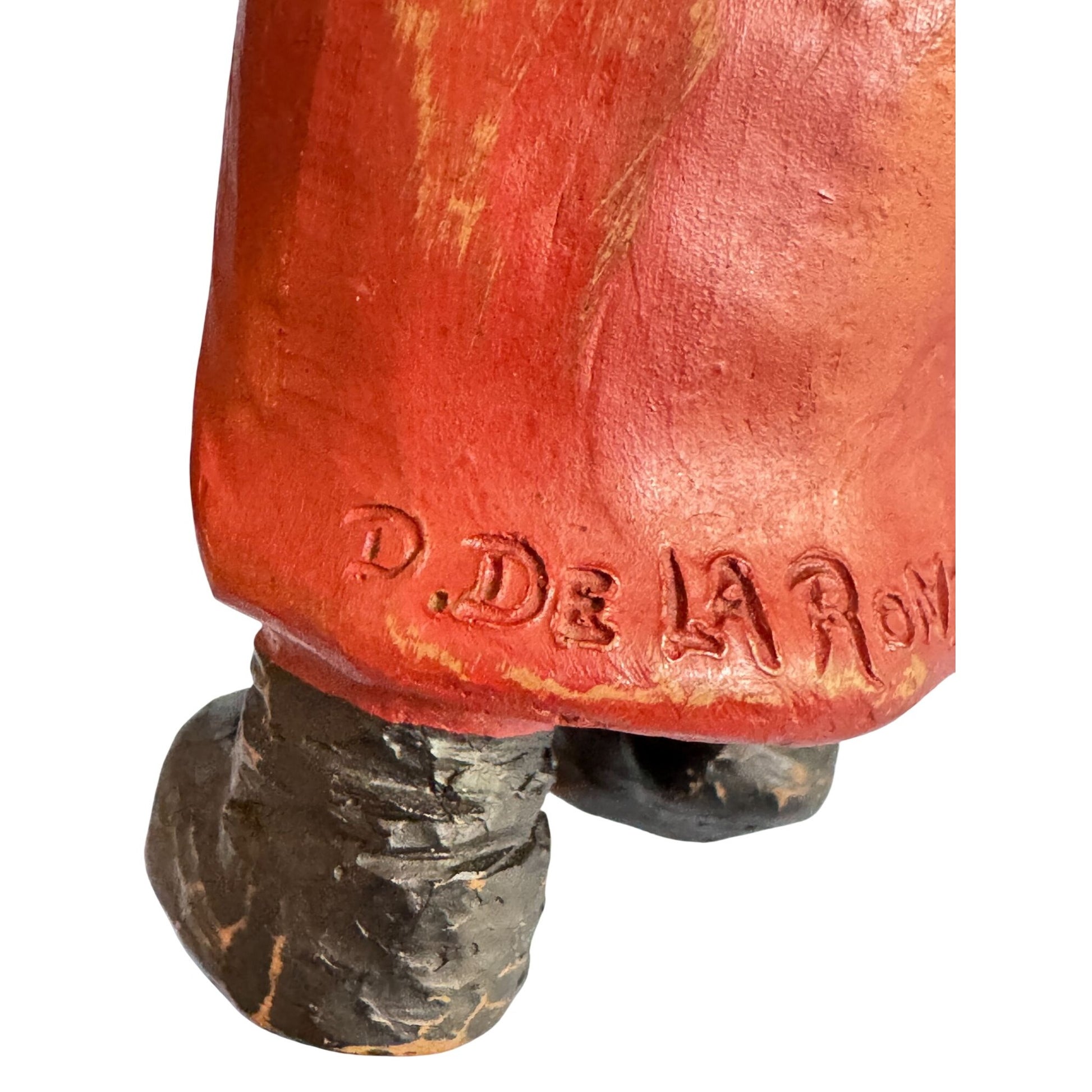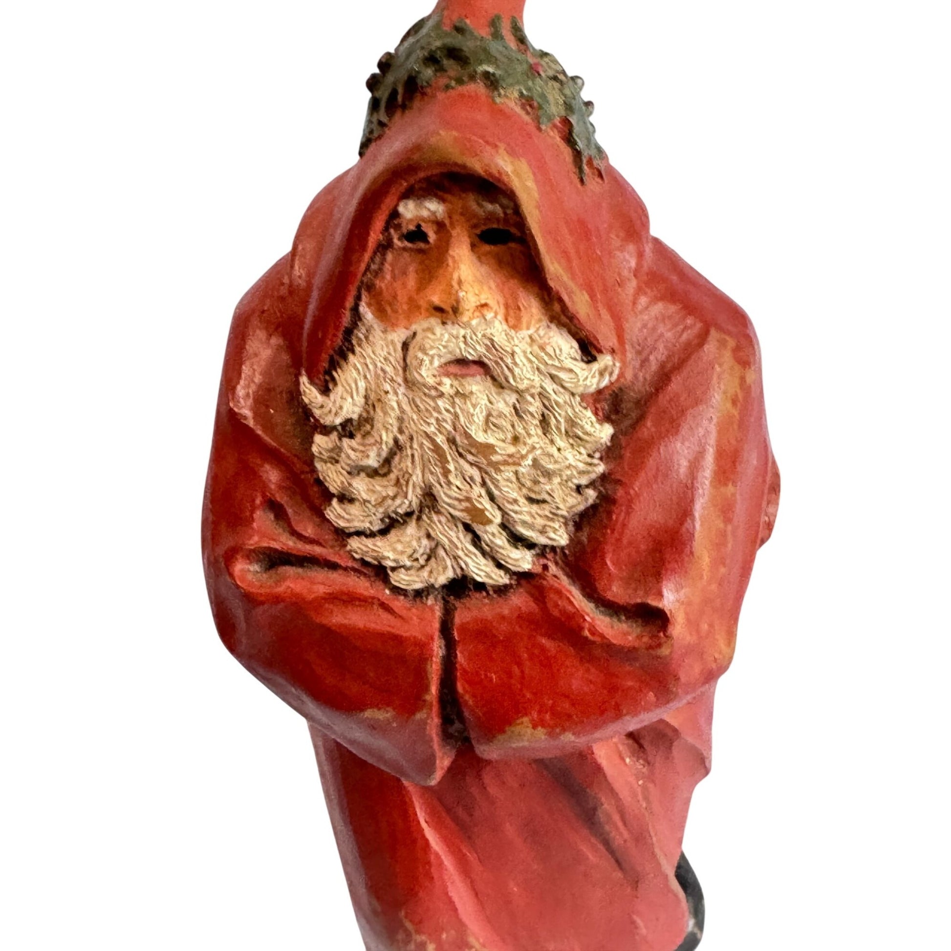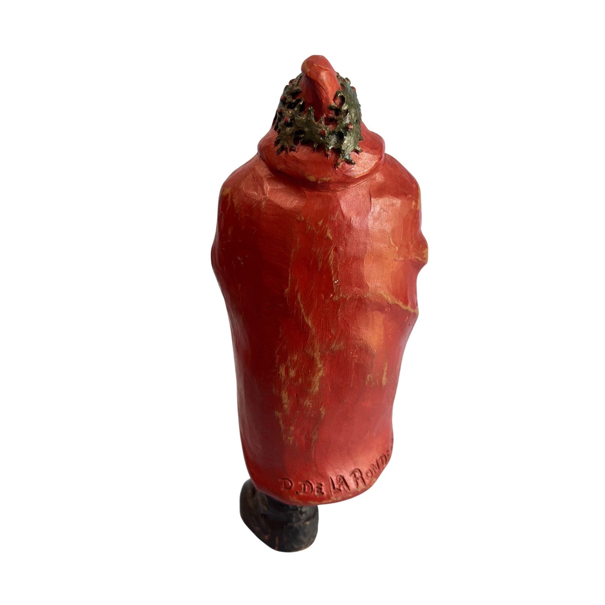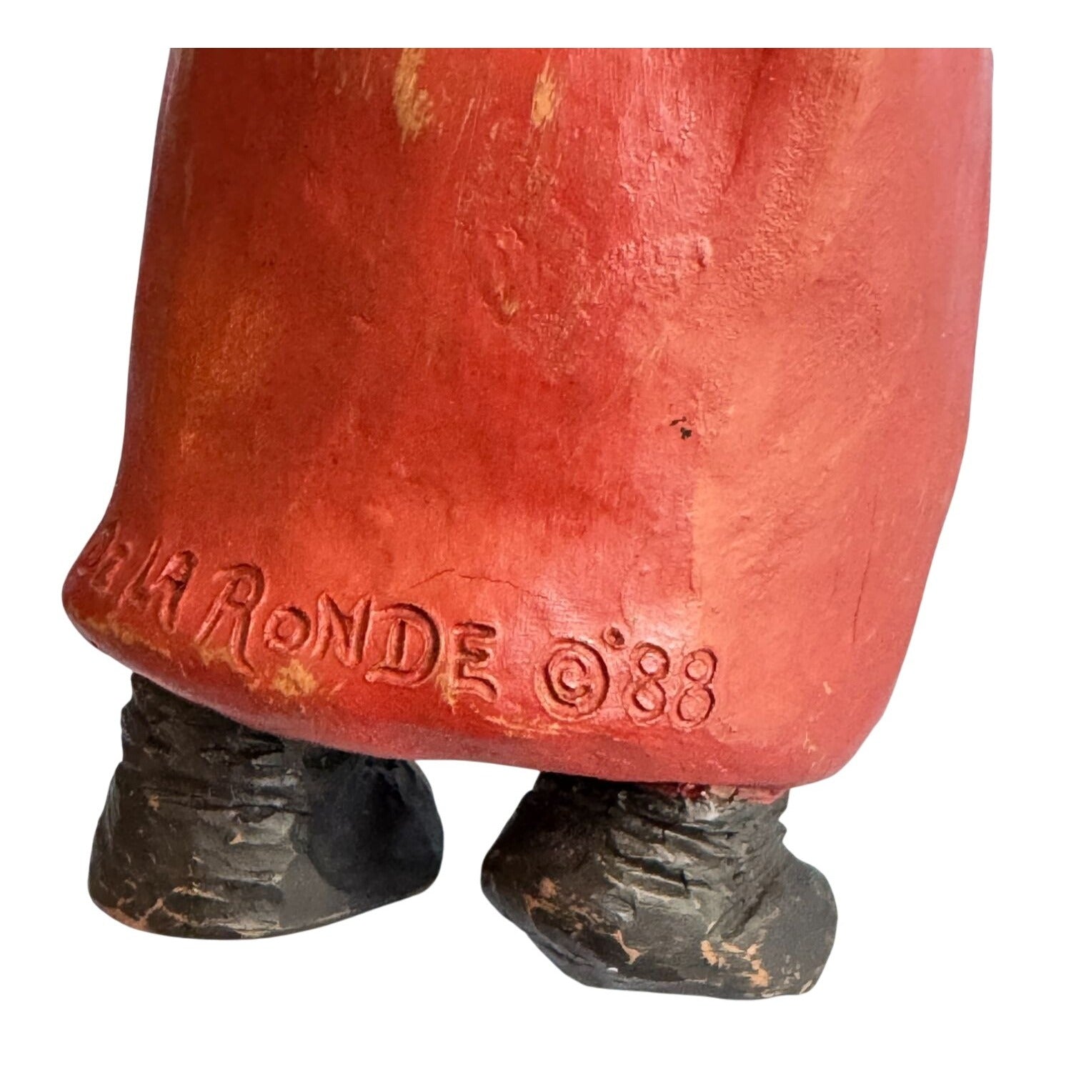 This vintage De La Ronde Santa Claus figurine is a charming hand-signed folk art piece from 1988. Standing at 7 1/8 inches tall, the figure showcases detailed craftsmanship with a red clay finish and intricate hand-painted details. The rustic texture of the robe, the sculpted beard, and the greenery accents convey a timeless and authentic aesthetic. Signed on the back by the artist, this collectible is a unique addition to any holiday or folk art collection. The sturdy clay material ensures durability, while the vintage patina adds rich character.