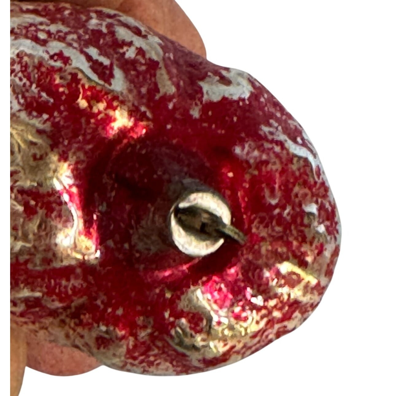 This is a vintage German glass grape cluster ornament from the 1930s–50s, measuring 3.5 inches. The hand-painted design features a striking red, green, and silver color palette, displaying the patina from age that adds a charming vintage appeal. Its intricate details and metallic accents speak to the quality of mid-century craftsmanship, making it a distinguished addition to holiday decor or a collector’s display.