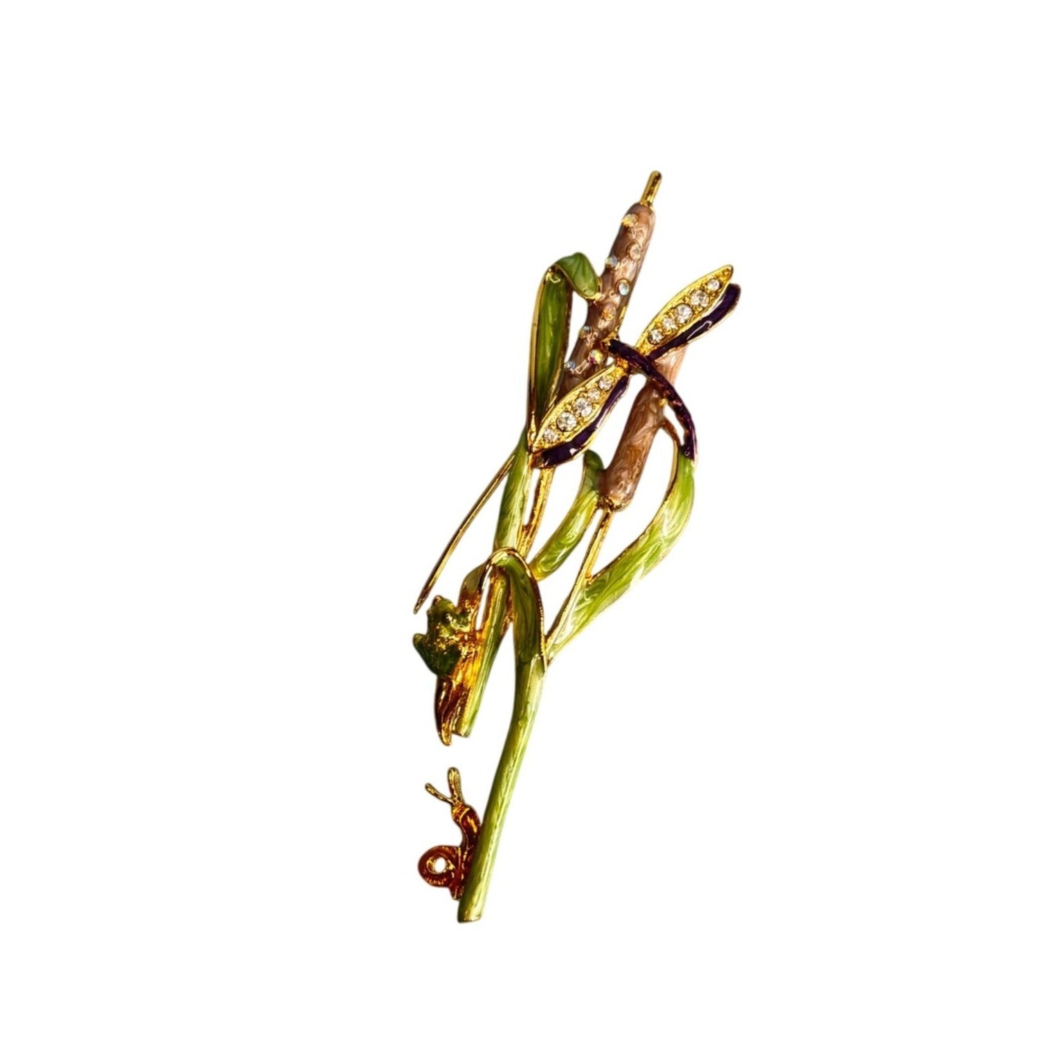 This brooch tells a delicate story of nature's beauty, featuring a cattail adorned with a dragonfly, frog, and snail. Its vibrant enamel, gleaming crystals, and golden tones add enchanting charm to any collection or outfit. A timeless piece for nature lovers and vintage enthusiasts alike.